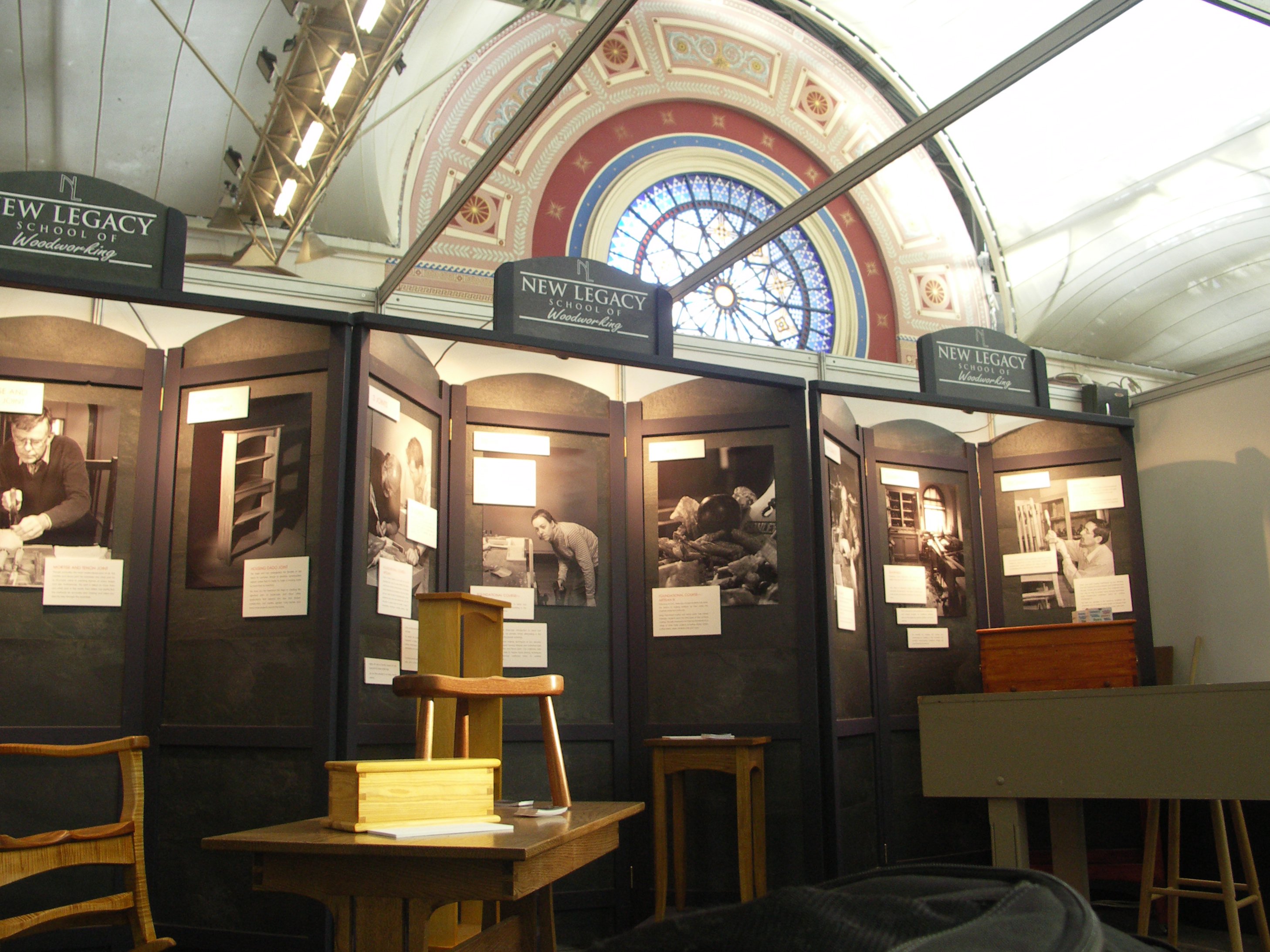 Here's how the new booth looks and that's John Winter fixing the New Legacy signs in place. It has been great working with John who is so meticulously detailed. I would like ten more Johns to work with. Imagine what I could do with ten people with a desire to be furniture makers!
