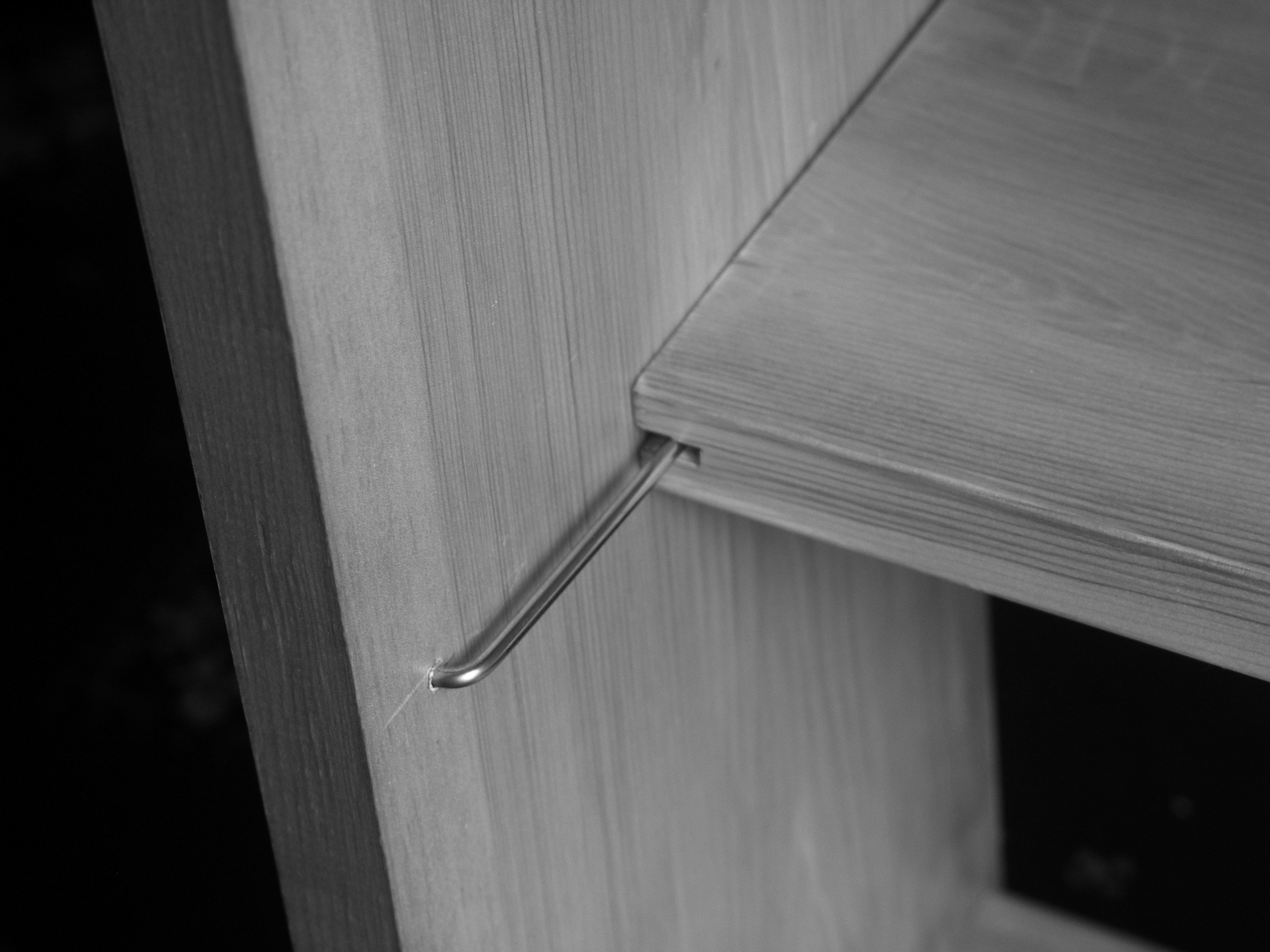 Beyond the seamless exterior appearance, the intermediate shelves are fully adjustable, but the adjustment is hidden in a groove within the shelf ends. This 'bracket' is made from a coppered steel welding rod that I bent the ends of to fit into corresponding holes that can be placed wherever you want them. The bookcase spacings on mine are for books, which also correspond to DVD cases too. I have always loved to work in pine and laso like the look of it and though this pine was a clear-grade European redwood pine, oak, walnut or cherry would work just as well if you wanted a hardwood unit.
