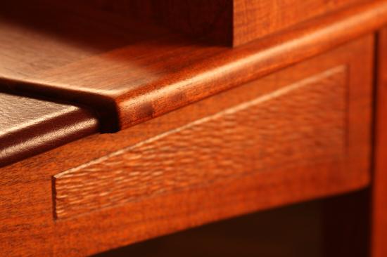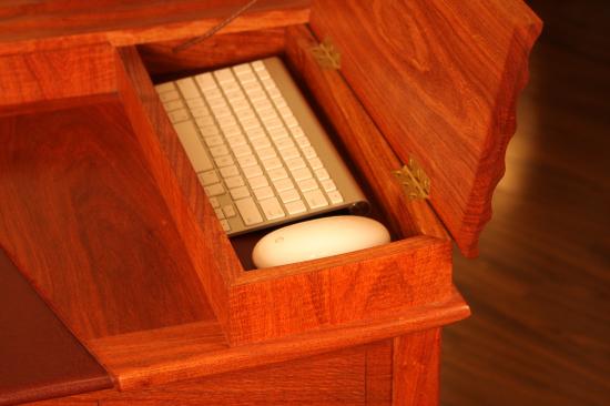 The computer and micro-chip, keyboard and flat screen have no place in the working of the wood I love. I leave those outside of my working sphere. New woodworkers have no such problems I suppose. Here's a desk I designed for a laptop. I create pods for other people for other tasks and for other creative tasks and the environs people work in. They are inspired pieces that will hopefully inspire other crafters and artisans.