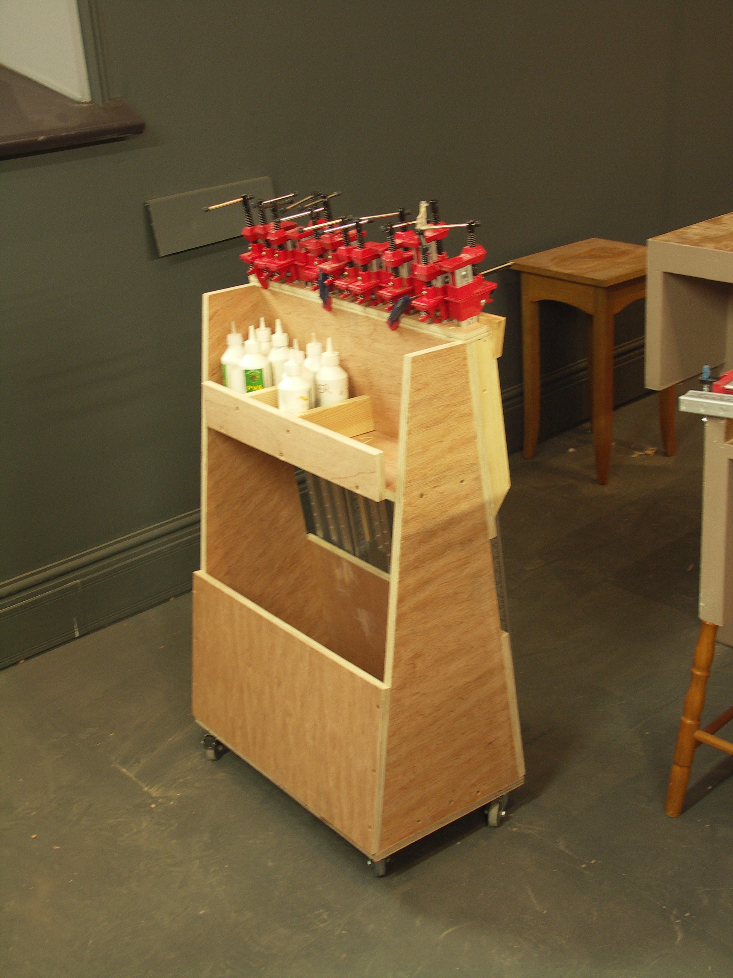 Today I worked on building a new clamp stand that I could roll around to the benches and this one holds 36 of my alluminium clamps neatly and safely in place. I also built in a lower bin for 'C' clamps and a shelf for a dozen glue bottles and sandpaper. This will help to keep order during woodworking classes and hands-on workshops.
