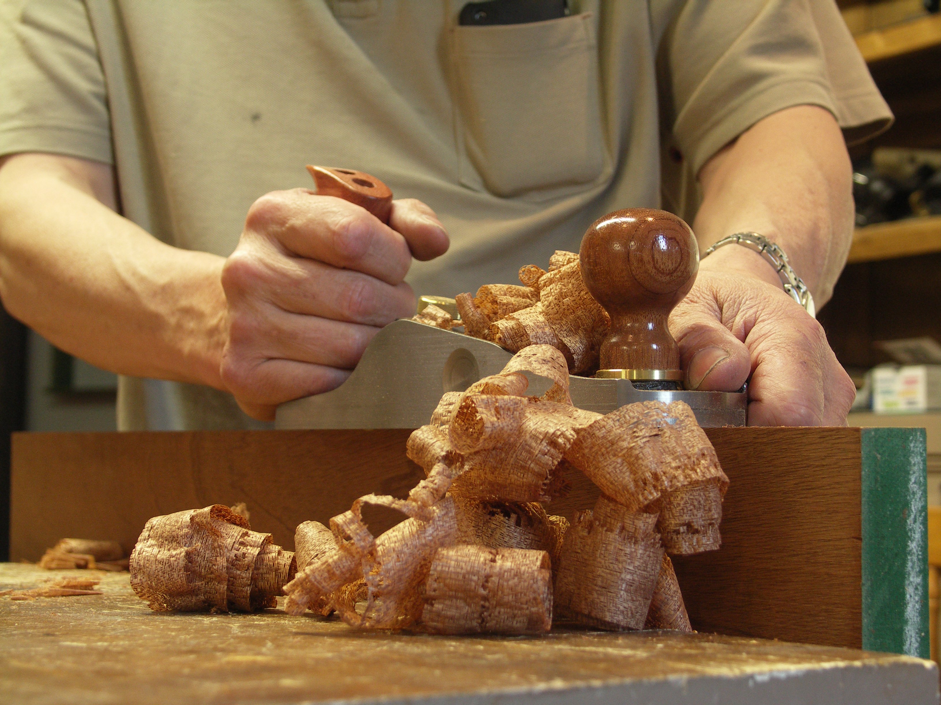 Planing the oak takes a little time. We plane to remove the ugly planer marks left from machines and because it's so much more pleasant than using orbital sanders and belt sanders. Surface hand planing takes only a few minutes and then I go straight to P 240-grit paper immediately to 'roughen' my surface from the plane so that the surface has 'tooth' to accept the finish. How wild is that. 'We sand rough.' You see, because we hone to 15,000-grit, the surface of the wood is supersmooth already, so smooth it doesn't take the finish the same. Imagine that.