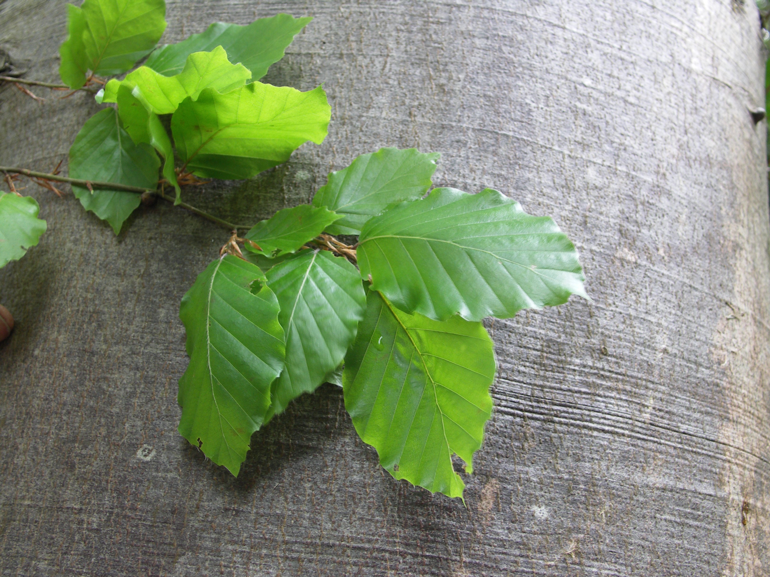 Beech leaves against the smooth silver grey of the beech tree trunk