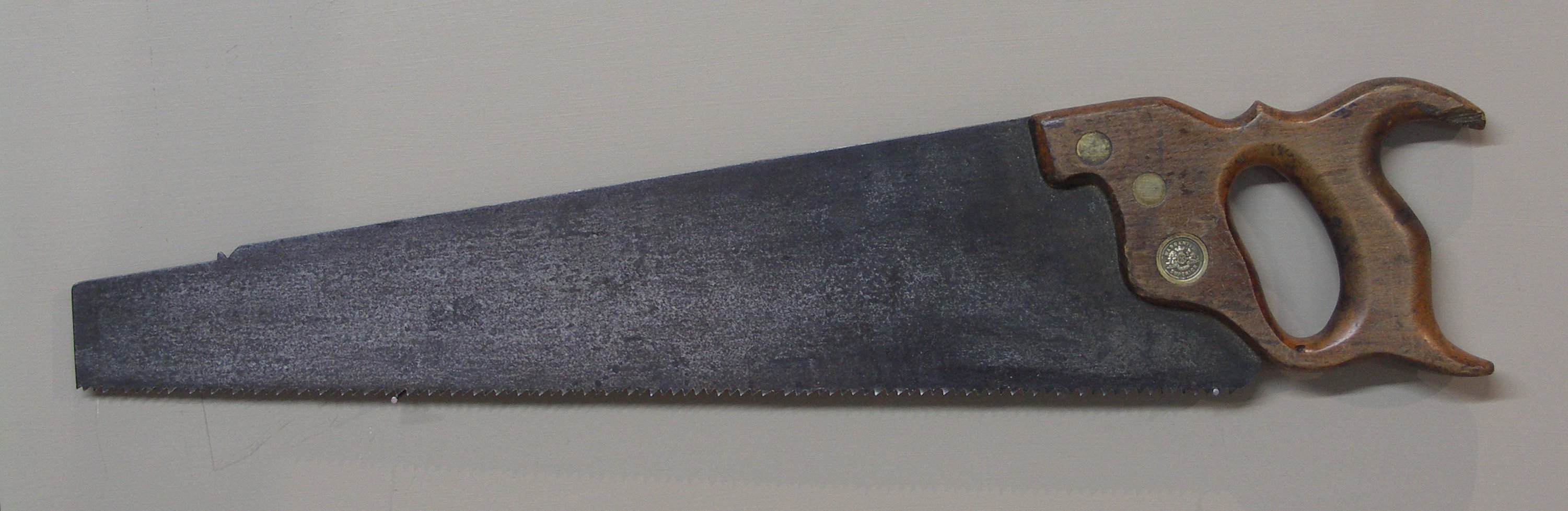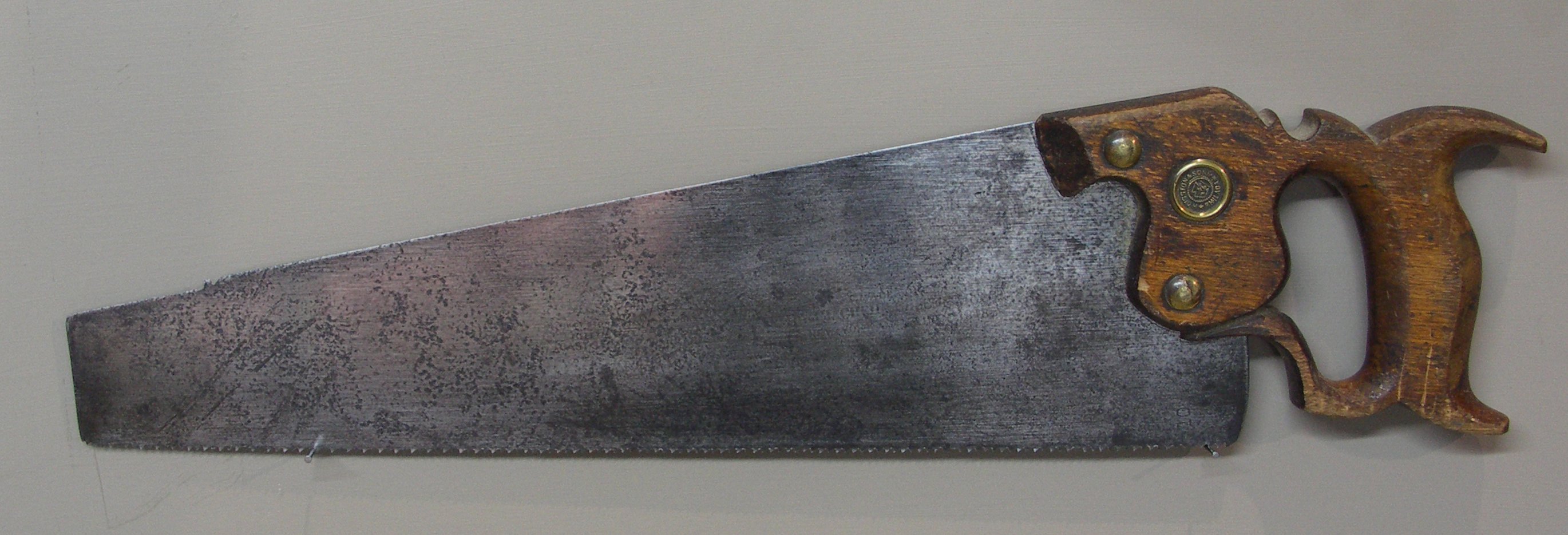 But look at this. This is a Disston saw. Look at the handle, the shape fits a man's hand like the hand inside a glove. This saw was made to celebrate an event for Hammacher Schlemmer in New York in 1848.
