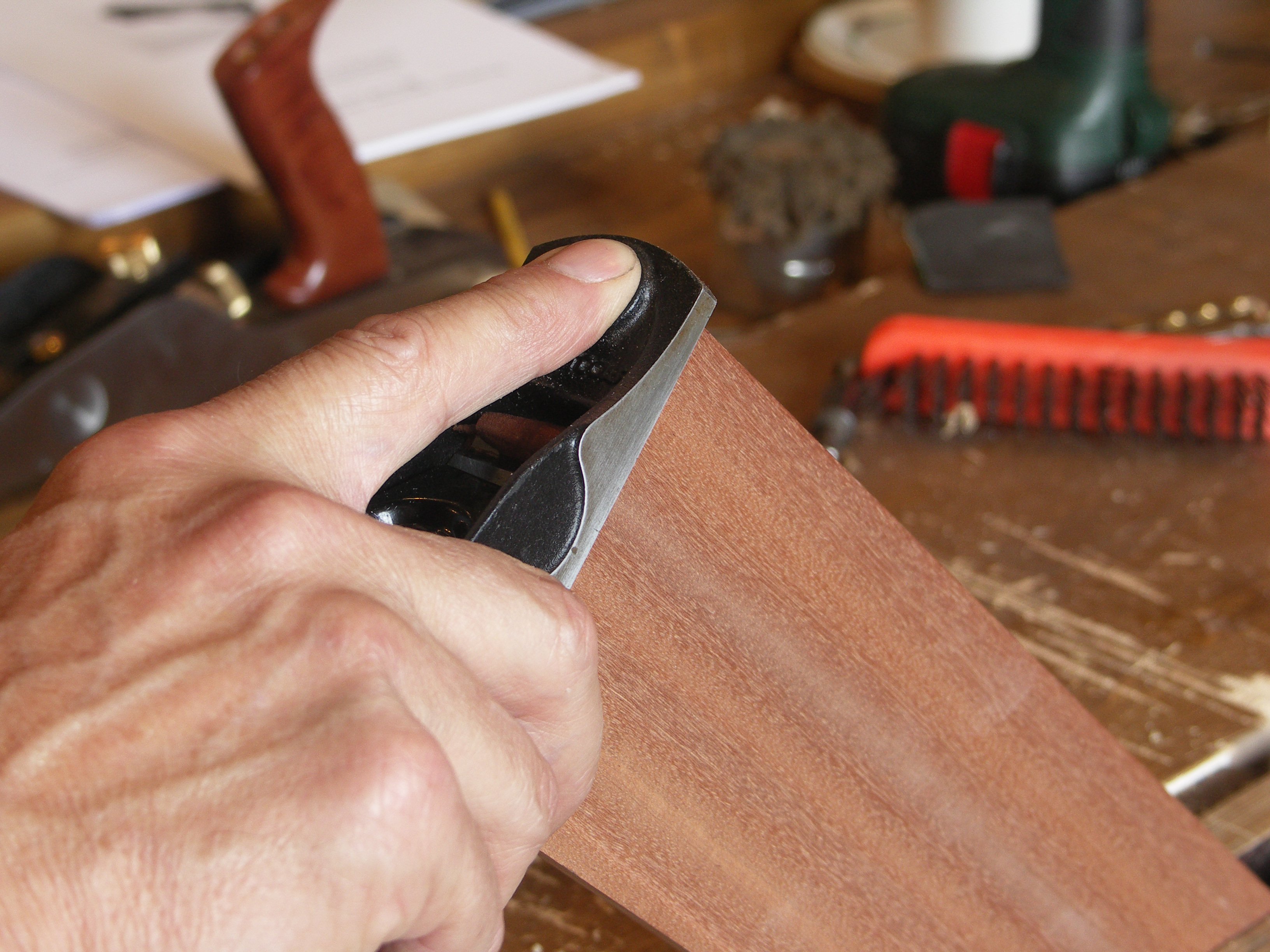 Many people ask me about block planes. No, not the 8" wooden coffin smoothing planes of old, but the more modern versions with the bevel up cutting iron and fine adjustment wheels that set the iron so precisely. (Pics coming soon) I find students often buy the block plane as a first plane, before they buy the bigger smoothing plane. They think that this is a more manageable plane because of its single-handed use and its compact size. In actuality, this plane is not a smoothing plane so much as a trimming, easing, end-grain planing plane and we seldom if ever use it for surface smoothing as such, though we do use it for edge planing on narrow boards.
