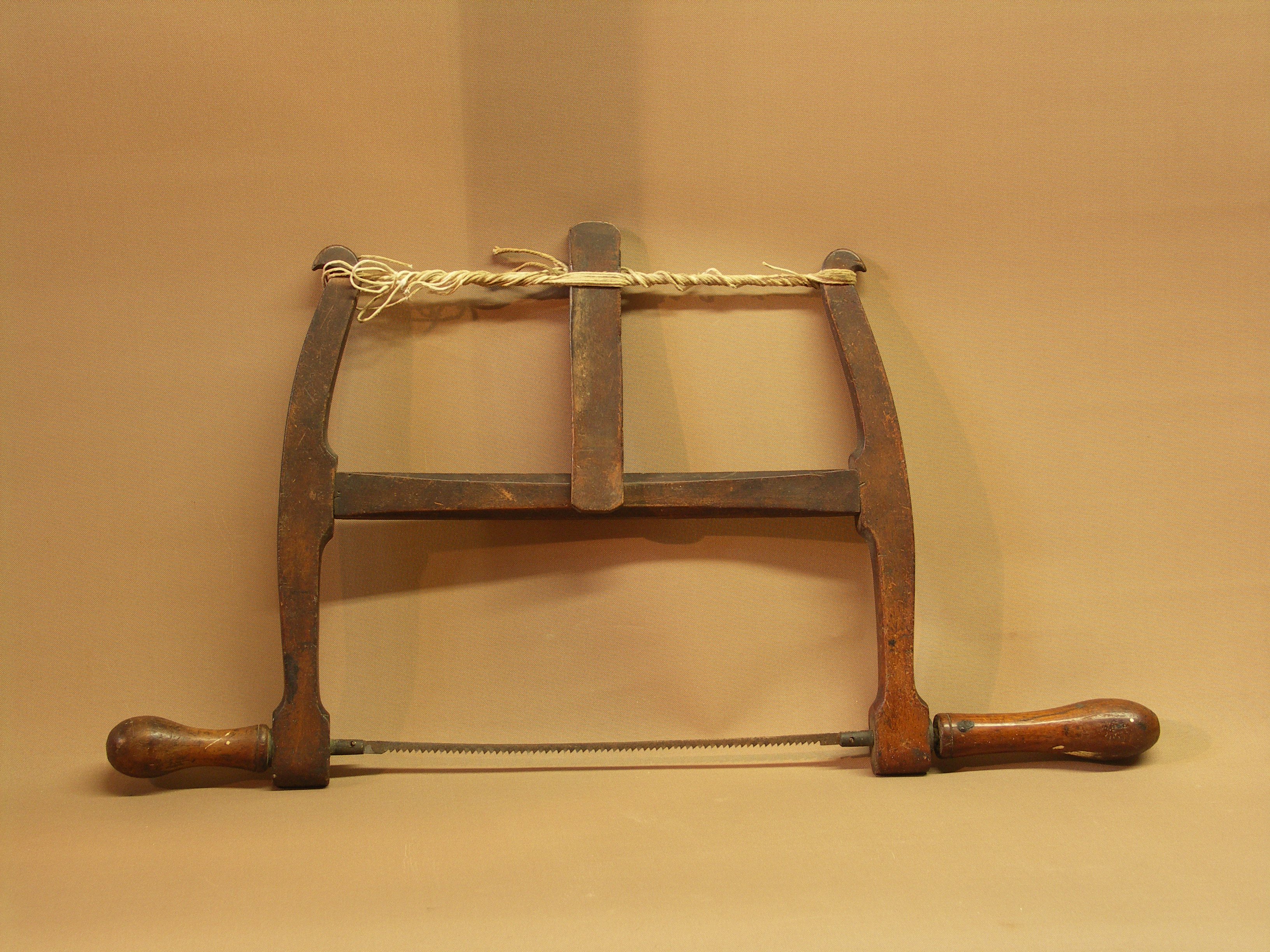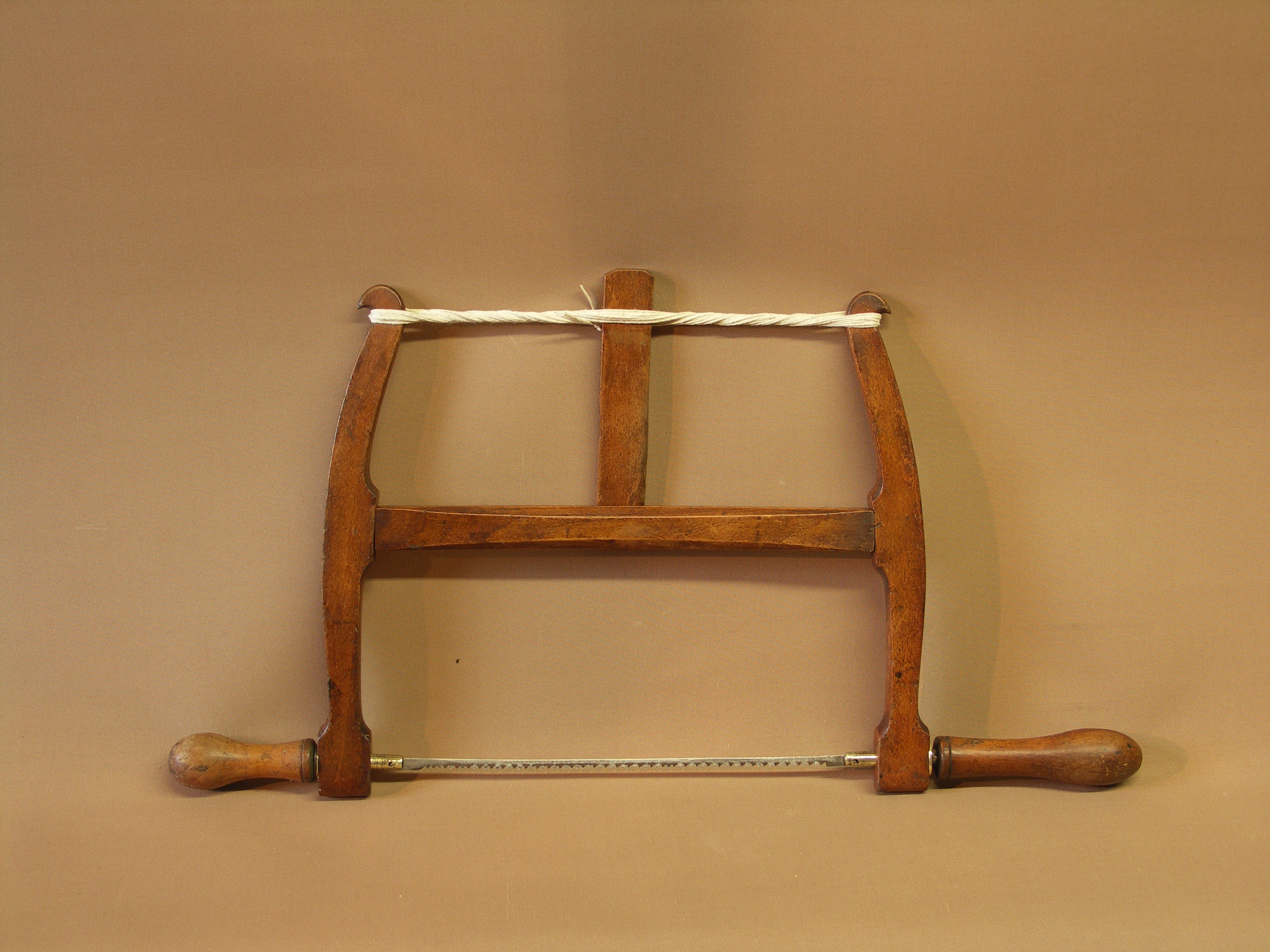 I don’t think many know the origin of the bow saw. By that I mean the first date a man bent the sapling stem of new growth to stretch a steel saw blade between two extremes. My gut feeling is that the stem was already bent in growth, as a bowed branch if you will, and he took advantage of the continuous grain in the curve to add further tension by adding a little more bend. Not unlike saws like this but with only one bend instead of one at each end. Today we use the natural memory in steel to add the same type of pressure in bow saws such as logging, coping and fret saws. Between the two extremes of bent wood saws and bent tubular steel ones we find the jointed frame. Several names are acceptably applied to this saw tool type including bow, frame, Swede, buck and, if the handles allow for turning the blade in the cut, turning saws.