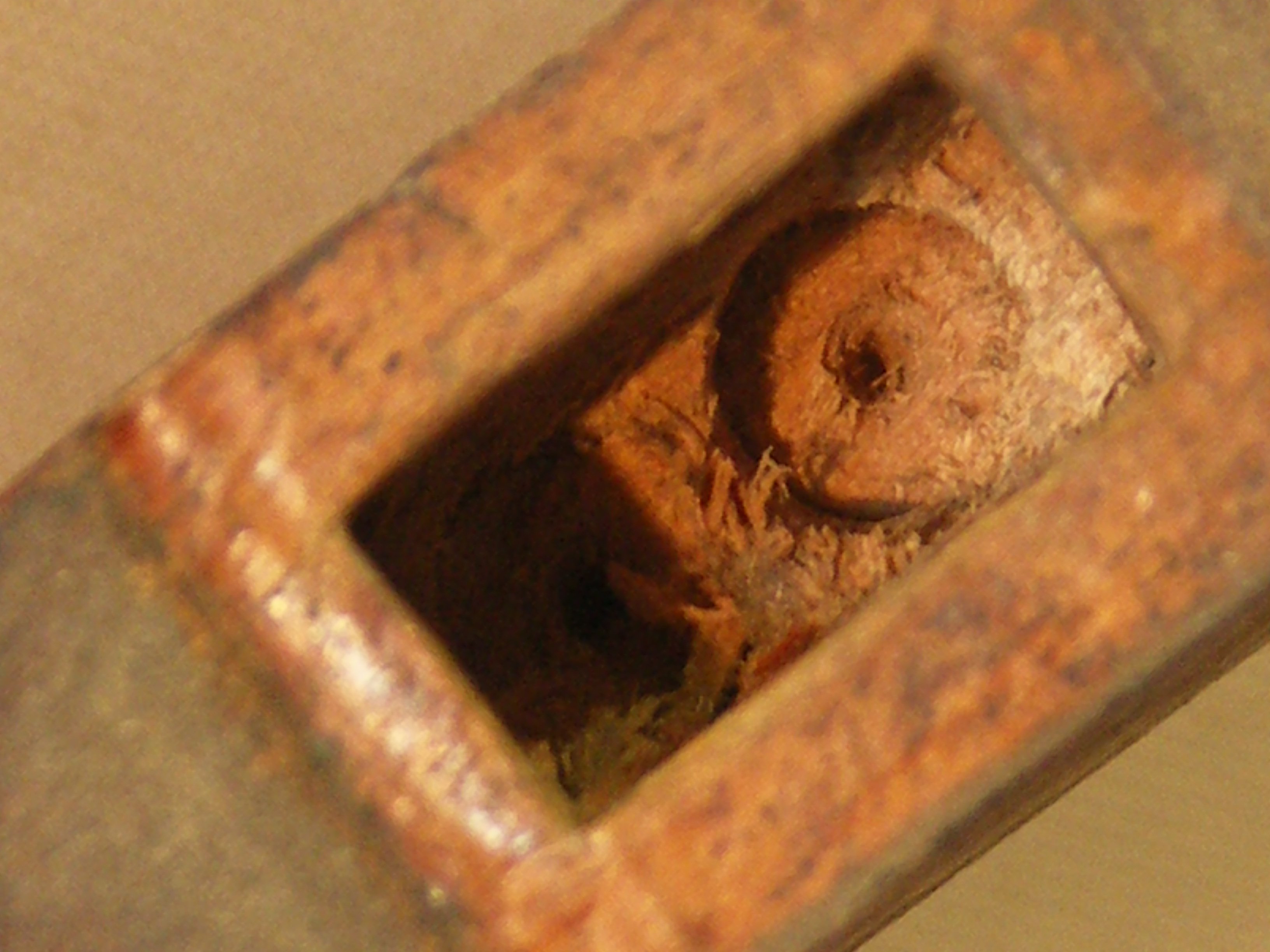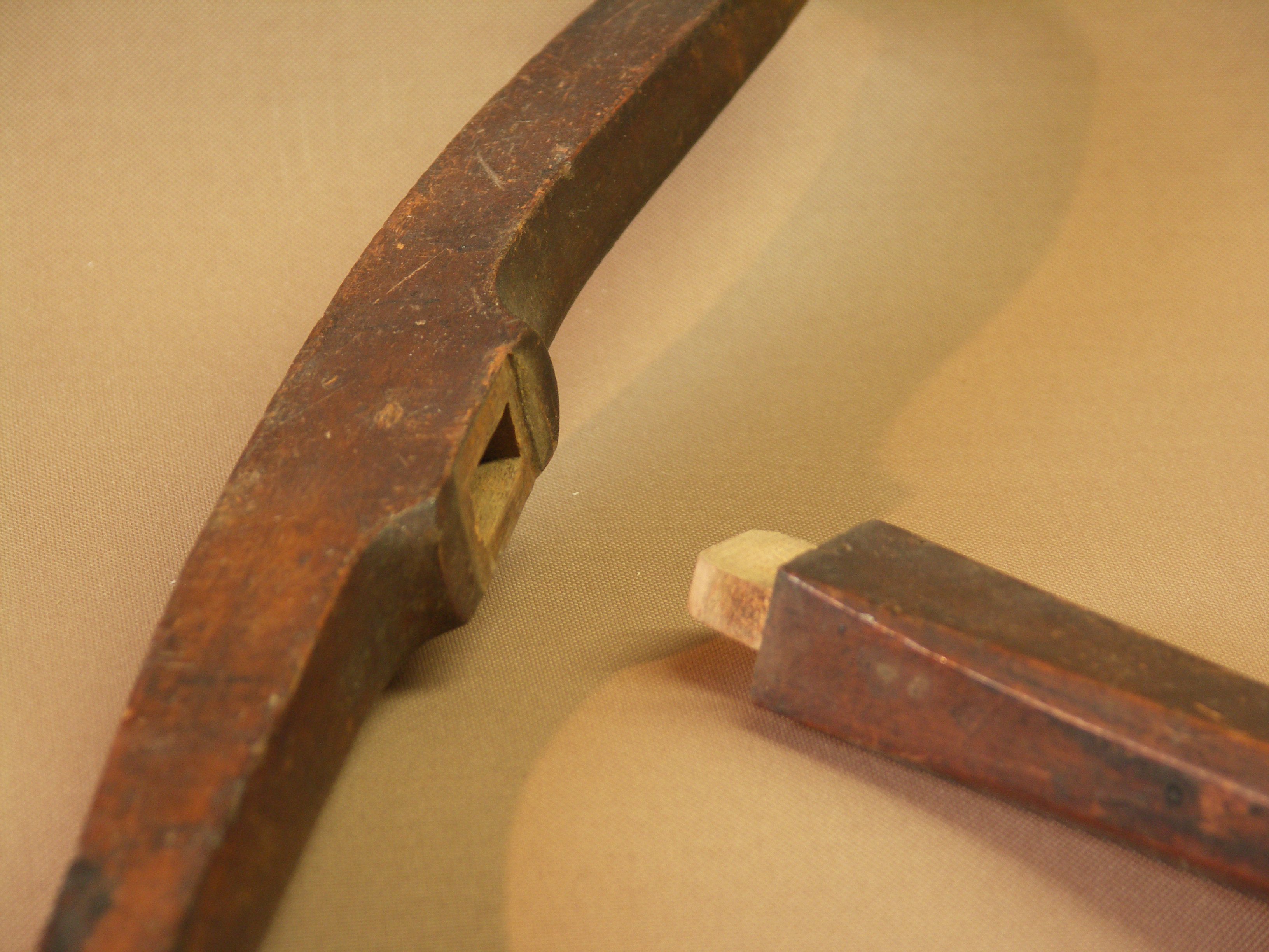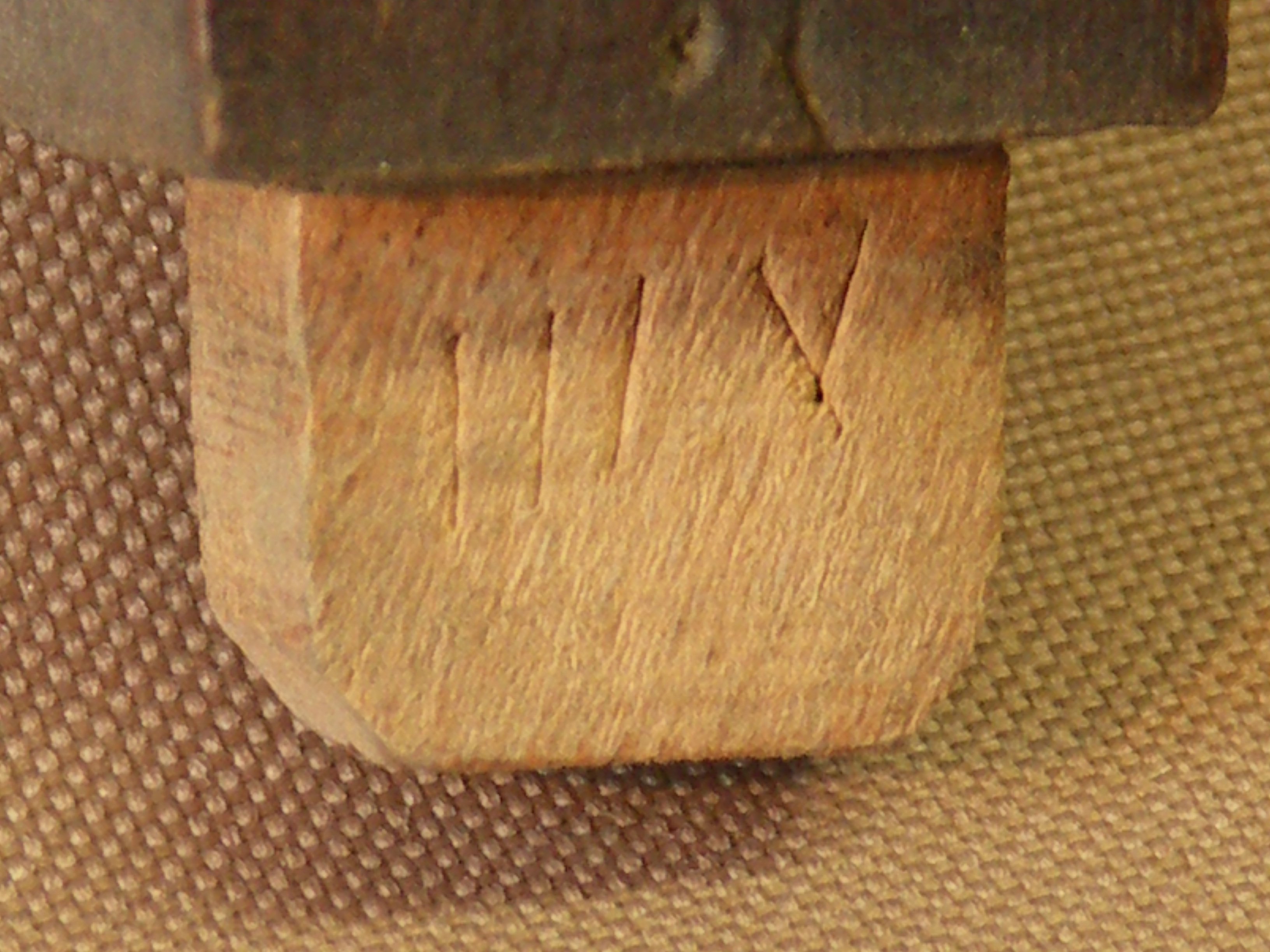 When I started to clean up the brass pins that hold the saw blade in tension I found the same IIIV Roman numerals, obviously identifying the specific parts to the specific saw. The cuts in the brass were not superficial but deeply cut.