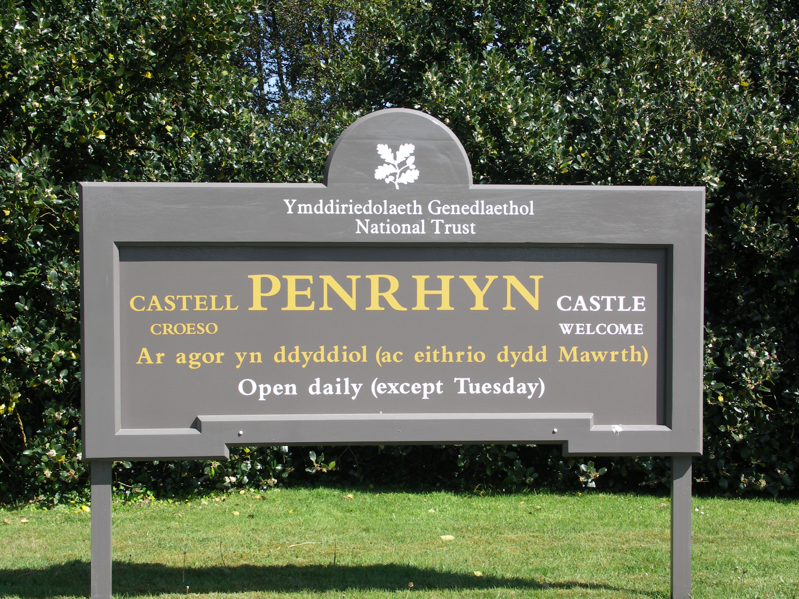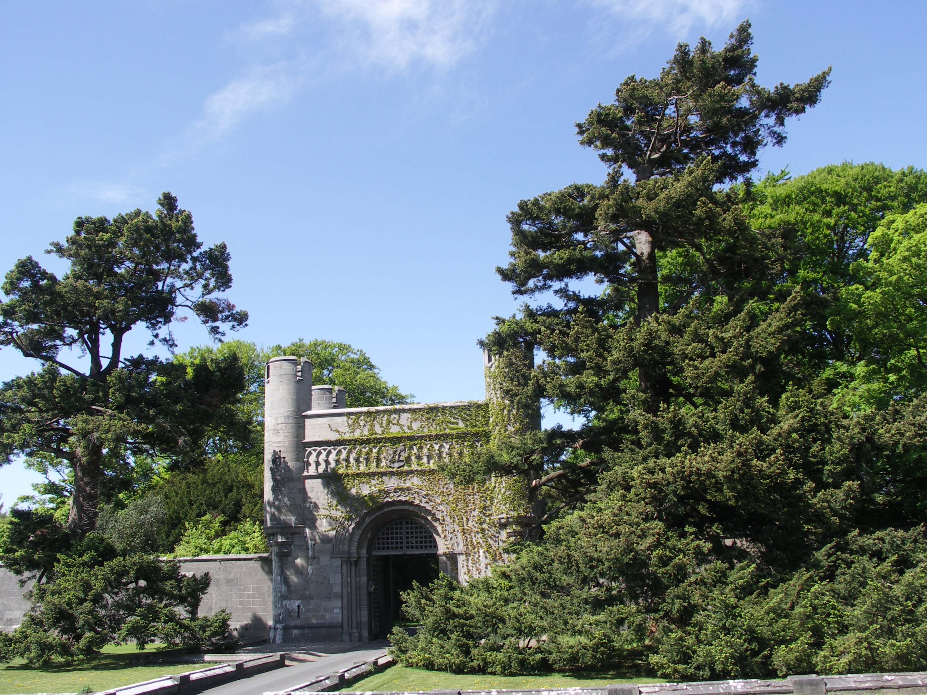 The Penrhyn Castle gates stand wide as I leave the yew trees just inside behind. I think pine trees and spruce, fir trees too, to be fine trees.