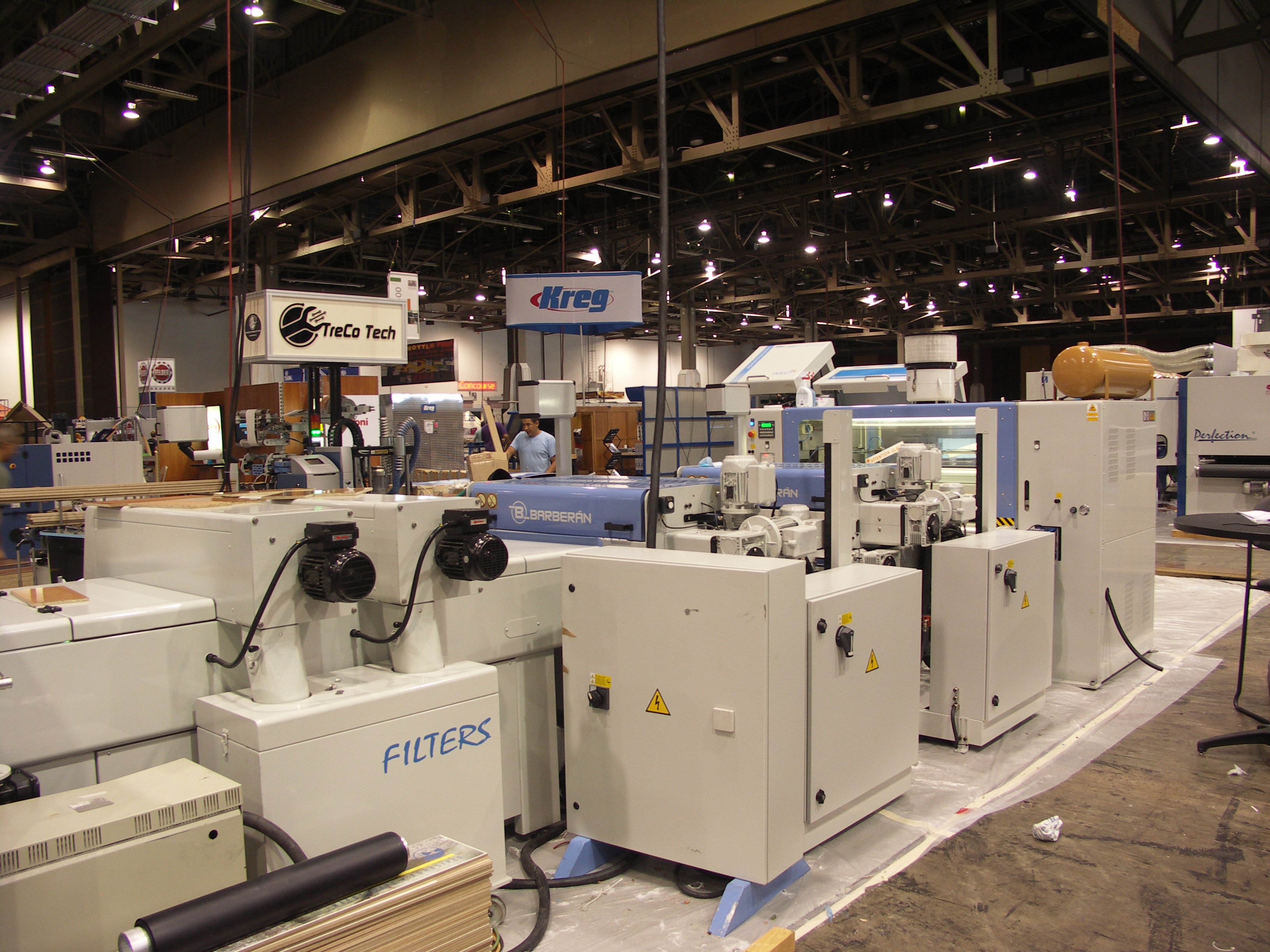 As I wandered through the aisles in its pre-show state, men and women unroll the carpets on their knees so manufacturers can plonk 10-ton machines on carpeted surfaces. The sterile environment smells of new carpet and glue. There are pockets of wood stashed here and there, but, dwarfed by industrialism, machines and equipment, they cannot be detected by smell.