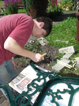 John repaints the bench ends with dark green paint until they look lovely again