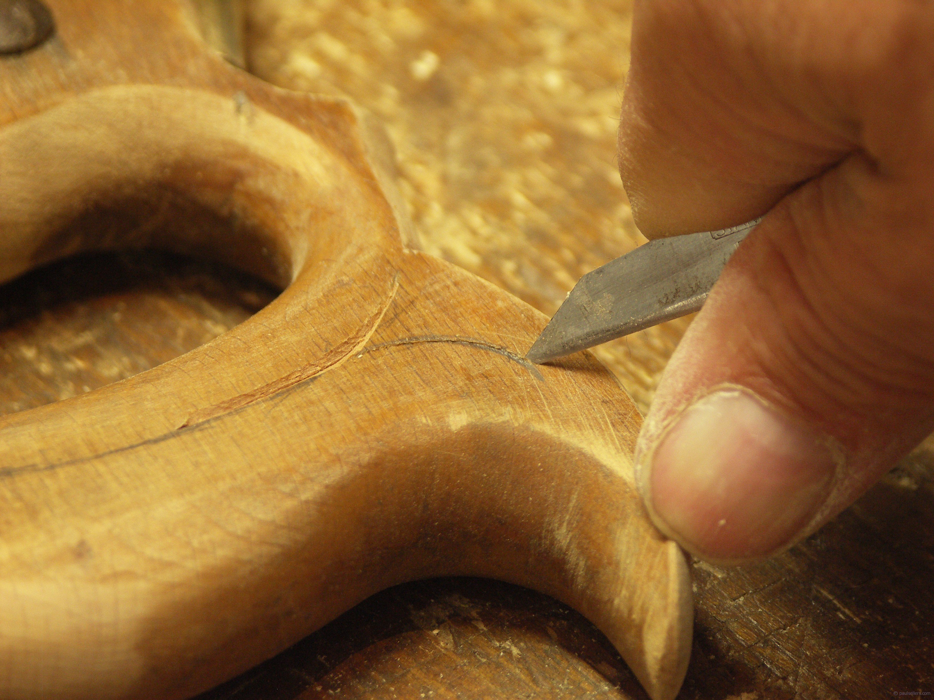 With the chip carving done, apply three coats of shellac and steel wool when dry to smooth the finish.