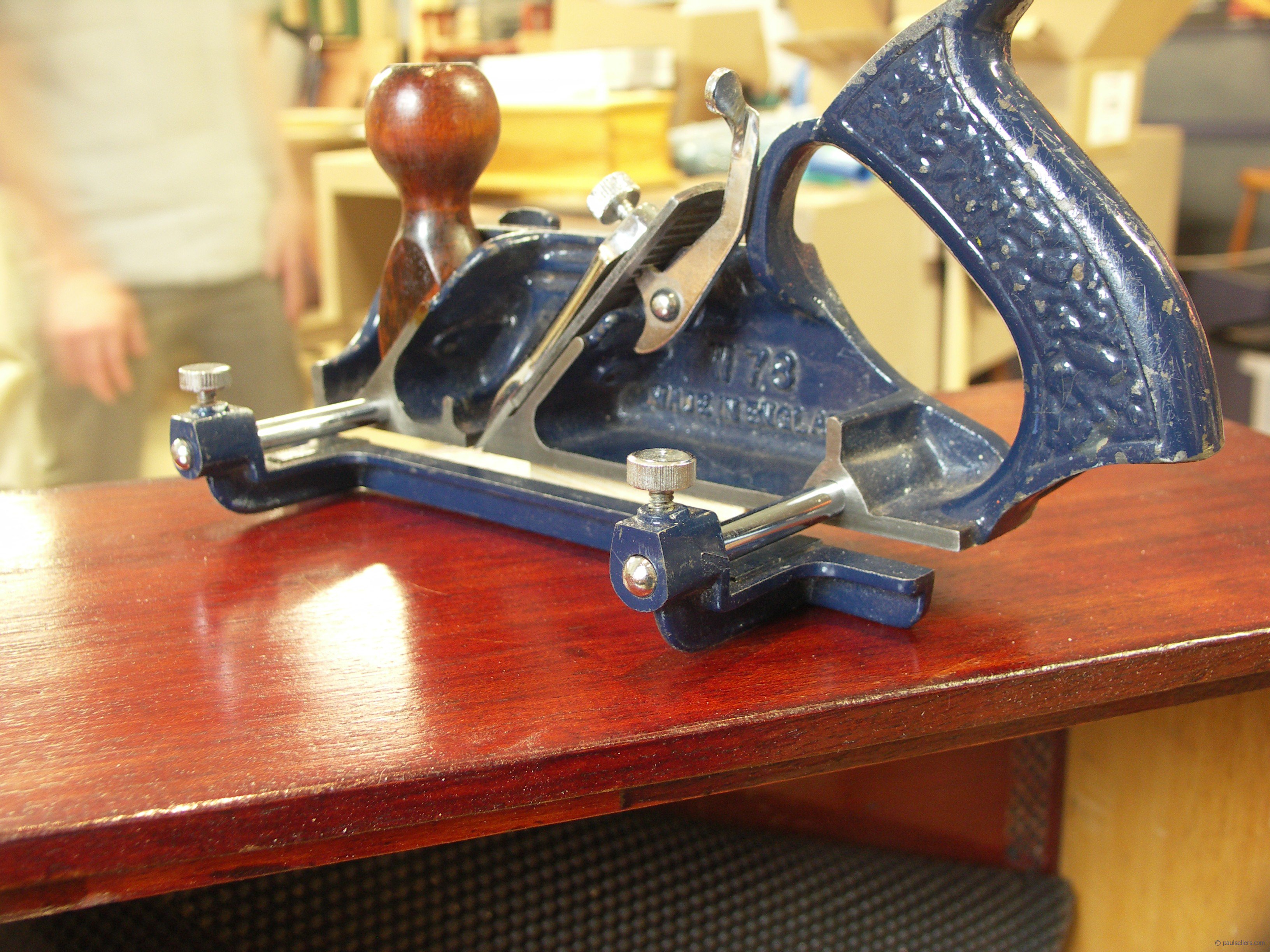 ...It also has a uniquely different cross-grain cutter in the form of a round cutting edge as opposed to the usual tri-spur cutter used in Stanley and Record models. The screw stems that hold the long fence are threaded into the body casting but instead of starting the threads directly on the outer edge of the holes the threads start much deeper inside the holes so that the shafts are supported within the hole and that gives it the additional support right where its needed. Little details make the difference. Another obvious feature is the fore tote. None of the other 78 models have this and I am anxious to see if it makes a difference to the handling of the plane.