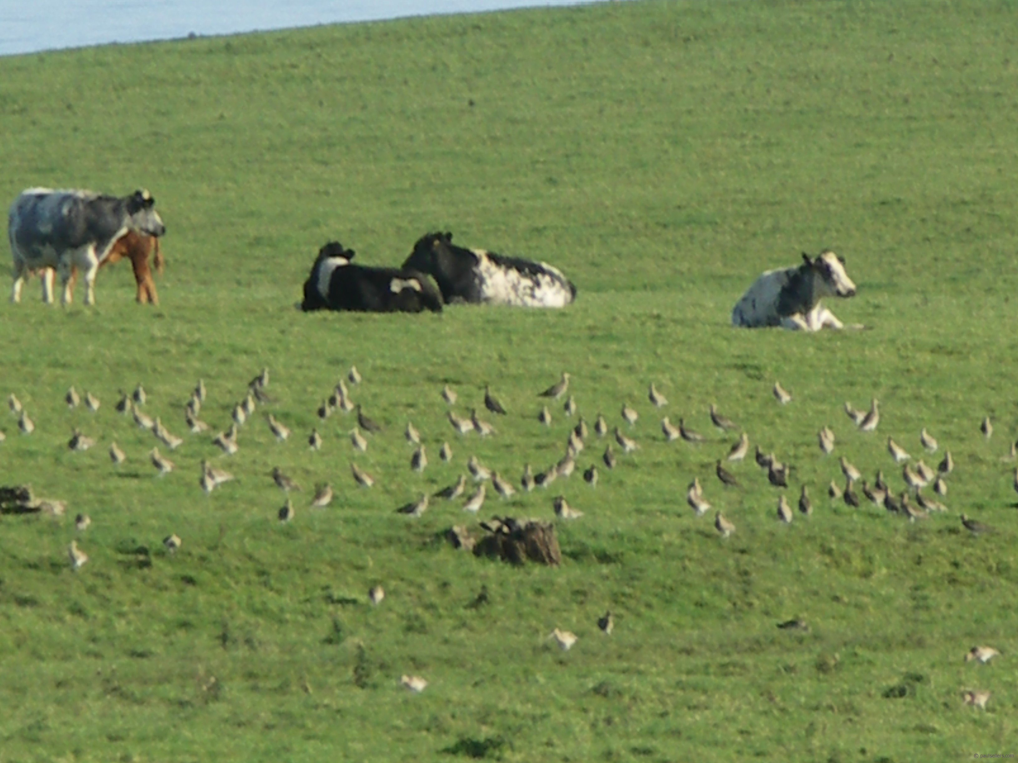 Walking past the woodlands and fields this morning is pleasant beneath a mottled sky of blues and fluffy clouds. The leaves are about turned with bright yellows, russets and reds and once again the tide is in so the curlews are feeding in the fields with the cows and sheep.