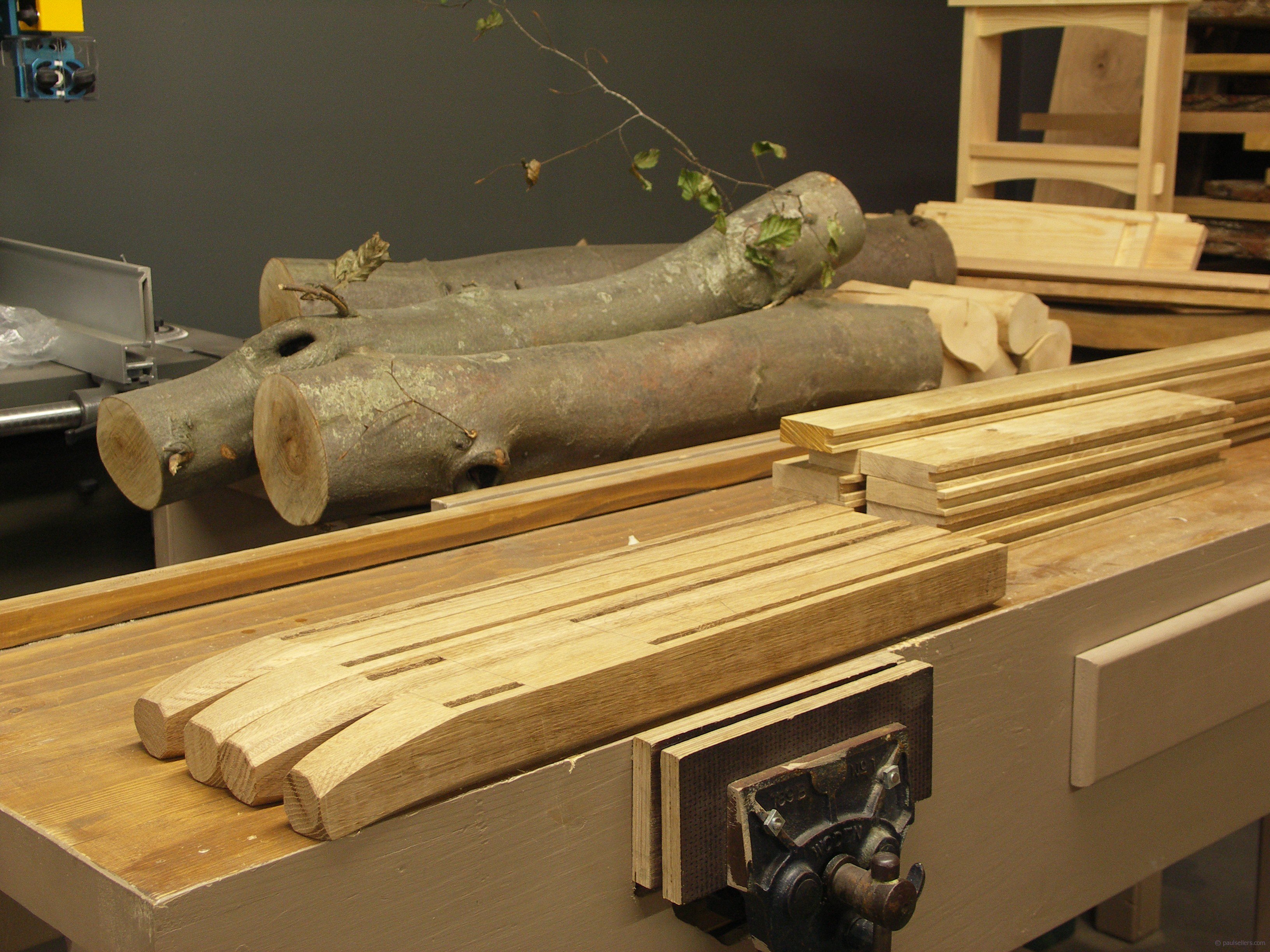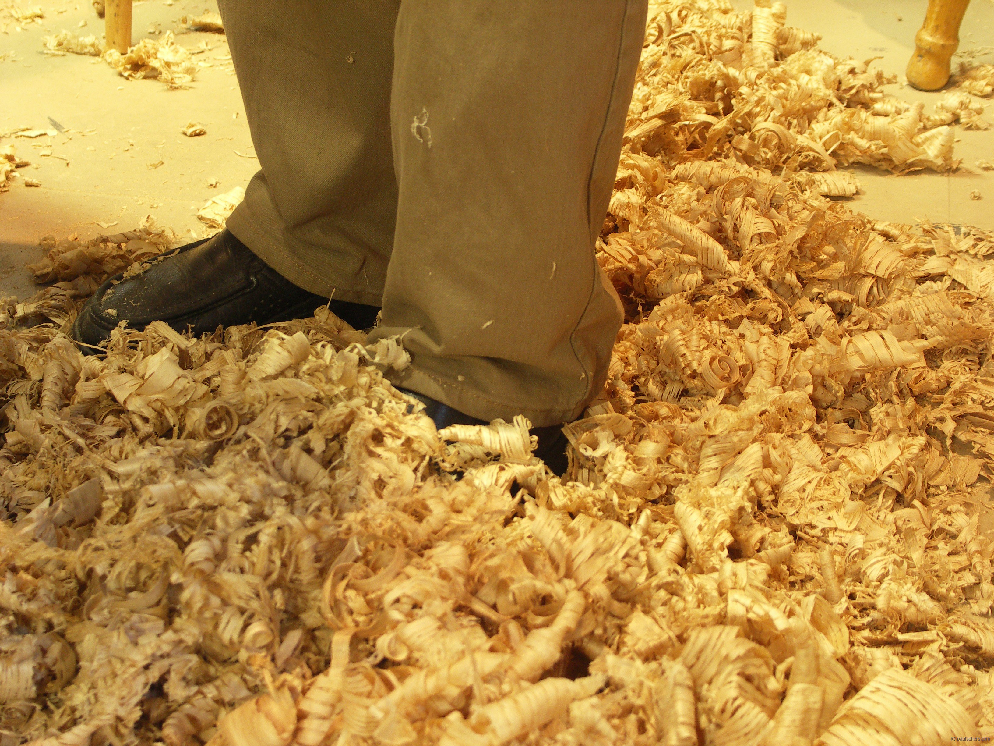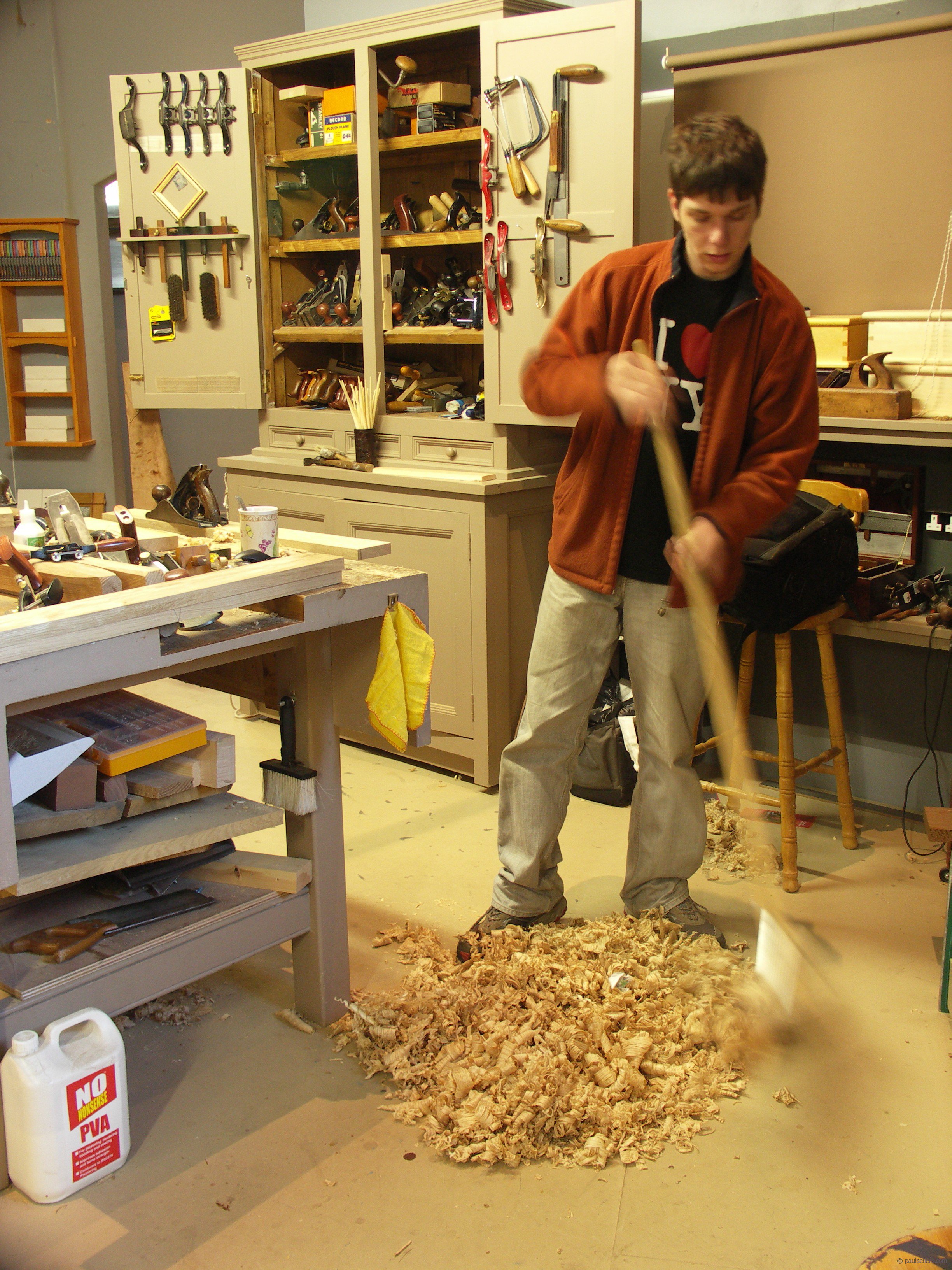 Sweep up takes place several times in a day to stay on top of the long strands of oak I generate from hand planing. We have filled a full 55 gallon bin with them in two days.
