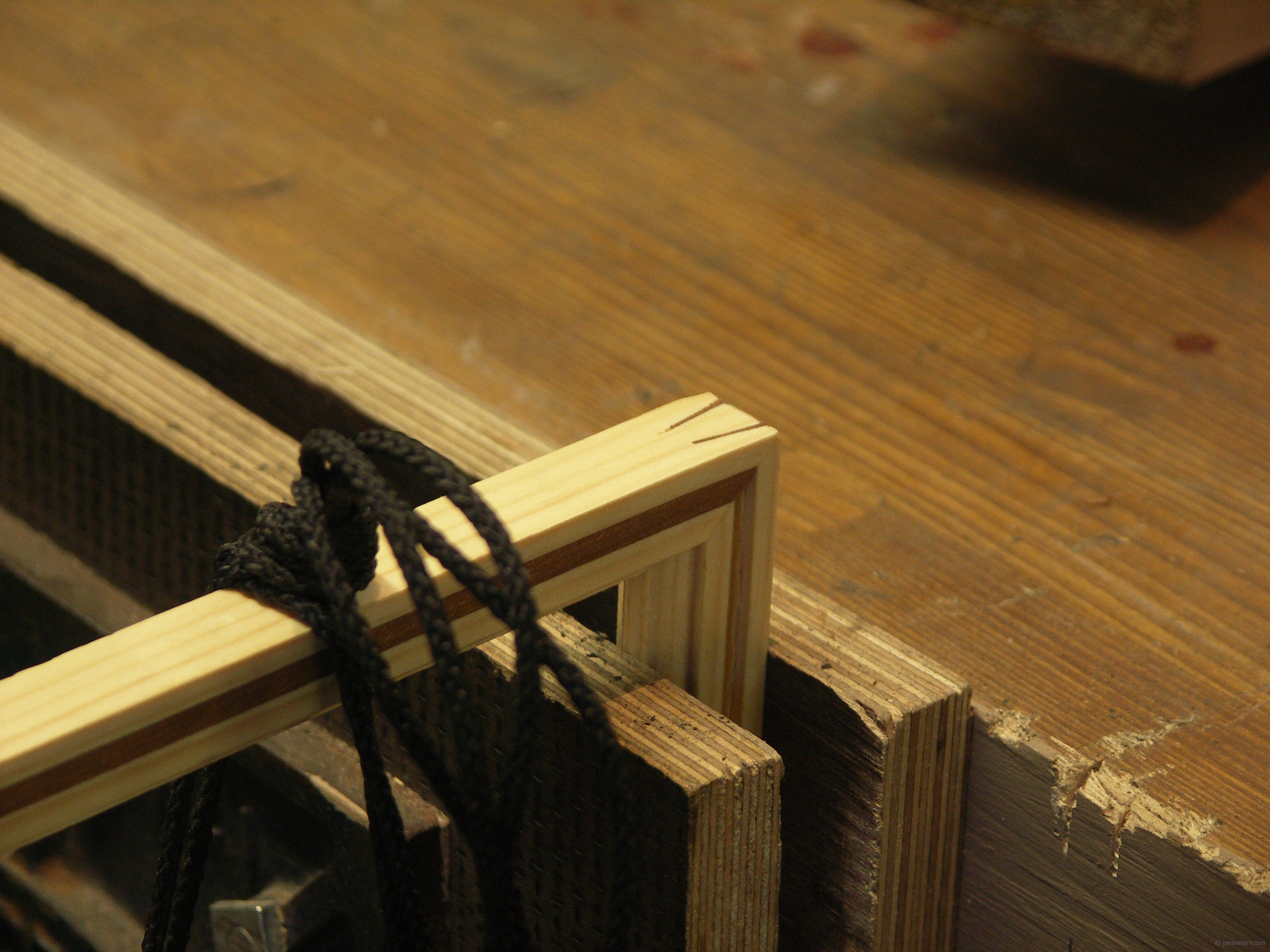 I glued one of them back at the workshop and let it dry and then today I tried to force the joint with hand pressure. The joint held. That led me to a scientific experiment comprising nylon string, a stout vise and a 42 lb cinder block. Those of you who saw me make the splined corner will recall that I moulded the stock with a pristine ovolo profile using a 150 year old moulding plane in 12 strokes and that in under 1 minute. I then inlaid the stock of 3/4" by 5/8" with a mahogany inlay and in one additional minute ran a 1/8" x 1/8" rabbet for glass and picture.