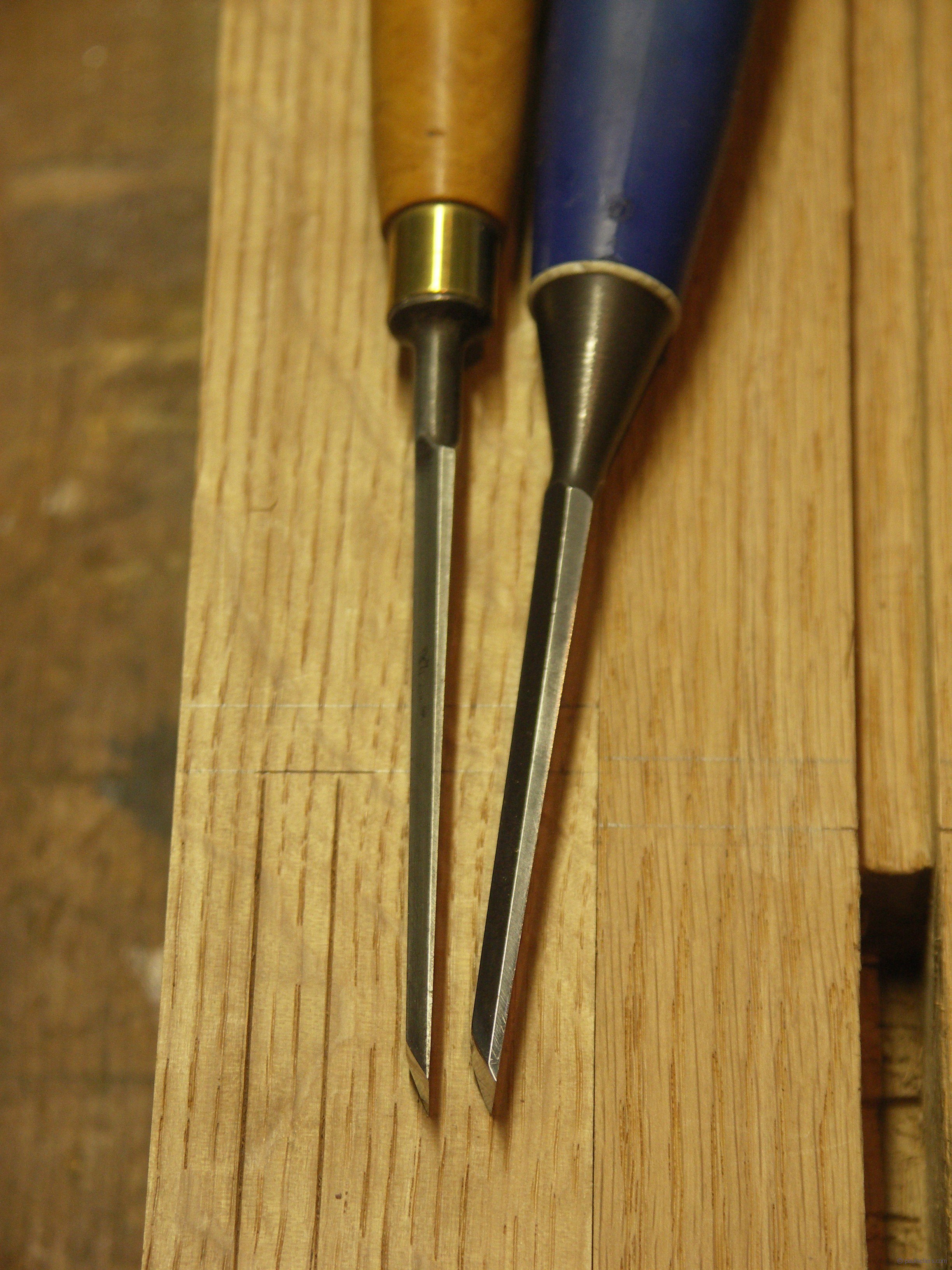 OK, I hope you will take my word for it, but a 3/8" (12mm) by 1 1/4" deep by 2 1/4" long mortise hole generally takes me about 4 minutes to chop in solid oak using my system and skill, a Marples blue chip bevel-edged chisel (not an Irwin made in China) and a panel beating chisel hammer.