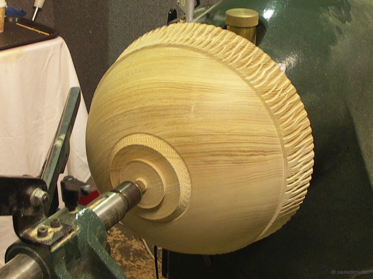 The bowl in mid turn comes of course from the gouge and has a sculpted rim. It's a beast of a machine that holds what was once made on a simple wooden frame one hundredth the weight with little more than two steel spikes. But the wood is cut by the free hand and direction of the cutting edge, which relies totally on the decisions he makes.