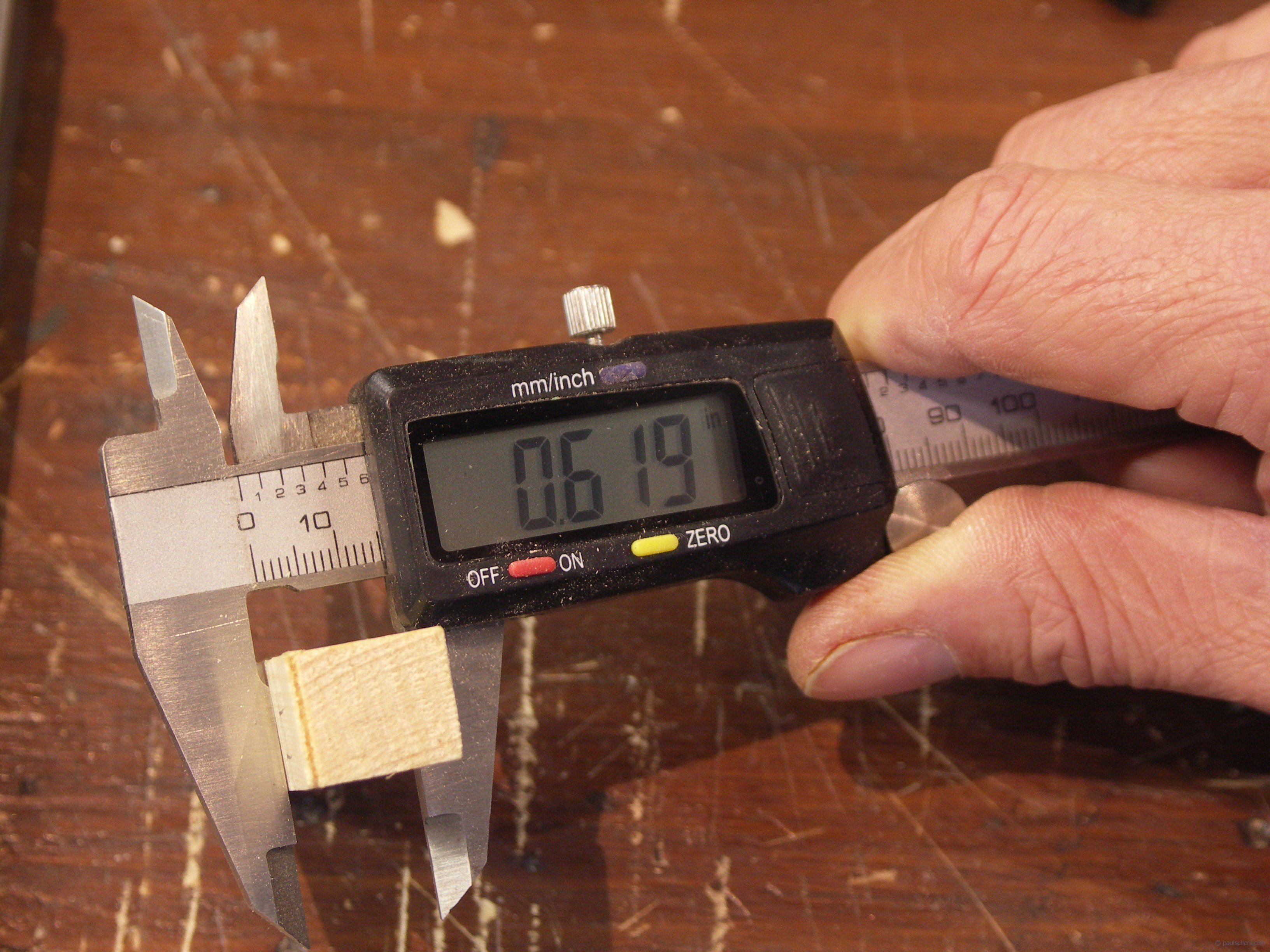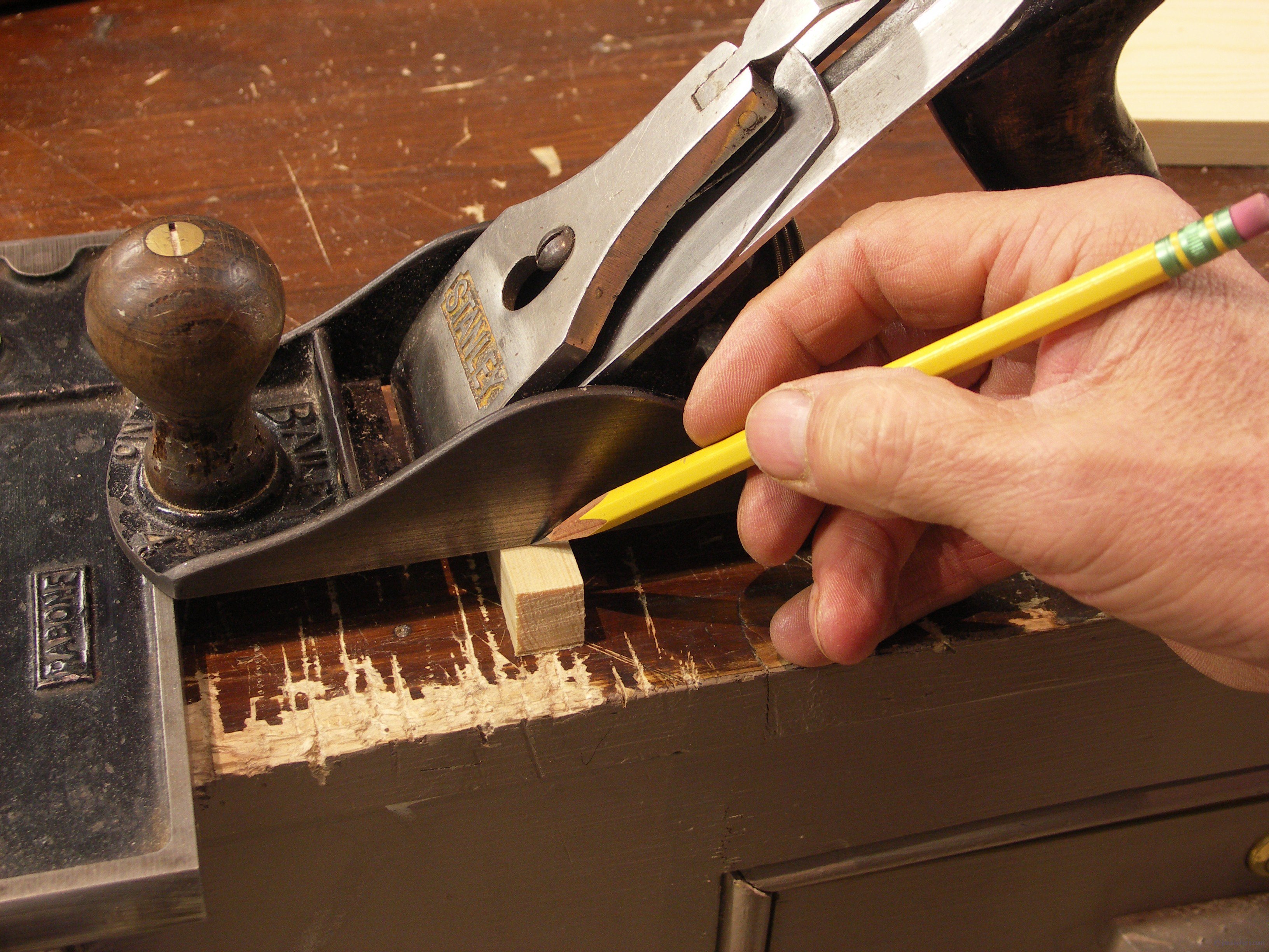 Cut a wedge that tapers shallowly and is wide enough to engage the under edge of the plane as shown. With no pressure, slide the wedge under the plane until you feel engagement and with a sharp pencil make a mark.