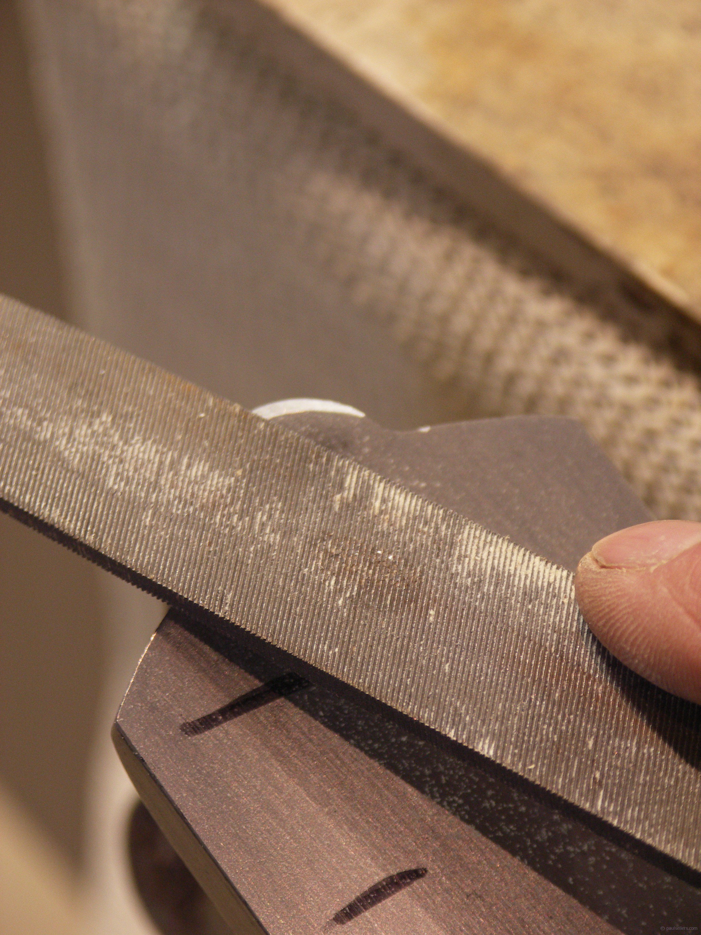 File off the heel of the plane if this has not been done previously. This heel is notorious for damaging the corner edges of work on the reverse stroke of the plane in use. Sand off any unevenness from the file.
