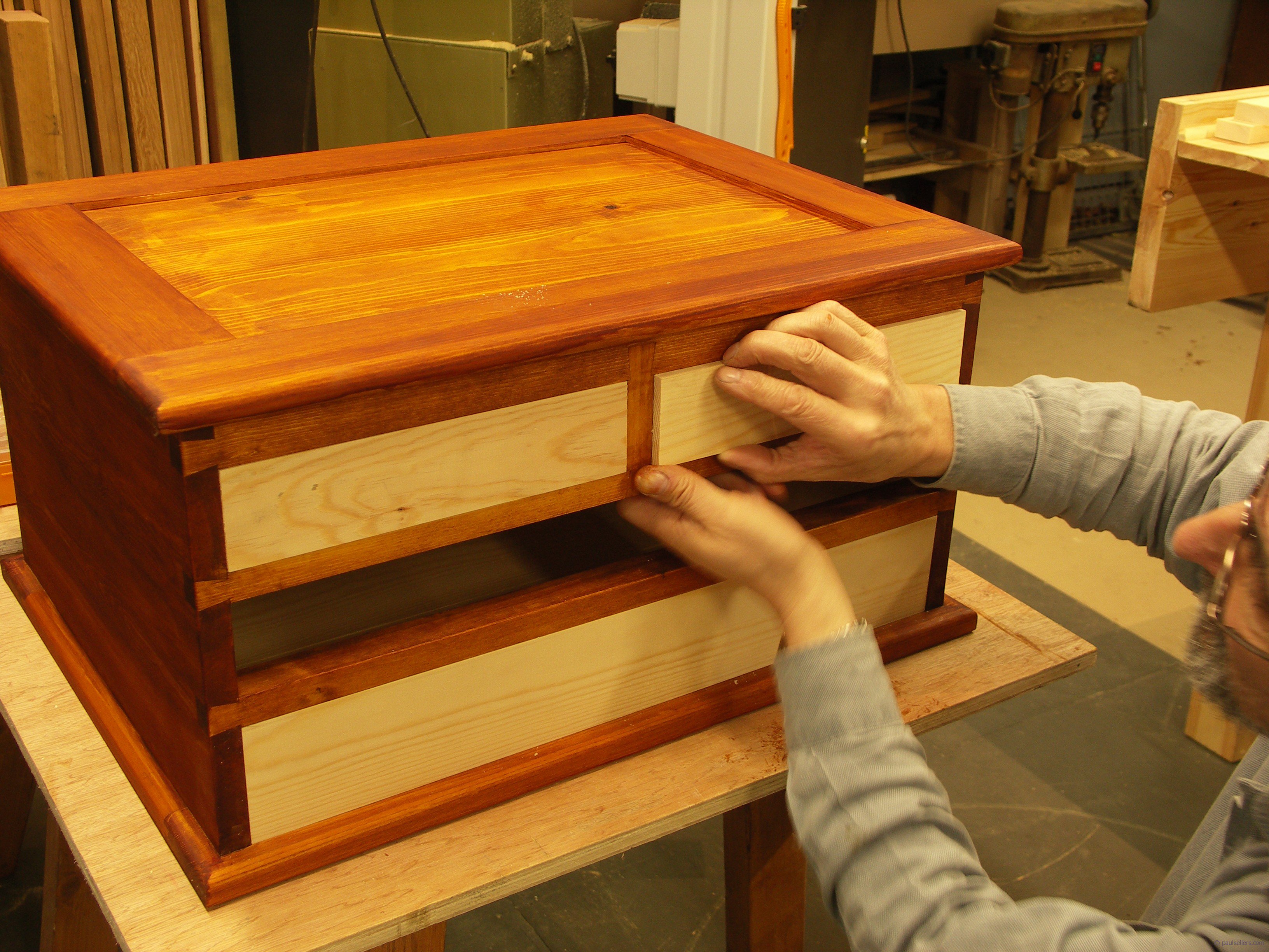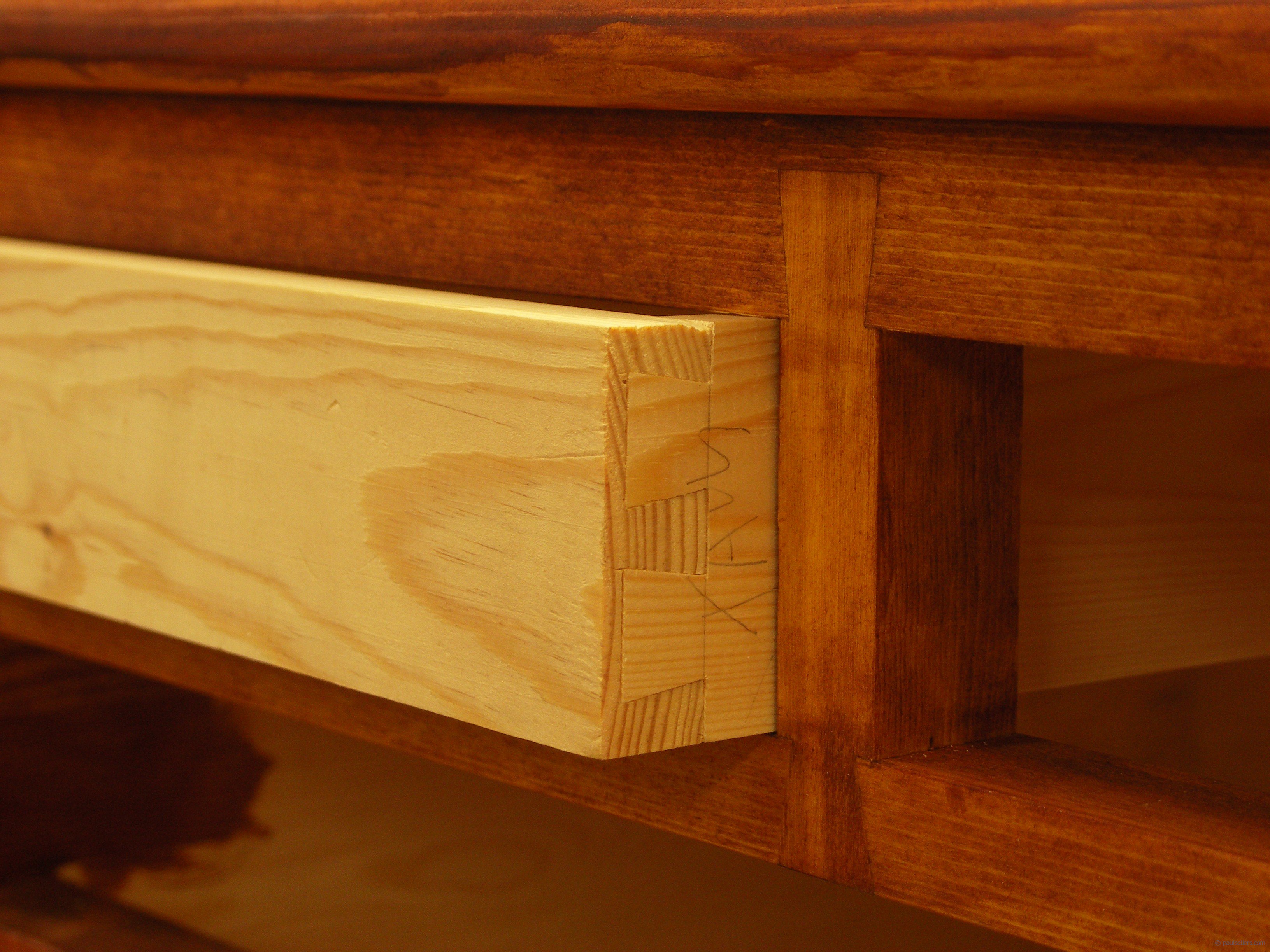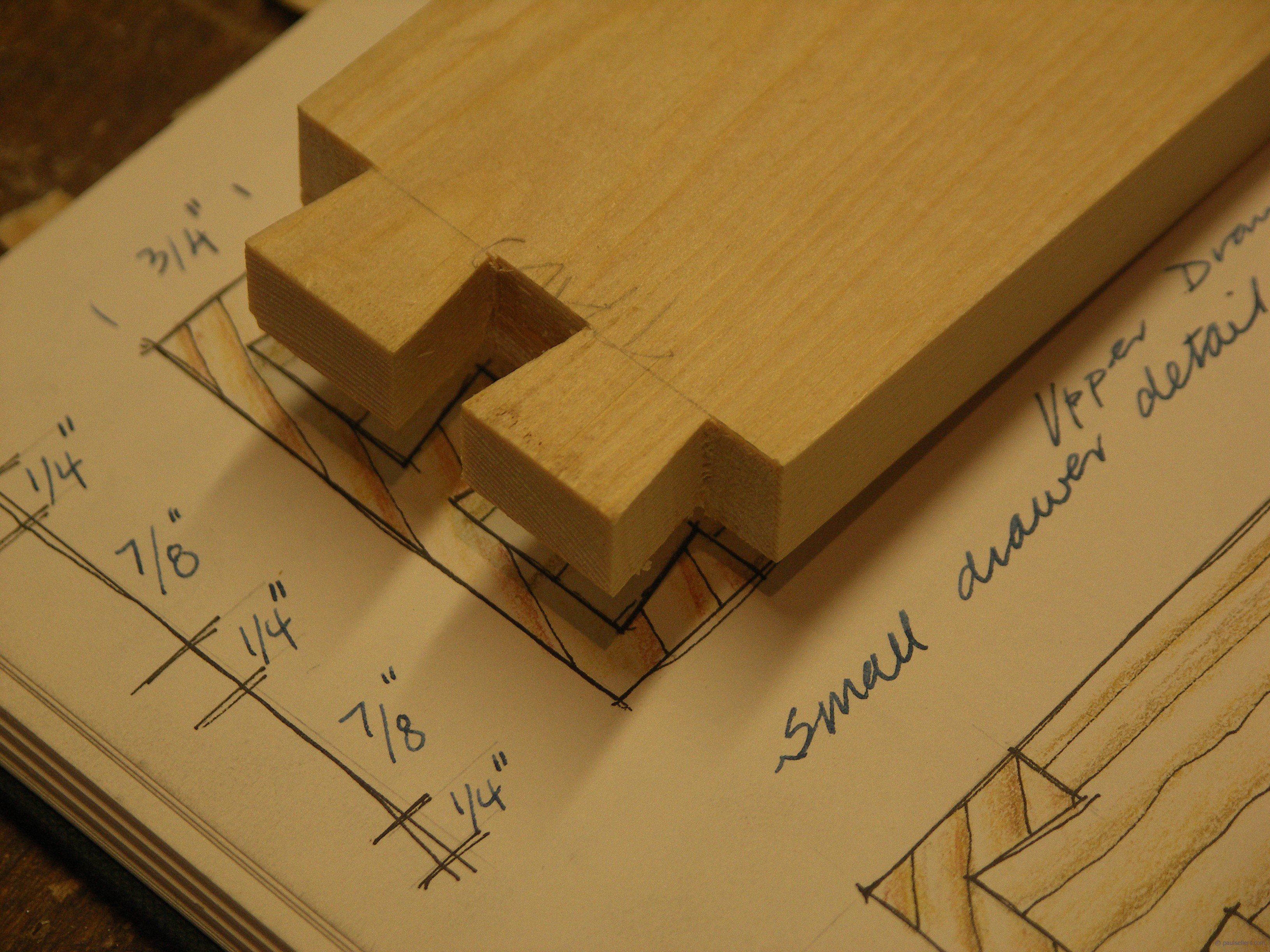 The first drawer fits into the opening well and so too the dovetails lapped to the front face of the drawer.