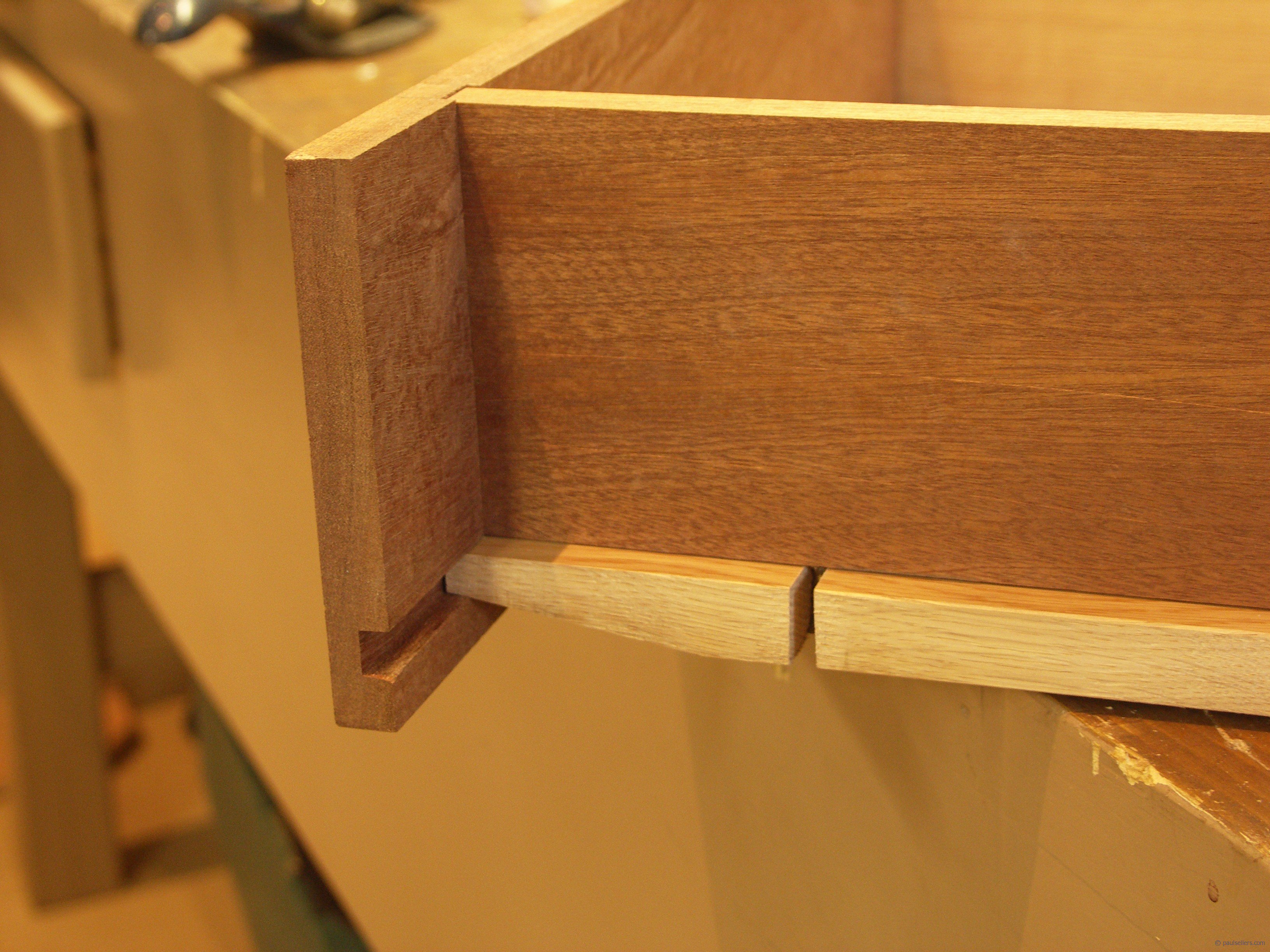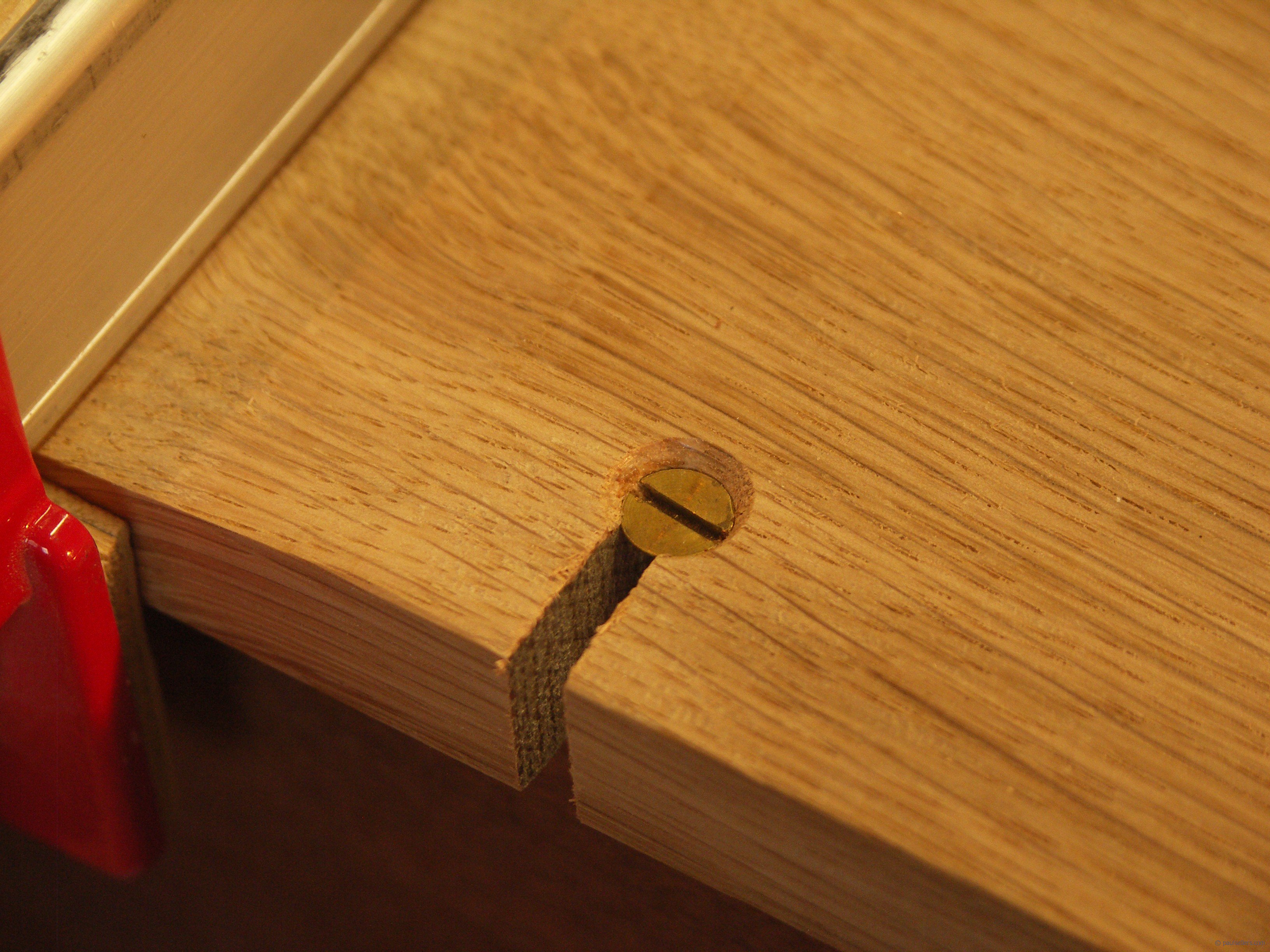 This slot allows for adjustment should shrinkage take place later; loosening the screws allows me to move the drawer bottom forward into the groove and to tighten the screws again. I always ensure my furniture wood is dried to 7-10% and my shop is humidity controlled. This minimizes the risk but I like it there as a safety feature