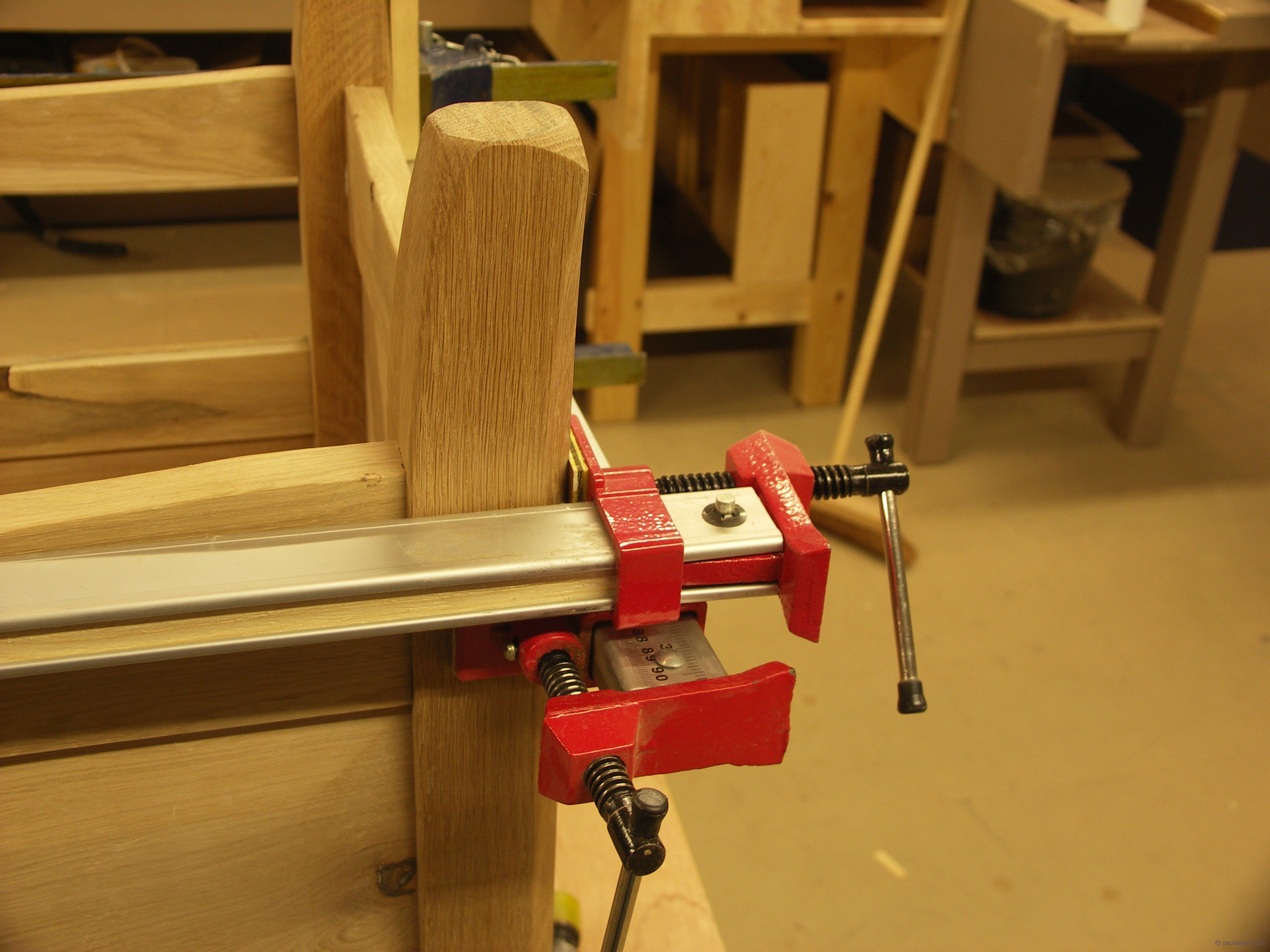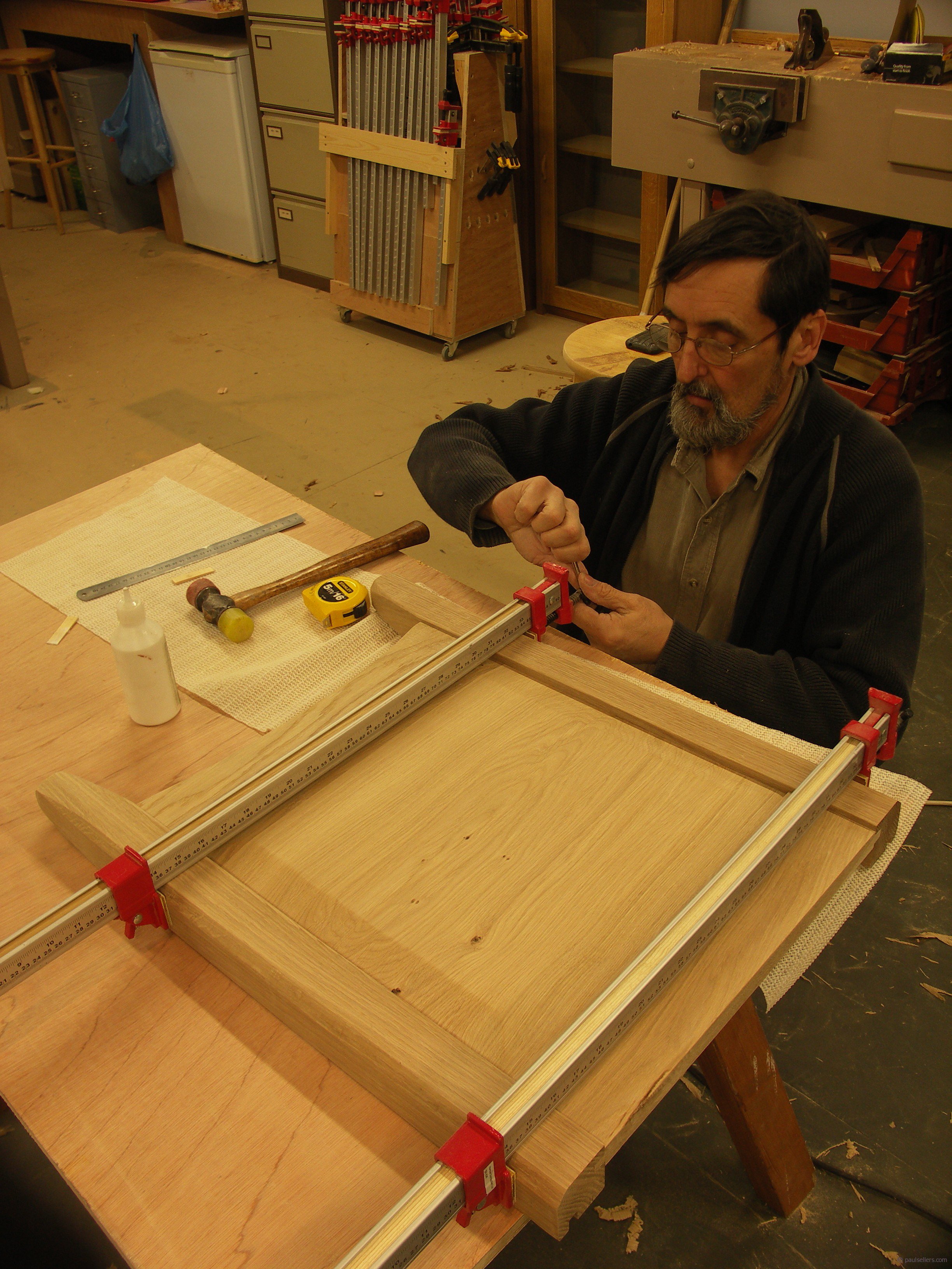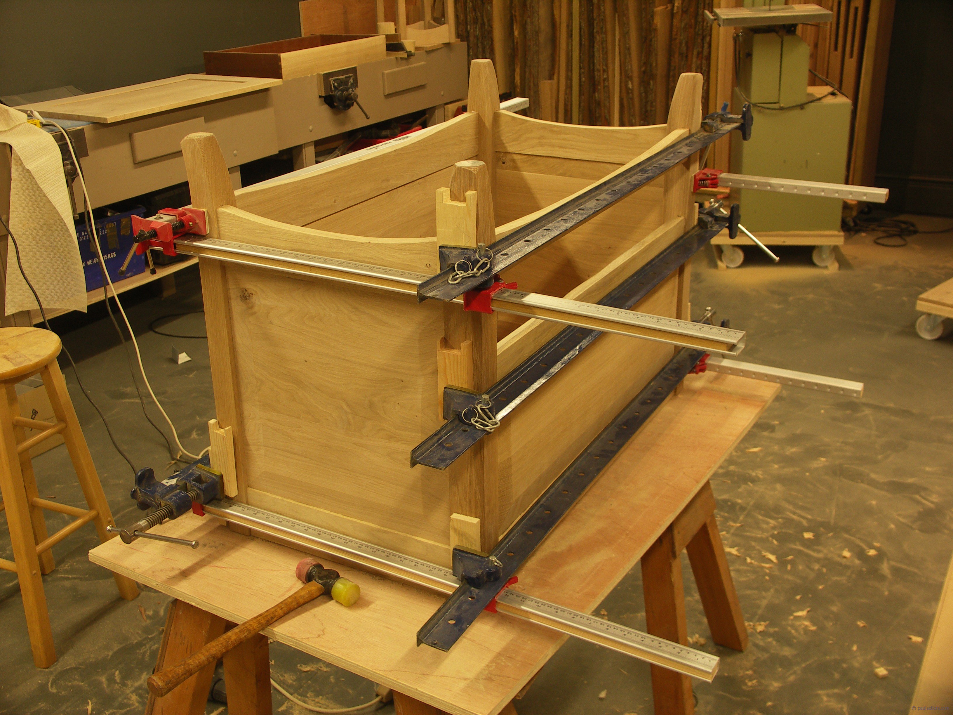 The other thing that’s important as a result of order is that it builds in safety during the assembly. A joint froze on me one eighth of an inch from the closed shoulder line. The chest was fully glued up and everything else was in order but for the one joint. Experience told me that any frozen joint will go with two things; an extra clamp and an unflinching hammer well aimed. I took a clamp from a closed joint, united it with the existing clamp and, under the extra pressure, struck the leg. The joint snapped to and the shoulder seated perfectly and I retightened the one clamp and replaced the other.