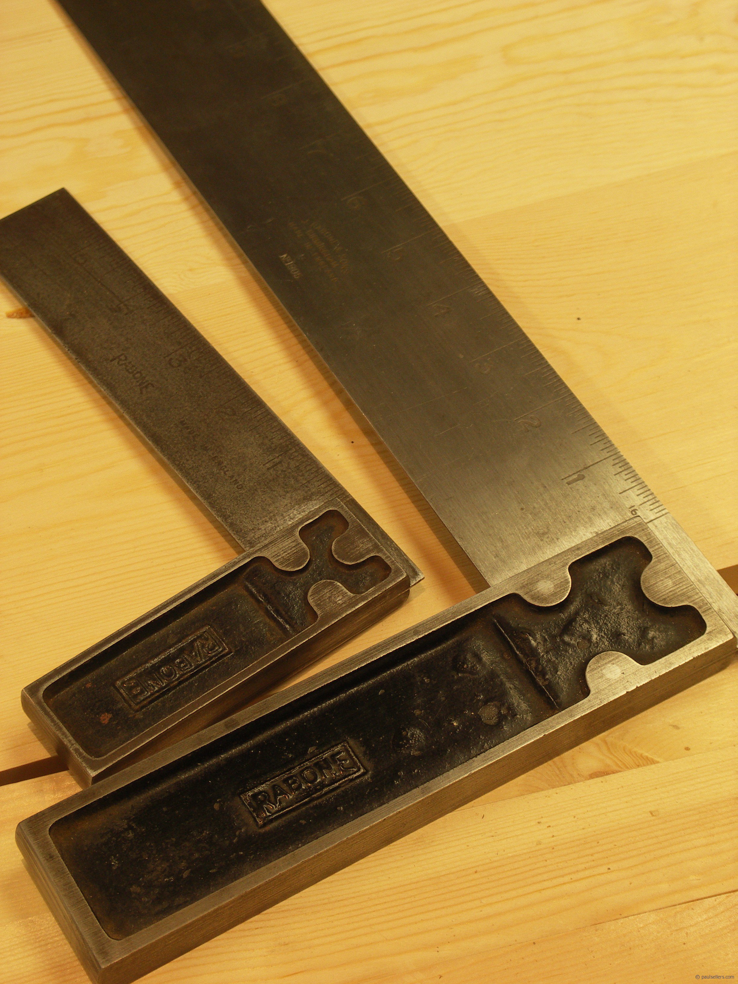 I have try squares of different types and sizes and enjoy using them on some of my work; I especially like the large ones for reasons I give below. These Rabone Squares from the 1930-1950s handles most of my needs and whereas the combination square is the most used of all, I use this type for the internal corners of frames and boxes or squaring lines across panels and sheets of materials like plywood. The older Rabones and Rabone Chestermans were engineering toolmakers of high reputation. That has changed through the years and the standards once set have sadly diminished. That said, they hold their prices on eBay but can still be bought as an alternative to new. All steel models like the one here are quite heavy to use and are indeed more clunky, but on larger component parts and projects they give the heft and size I need so I like ti have them around fro that.