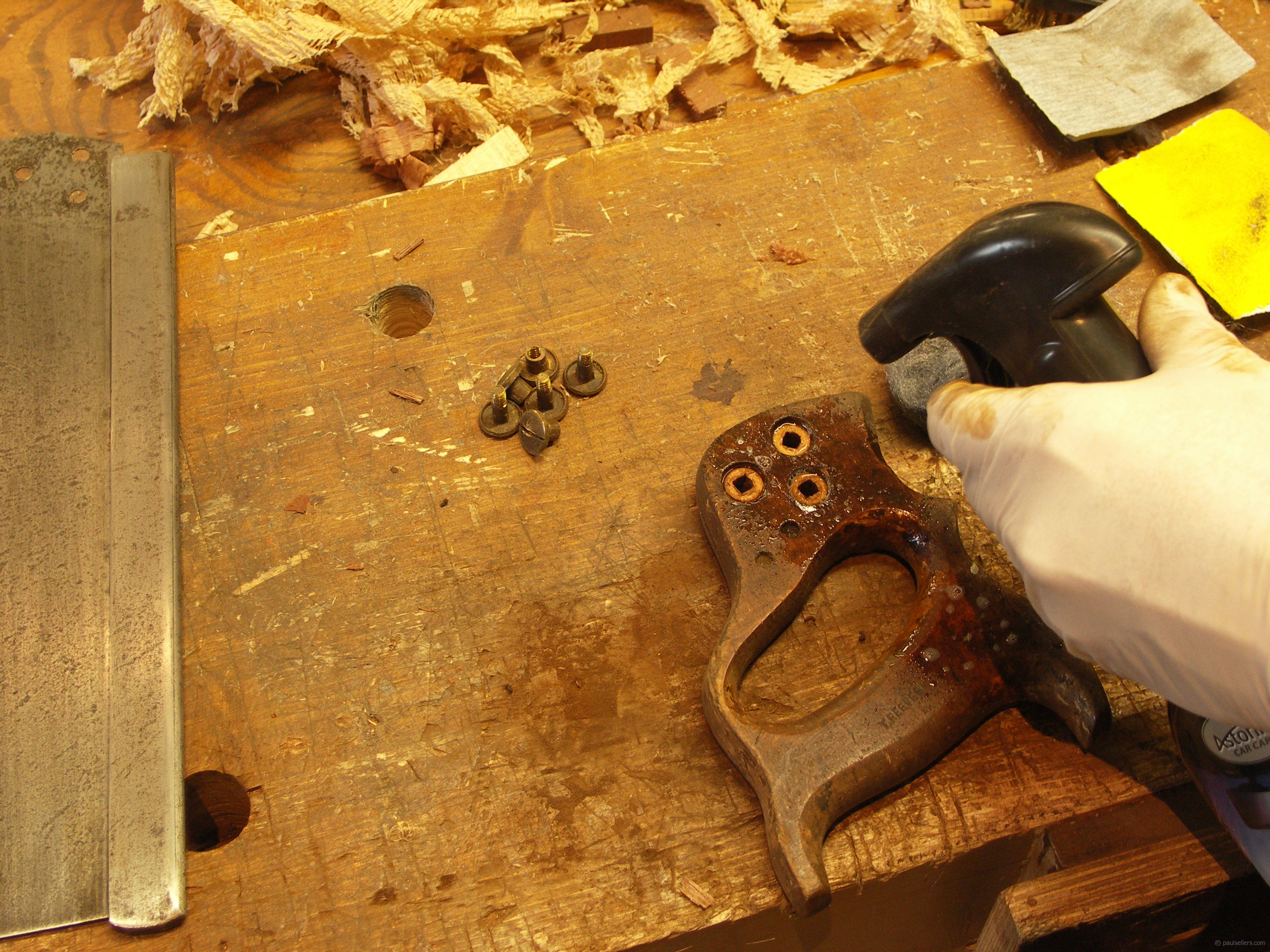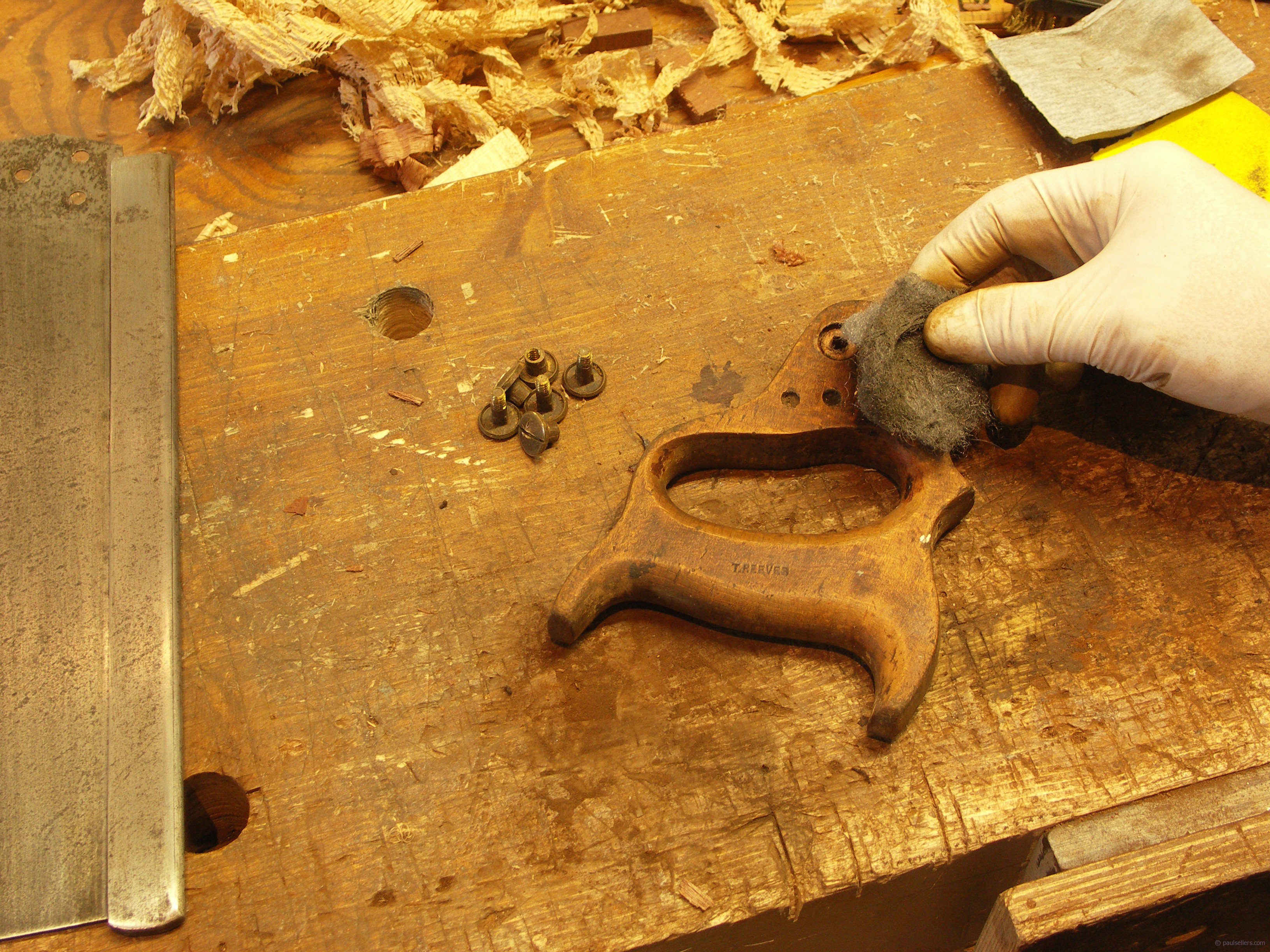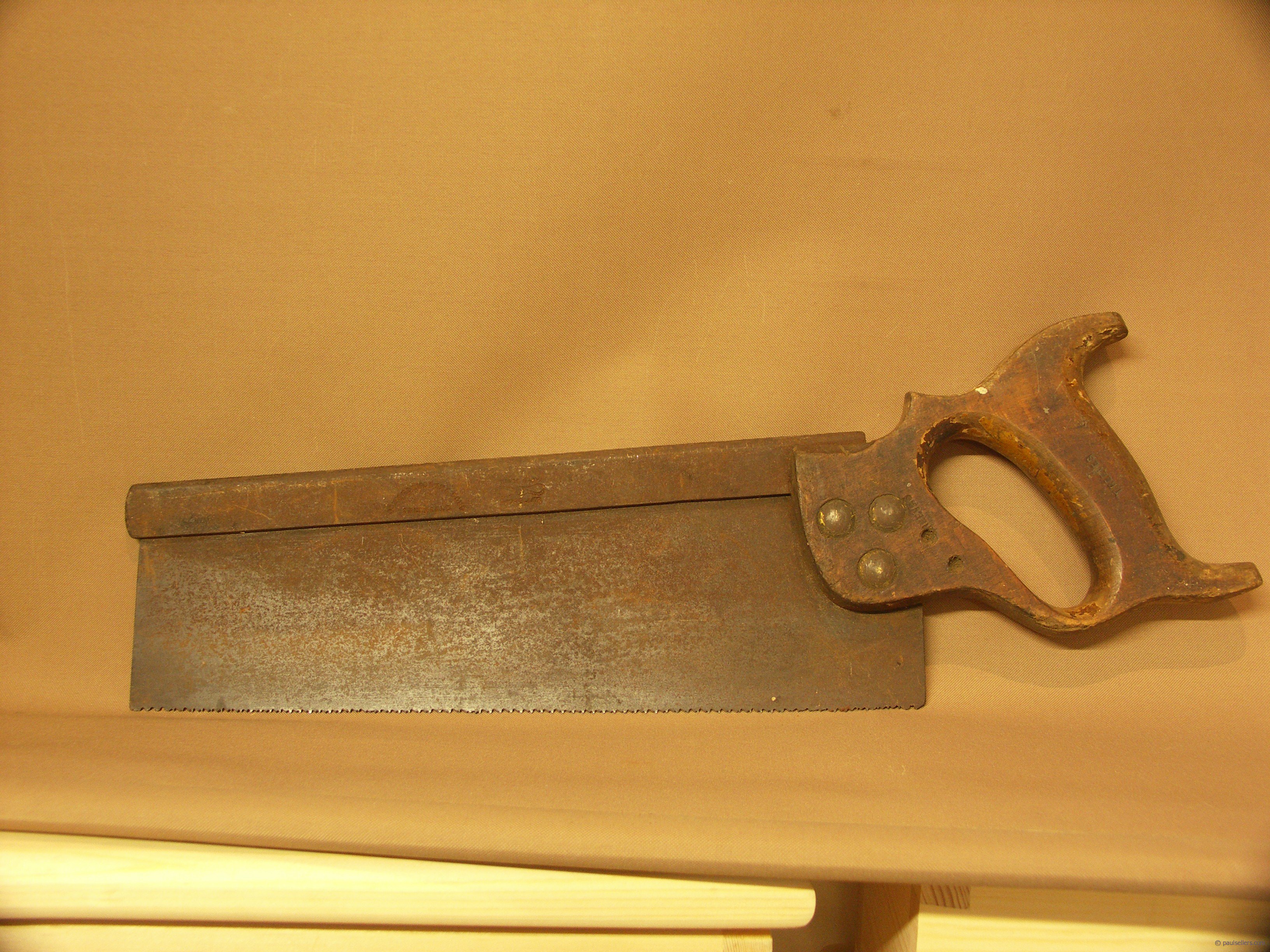 This is how the finished saw looks replete with the original maker's name visible again on the spine again.