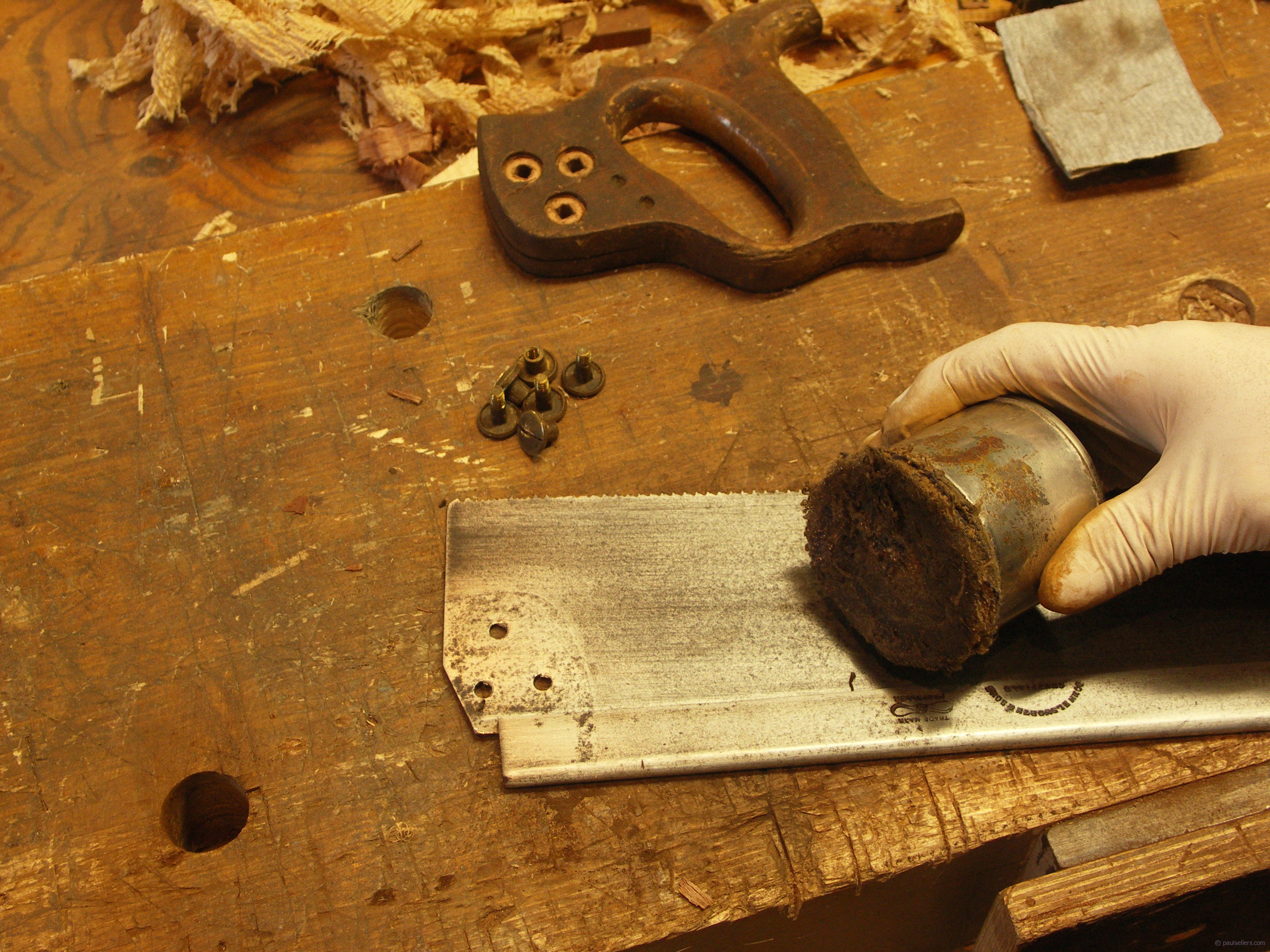 Raw steel, freshly sanded should not be left to the elements. It readily rerusts so coat it with oil. As you use the saw it will take oils from the wood and your skins and will stop rusting the more you use it. My used saws never rust. My oiler is a 4-oz can with a rolled up cloth wedged tightly and evenly inside and soaked in light machine oil. 3-1 oil is fine. This puts exactly the right amount of oil on the steel.