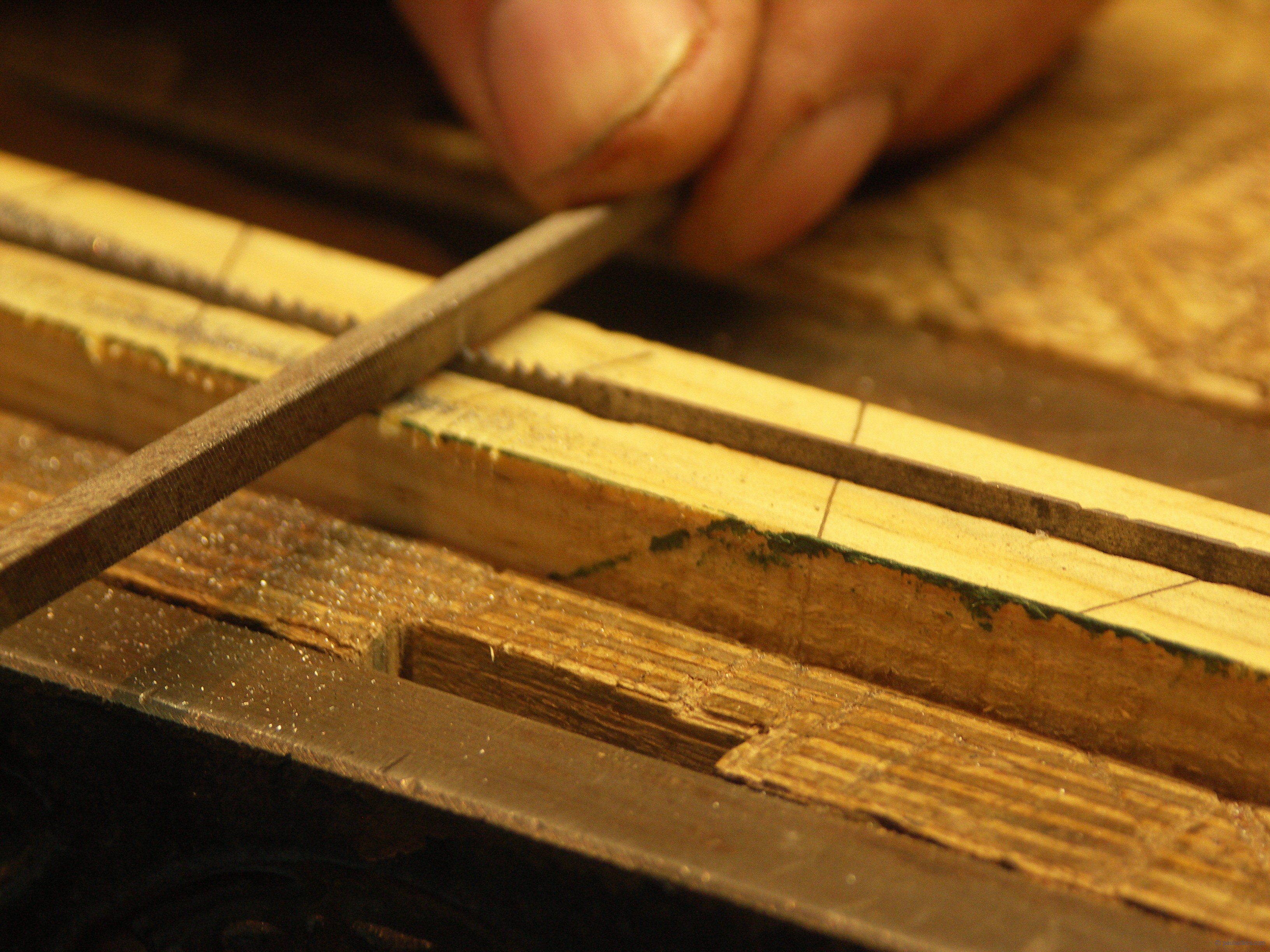 I now line up the file with each increment and take three or four swipes to establish the vee. I move along to each increment, keeping the line to my right and moving the file with each stroke to the line on the chock. At this point I am not so bothered about depth but more evenness. Bright spots on the edge mean that I haven’t yet reached the full depth, but after doing a couple of inches I go back and take consistent swipes evening out my discrepancies. Don’t worry. It works.