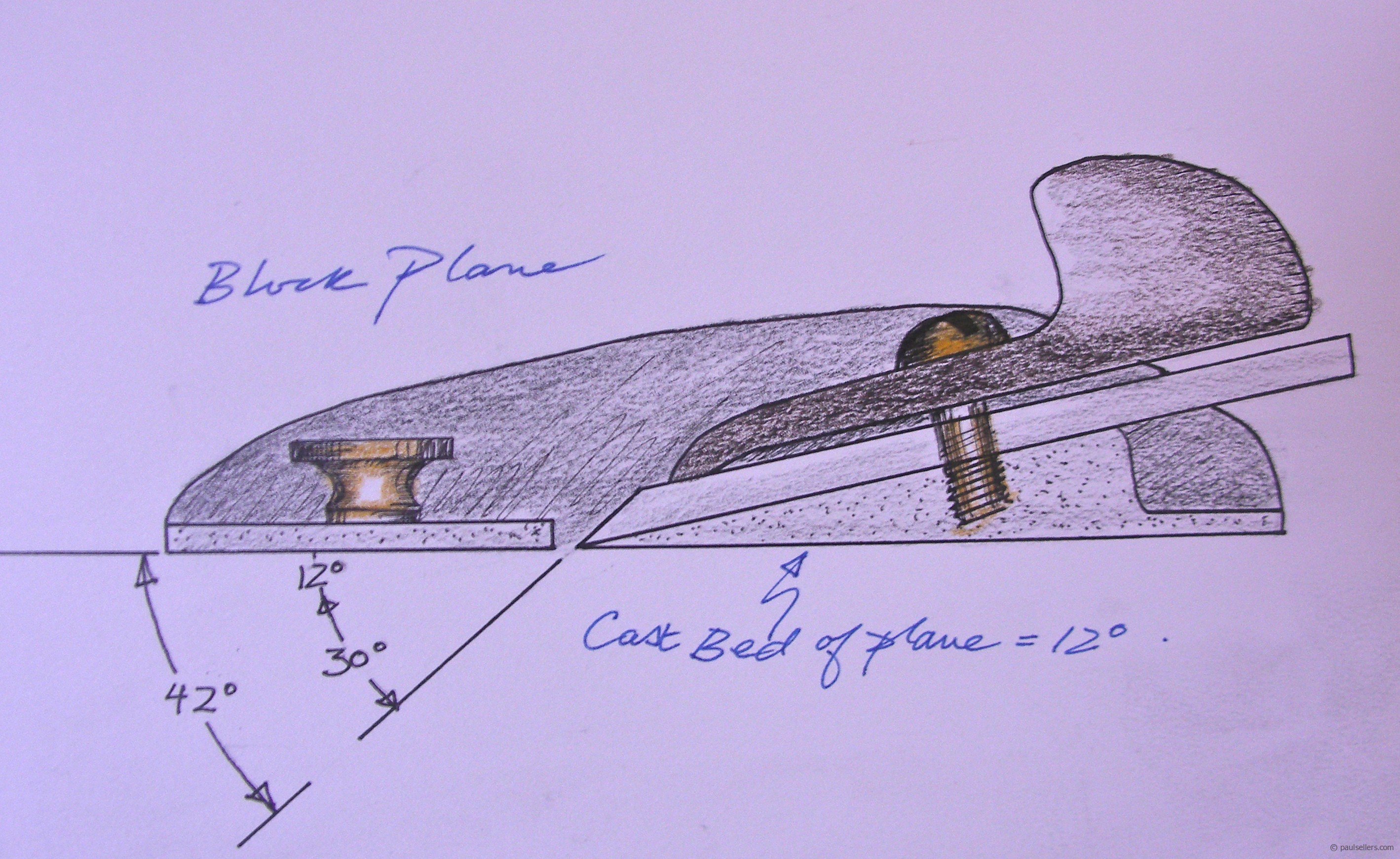 Block planes in general favour two bedding angles and many bevel-up planes have a 20-degree bed. When that happens the calculated difference in the angle of presentation to the wood is actually higher than the conventional smoothing plane and sits at 50-degrees - 6-degrees higher in fact.