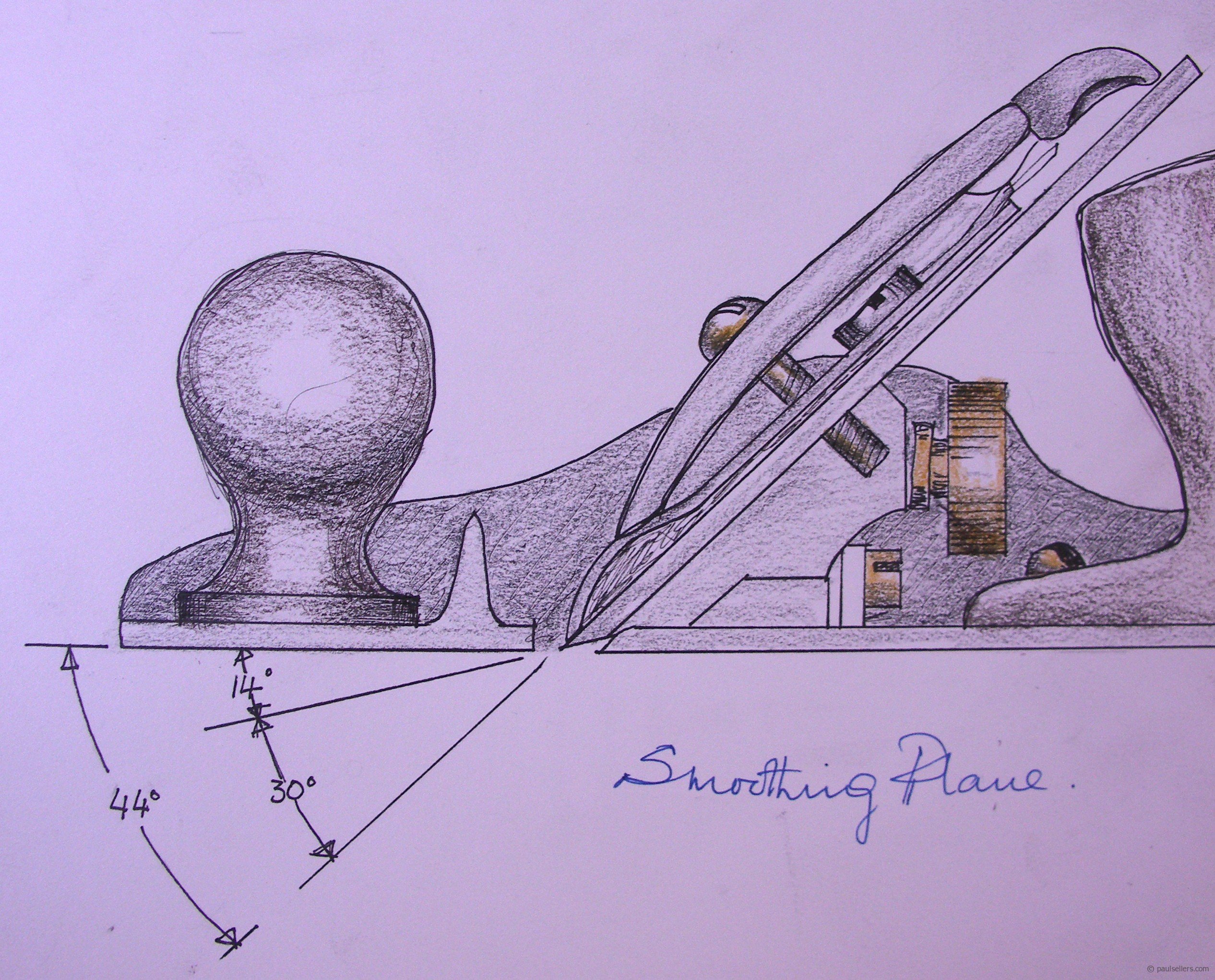 People often consider the bevel-up plane to be more effective because of the low bedding angle supporting the iron, but the difference between a block plane and a smoother is only marginal when it comes to sharpness or angle of presentation because the bedding angle of a low-angle bevel up is usually around 12-degrees and the bevel on the bevel-up plane is around 30-degrees. Combining these two angles totals about 42-degrees and so the angle of presentation closely parallels the bedding angle of the smoothing plane at 44-degrees.