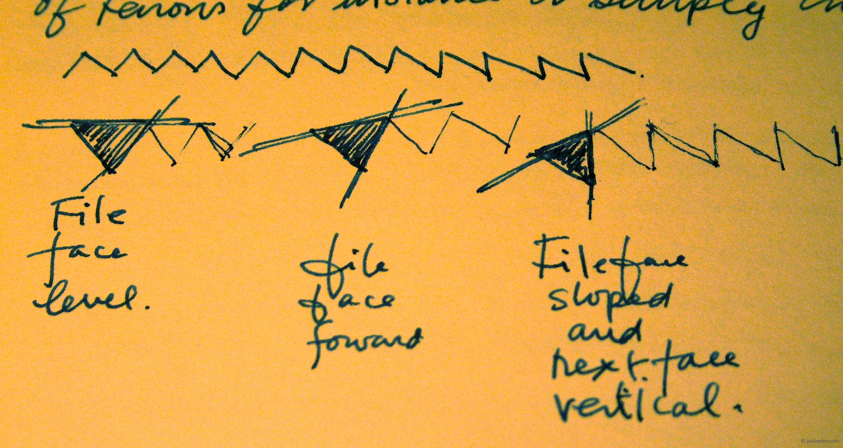 I like progressive tooth shape; that means starting with a passive rake and moving to a perpendicular negative rake. See drawing above. At the toe-end of the saw, for the first 1", I always start with the top of my file level along its length and also across its narrow width from side to side. Then for the next 1" I pitch the top of the file forward (as in the second step shown above) and this increases to a more productive cut. After that, along the remaining length I make the adjacent face of my file perfectly upright and this gives me my aggressive power cut – perfect for dovetail cutting when there is minimal cross-grain cutting. Where the saw may be used for more cross-grain cutting than with dovetails it’s best to make progressive change. The shoulders of tenons, for instance, or simply crosscutting wood to length.