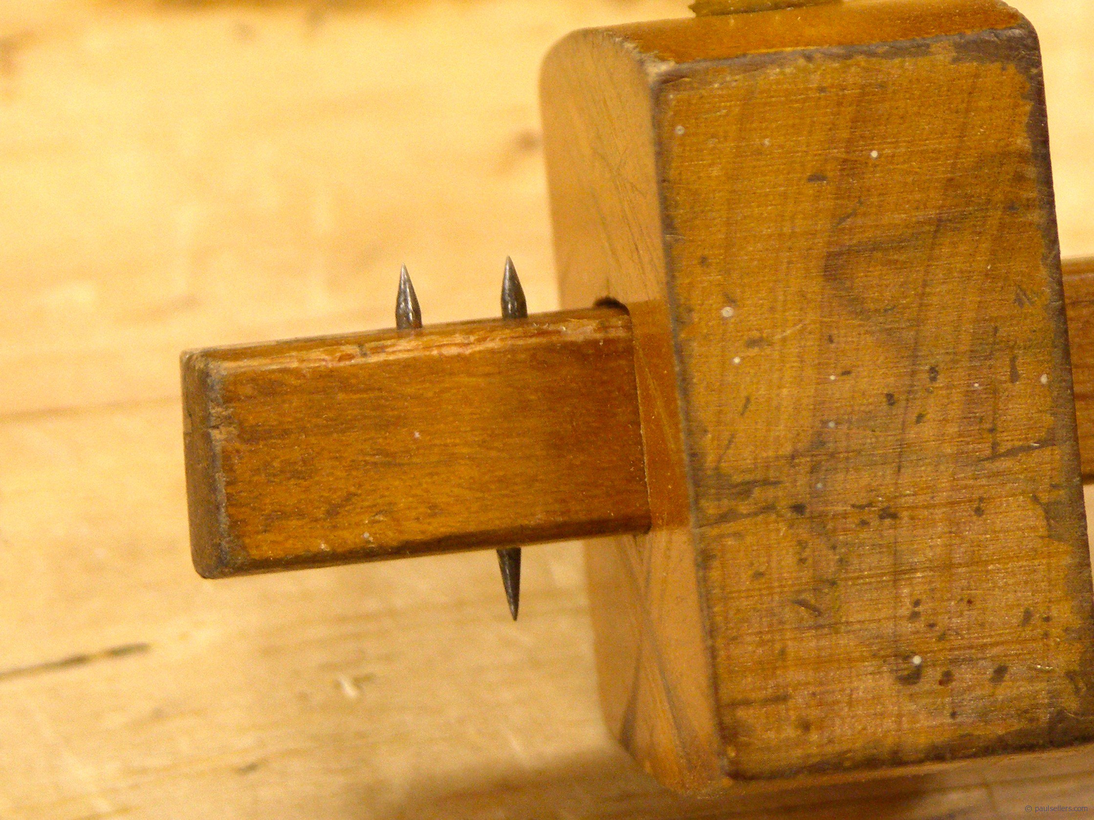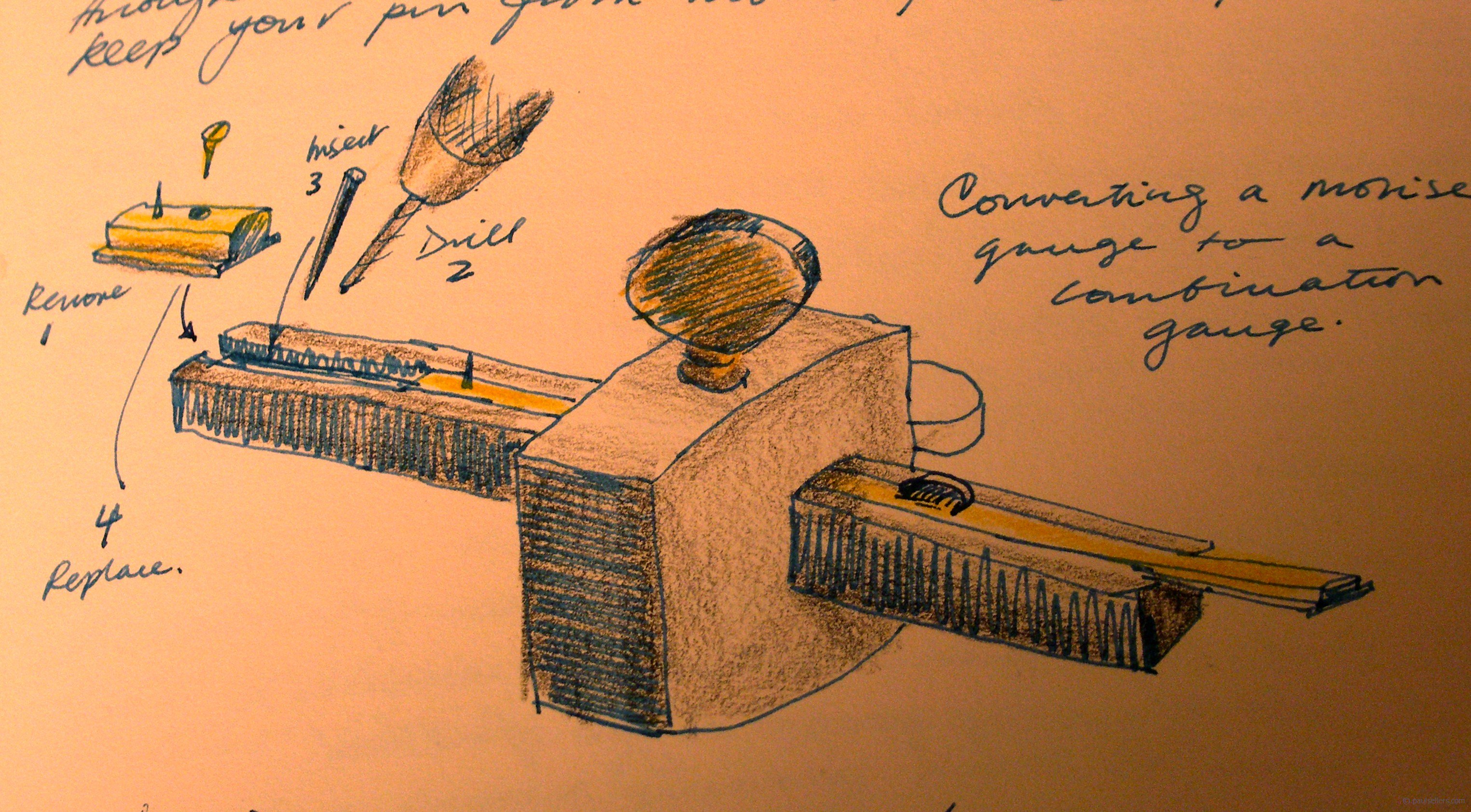 You can also retrofit an existing mortise gauge with an extra pin yourself. Pins are best if they are hardened steel and I have taken the marking pin from engineer combination squares as we don't use them in woodworking and snapped the pin from the pommel to use as a gauge pine. Drill a slightly undersized hole beneath the first part of the mortise gauge by removing the brass slide as shown, drilling the hole, driving the pin and replacing the brass slide. Just that quick and simple. See drawing and follow steps 1, 2, 3 and 4 below: