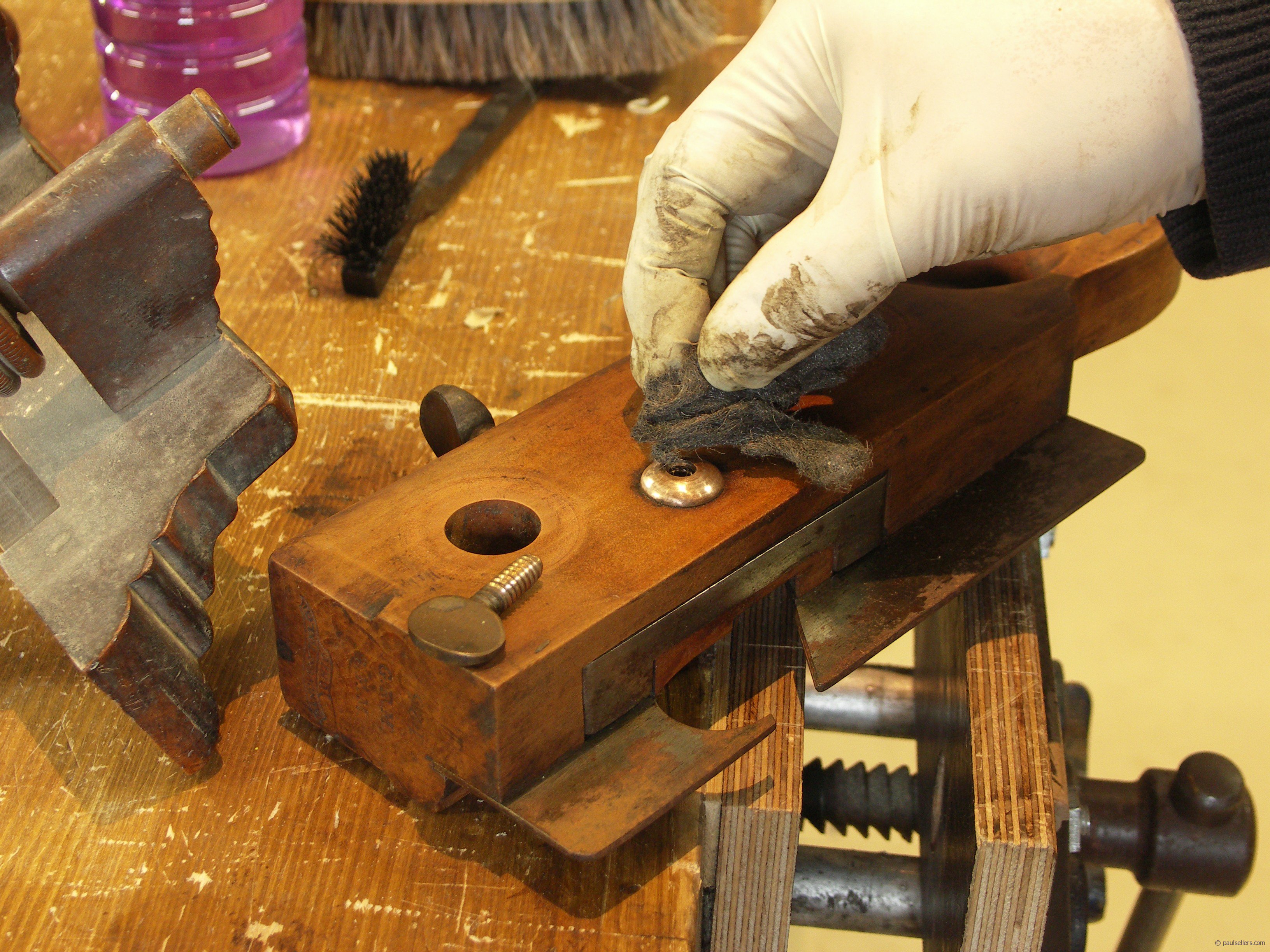 Threads in wood and steel and brass needed cleaning only and a nylon brush and solvent took care of that. My excitement builds as I spin the boxwood nuts onto the wooden threads and with a flick of the thumb the nut travels two inches.