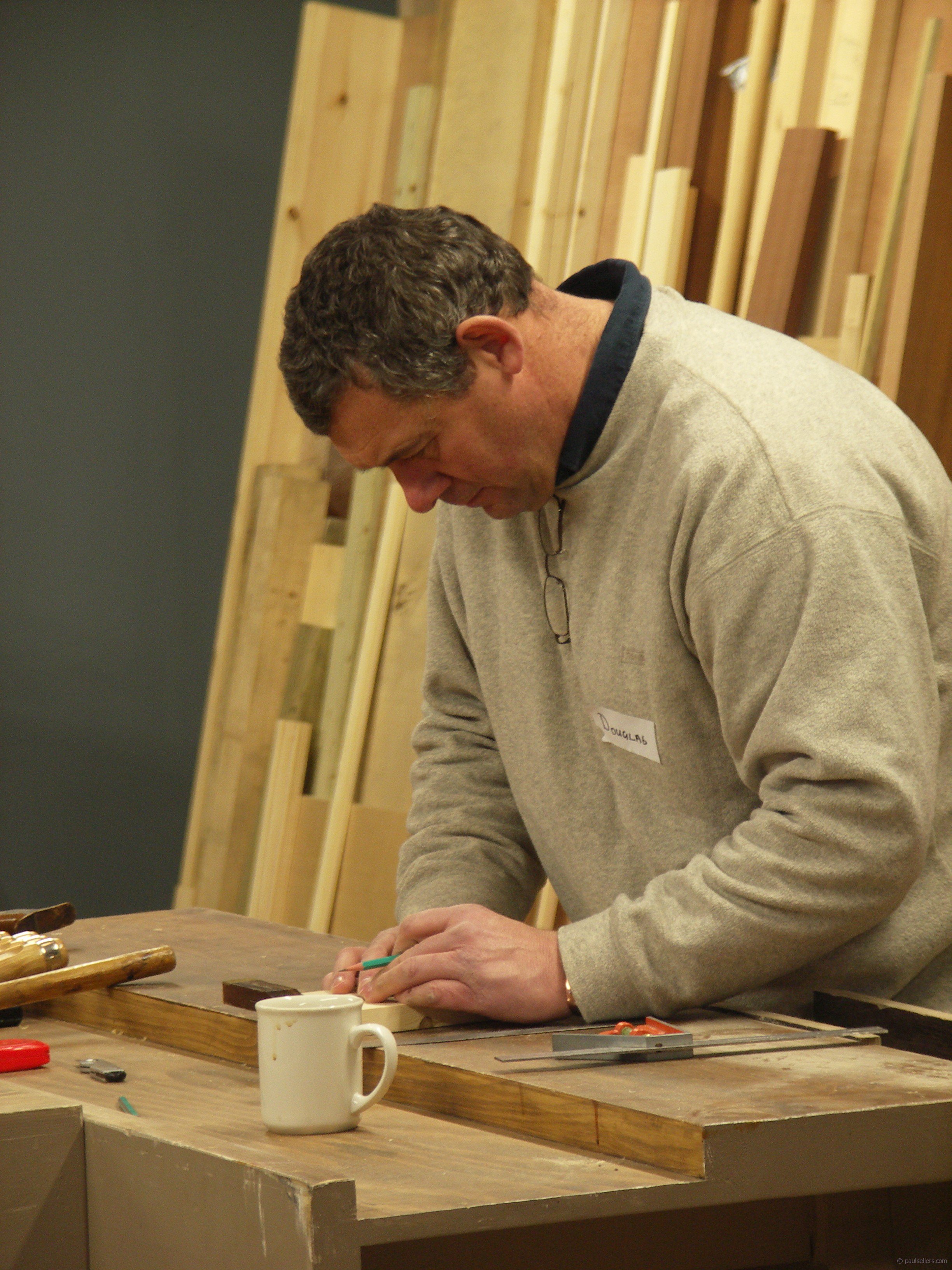 Soon they were back at the bench making their dovetails (some for the first time ever) and what beautiful dovetails they turned out to be. I will post pictures of them tomorrow and you can assess their worth. I could barely fault any one of them during the critique time at the end of class.