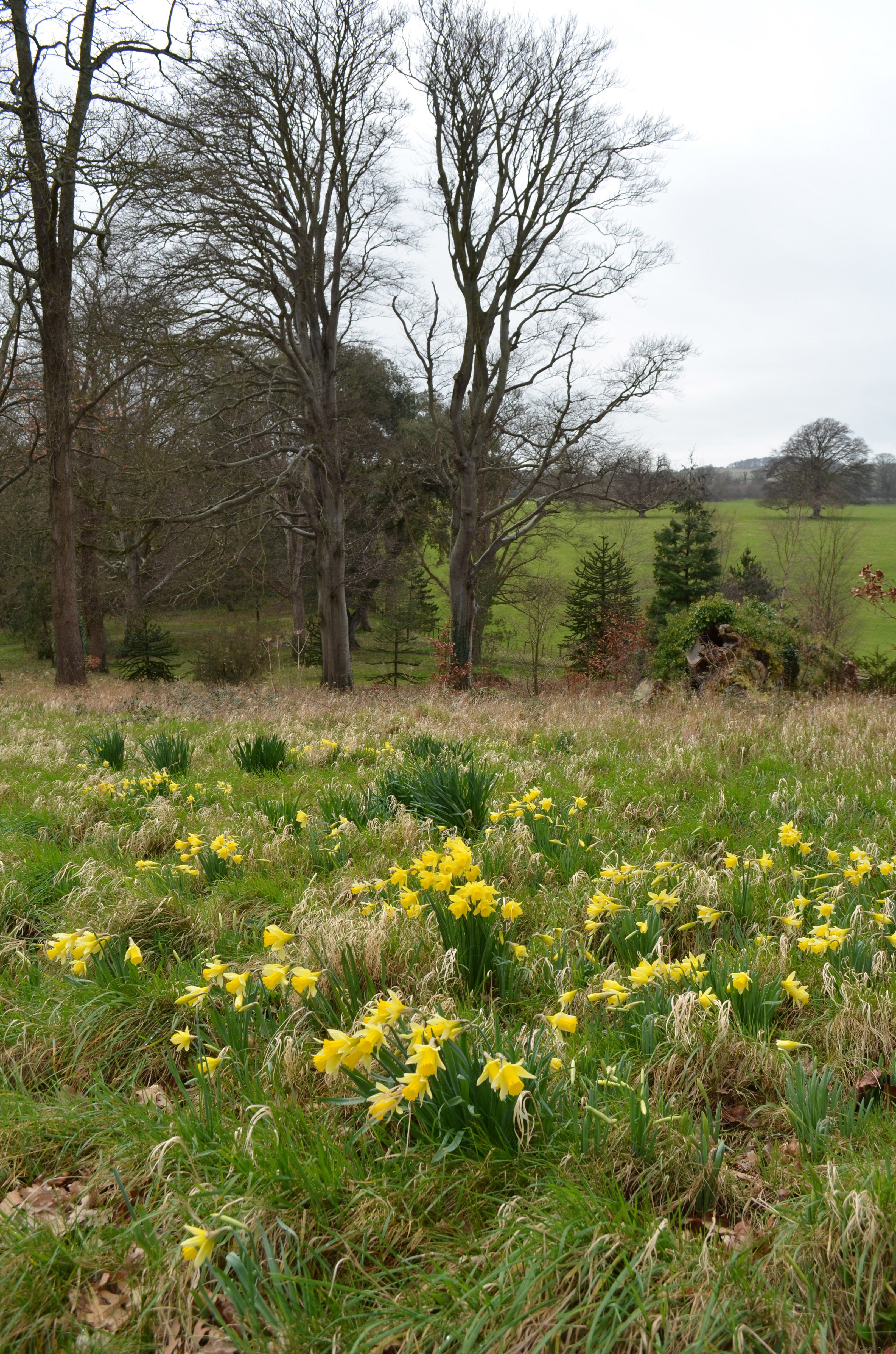I took my noontime walk and a walk in the woods on my way home. The daffodils are beginning to fill the fields and woodlands around Penrhyn Castle. Some land has order and structure.