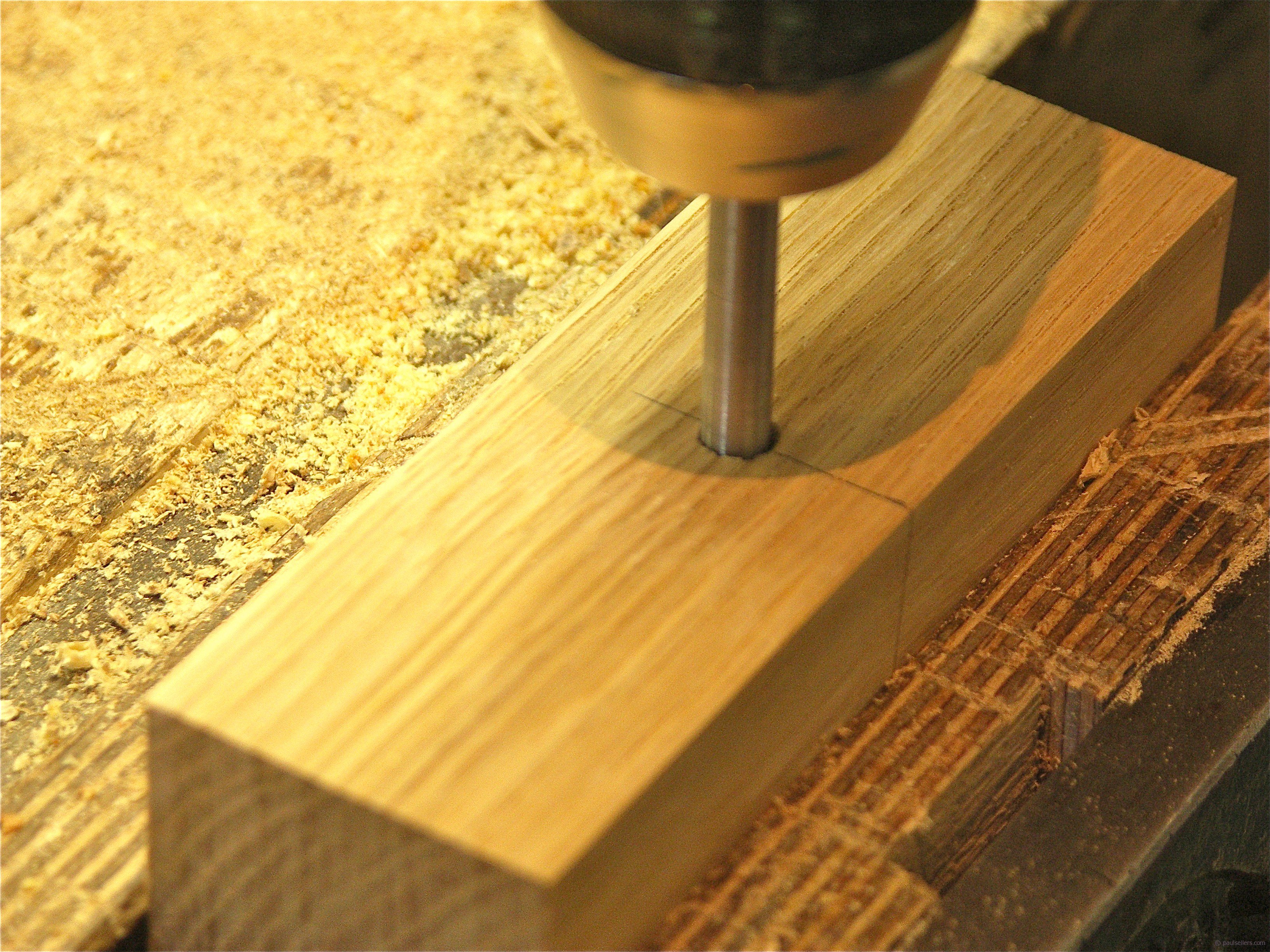 I drilled the second 5/8” diameter overhanging the bottom edge of the blank into the previously drilled 5/8” hole, centres in the ½’ remaining material beneath the vertical hole.