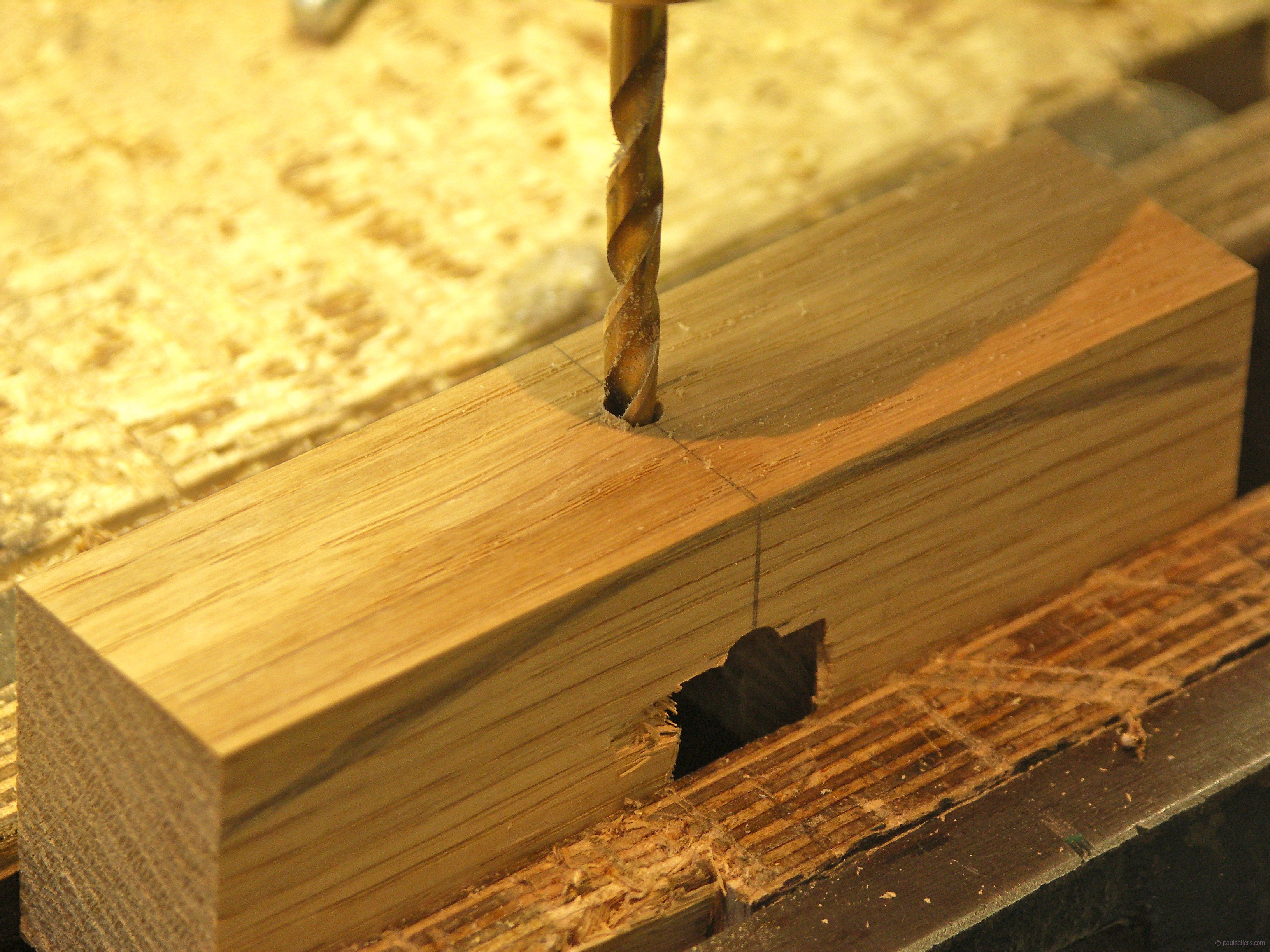 The second hole, 5/8” diameter, overlaps the opposite edge and is centred 1 3/8” from the same long edge as the ¼” hole. This 5/8” hole is more a sight hole and leads to a second 5/8” hole yet to be drilled to form an escapement for shavings and easy clearance. Stop the drill ½” from the bottom edge.