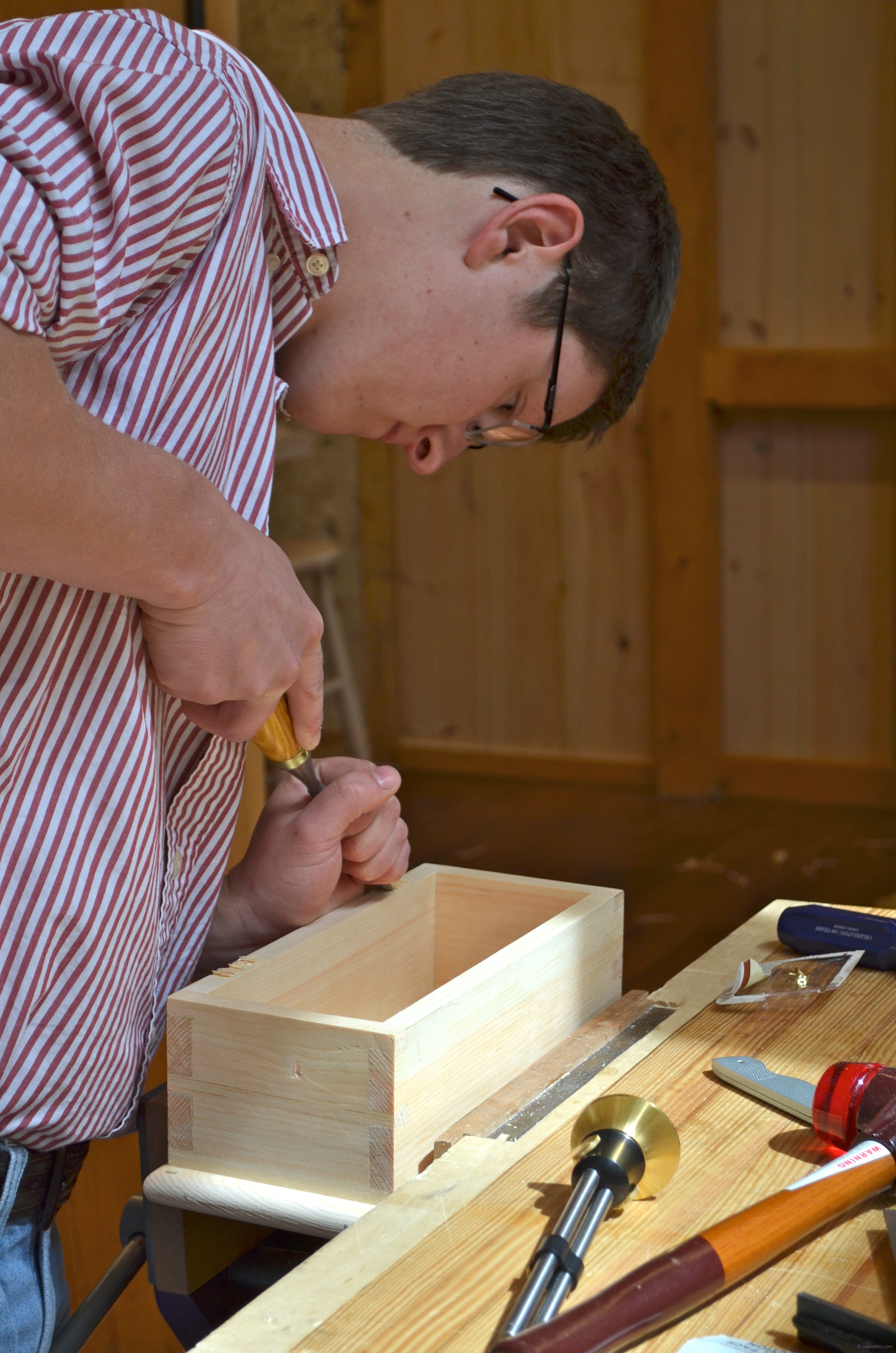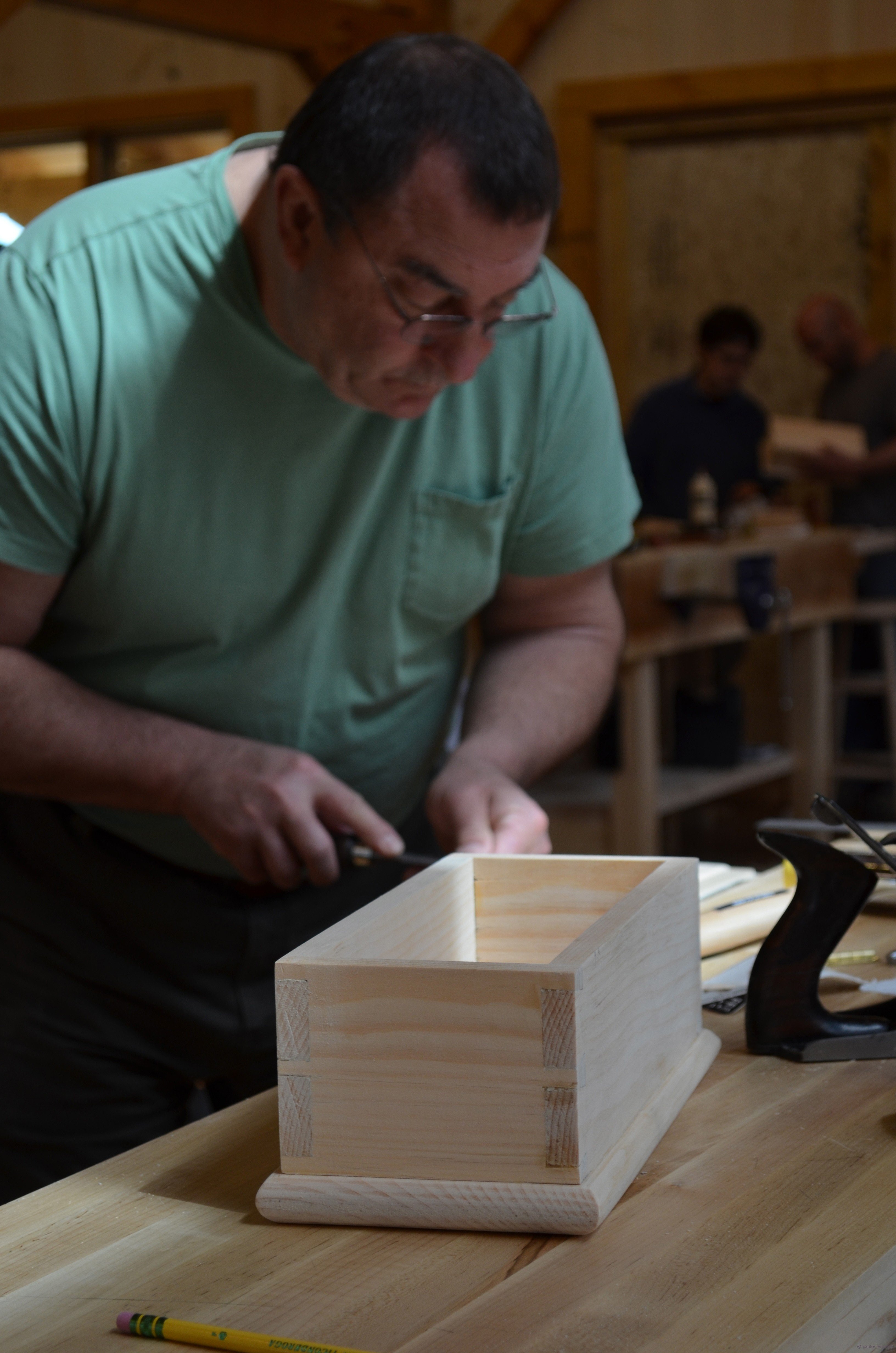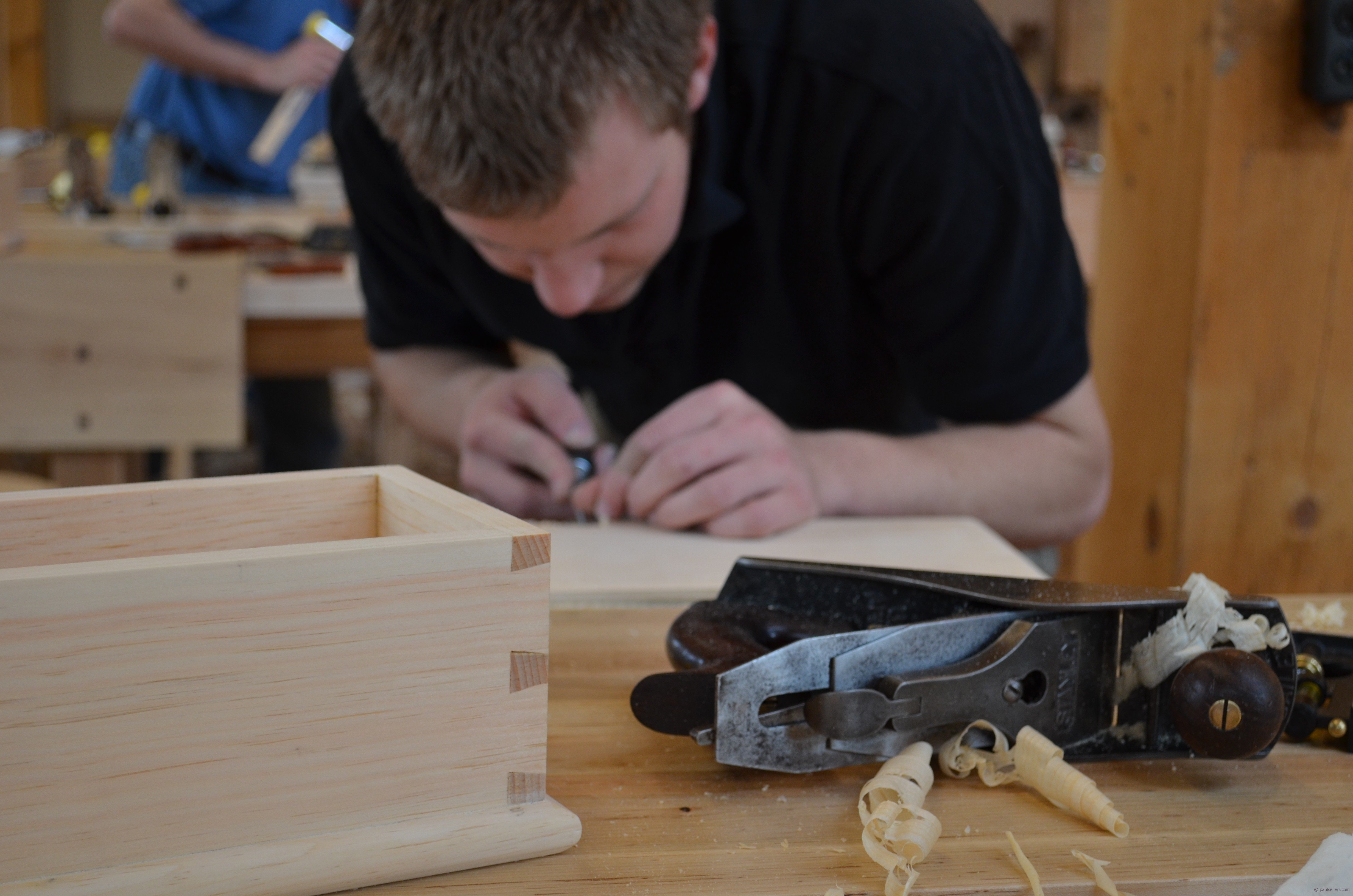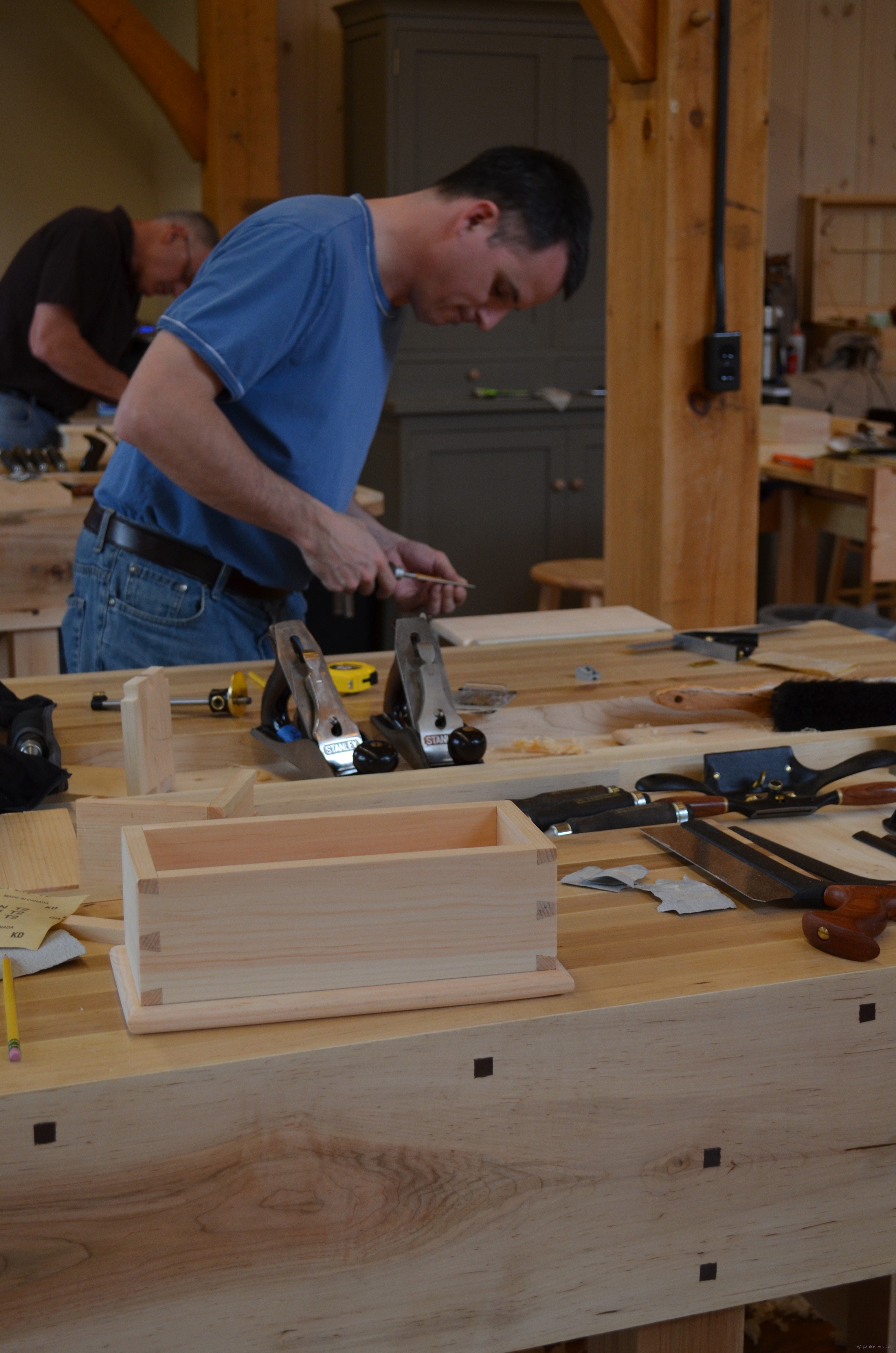 As you can see, the box dovetails really came together well and the intenseness of learning is dynamic. Please remember that most of these students have never cut dovetails before they made this box so these are their very first dovetails. I try to imagine what a class filled with routers and dovetail guides looks like or sounds like and realise it must be a nightmare so I dismiss the thought. I have made at least 120,000 woodworking joints in my lifetime of working wood, most of them by hand. I have never once used a router to make a dovetail joint. I have seen it done and it must be one of the most boring things I ever saw. I have never lost interest in making a dovetailed box and a few years ago I stopped counting when I realised that I had personally trained over 3,500 woodworkers to make this joint. It has never grown old. Now that people are following my course online and through my book and DVDs I will never know exactly how many I will have reached.