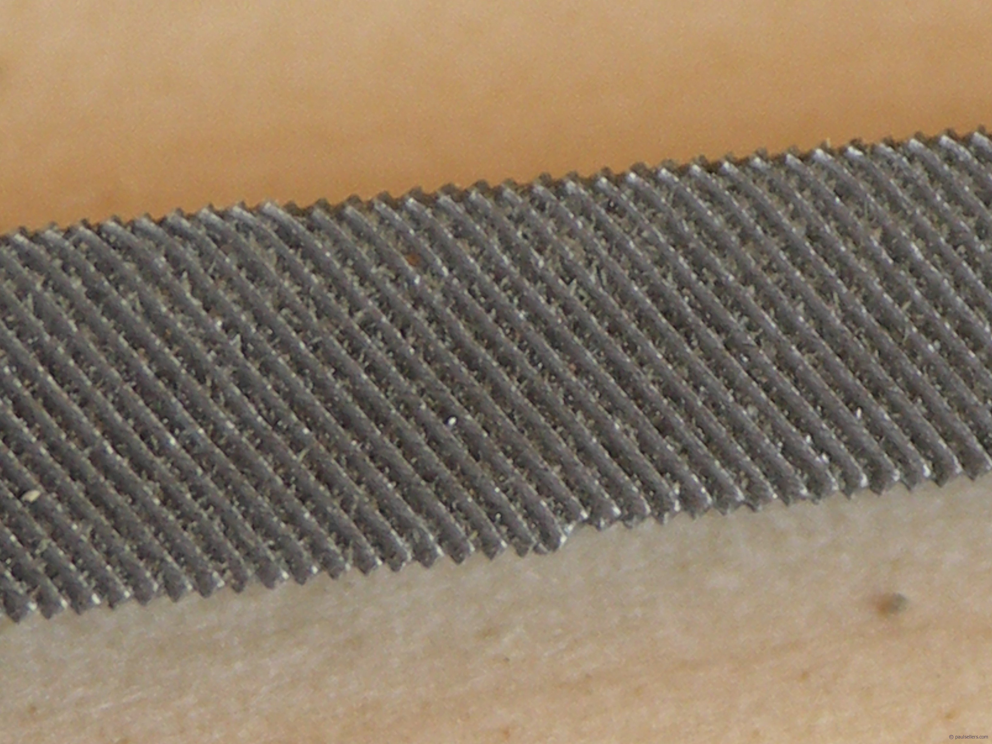 Tom recently bought a saw, which I will post on later. It was a brand new saw made by the famous and now infamous Two Cherries Company of German engineering fame and sold by another famous brand name of Robert Larson Inc. These two companies get the absolute accolade for producing, distributing and selling the absolute and very worst of worst saws in the world, ever. Now Tom drives to The Home Depot to buy a saw file, which we now see from my previous post cost three times as much because it does one-third the work. He drives home and sets to to sharpen his saw, but finds that the saw file keeps “tripping up” as he progresses each stroke. He doesn’t give up. He’s used to filing saws and knows what he is doing. Perseverance, it’s said, produces endurance so he keeps trying with the same failure. Examining the saw file he discovers he has a very stepped version never seen before in a Nicholson file. The file is another product now made in Mexico for or by Nicholson. There is of course no way that the file will or can work because of the stepping.