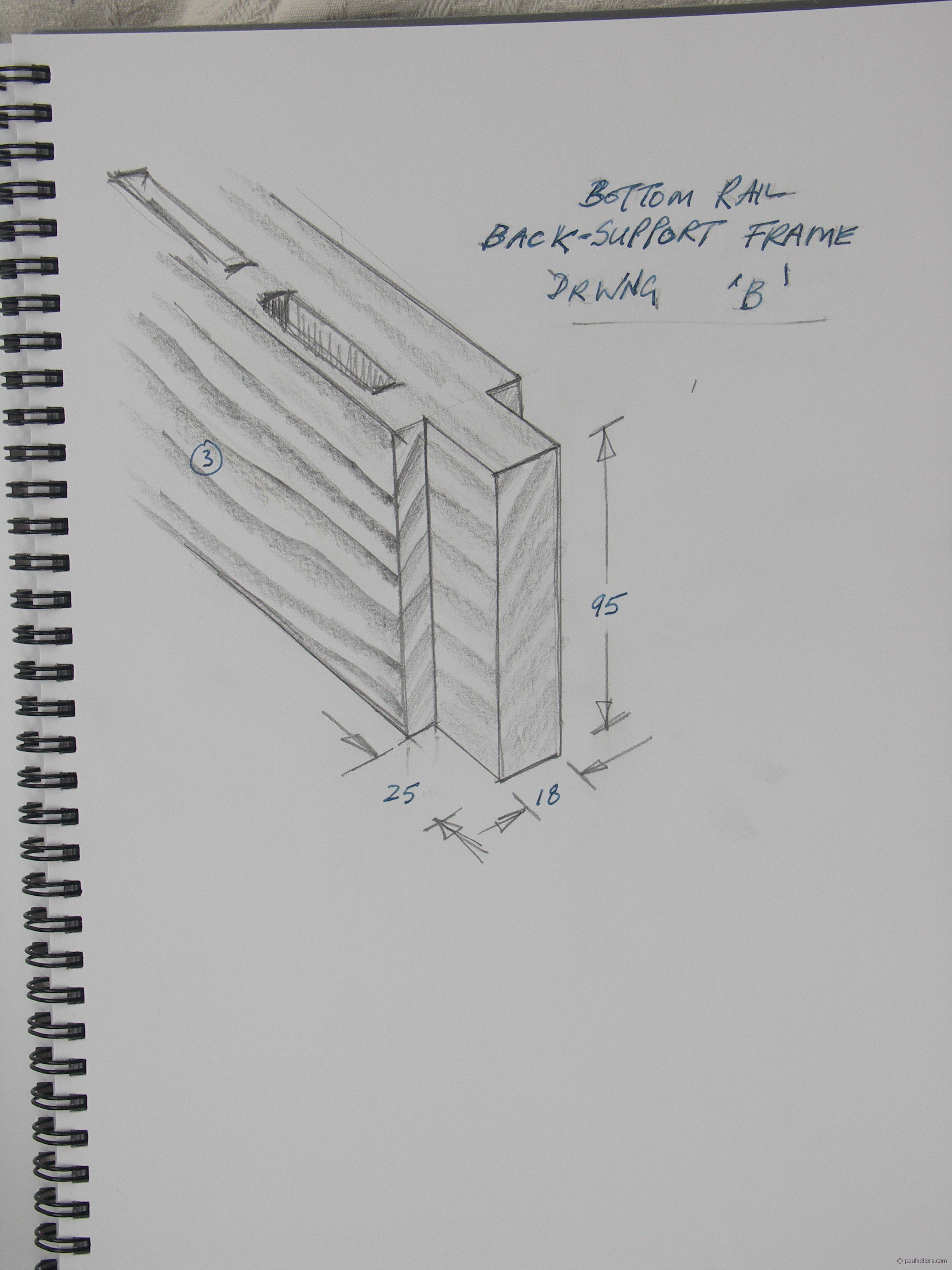 Yesterday my work went well, though a little slower than I had hoped. Building cupboards like this, it’s worth making certain that accuracy prevails with every turn—fitting doors and drawers to nonparallel, twisted openings can be done but doubles the time it takes to fit and hang them. All three of my main cabinets are together and ready for shelves, doors and drawers to be fitted and installed. I already have all of the doors made. Another advantage working to plan has is being able to create component parts, sections and such to the project without having the actual cabinet physically made. I usually begin with a rough sketch-drawing in my journal that represents the sort of proportion I am looking for that then goes on to detailing overall sizes, component sizes and on down, considering what I will keep in a particular place. It’s in my sketches that I look for proportion and shape, but though I have measurements to record details there too, my actual drawings become full size drawings on a sheet of ply, hardboard or MDF board This is my staff or storyboard. That way I can constantly reference every minute detail to dead size and so ensure accuracy throughout every stage of development. Creating one-of-a-kind pieces as I do for most of my work seldom needs a drawing beyond this board or my sketchbook. Without drawings, especially a storyboard I am lost. An even greater benefit to employing a storyboard is that when working with others on the same project it provides a one-source reference point for all to follow. Any mistakes or changes can be identified and recorded here too.