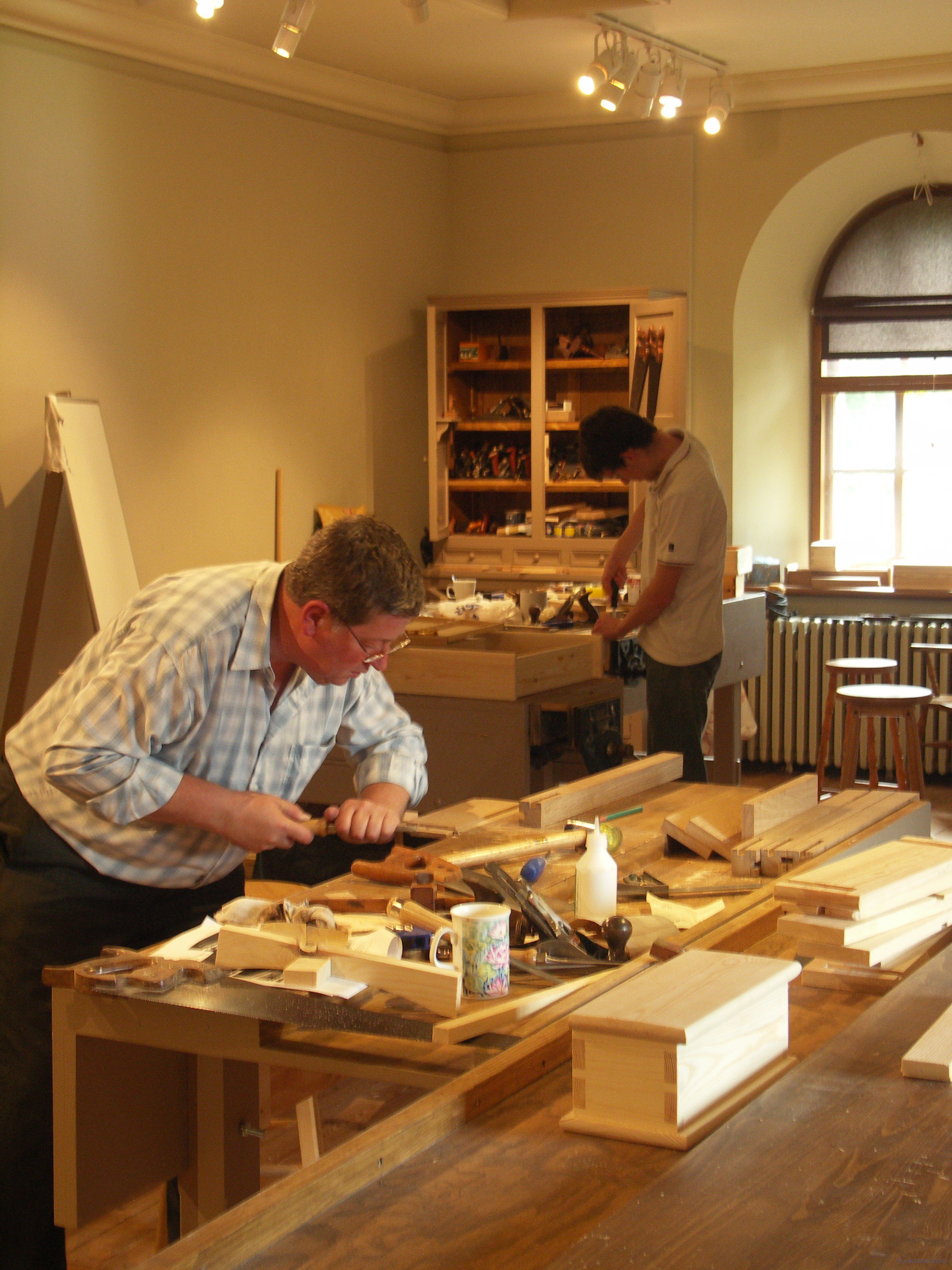 It’s at this point where I subdivide the word workspace differently and shove the separation to work’s pace and not only work+space. My creative workspace must be economically valid so that my pace is unhampered by excess distances between the bench, the work and the equipment I need, or, conversely, insufficient room. As a right-hand dominant person my vise is placed to the left hand corner of my workbench and my in-use tools on the bench to my right or slightly off centre, favouring my right as I face the bench with the vise in front of me. I have my complement of other closely associated tools in chests and cupboards behind and to my left slightly; my left hand pulls the drawers and my right retrieves the tool I need from the compartments. This has been my preference for two decades and I rarely stray from placing my chest and cupboards this way. When I am teaching I have my tool cupboards behind me so that students can gather closely in around my bench. When students are gone, I may shift my bench so that, my tools are to my left completely and I have an open space behind me for the workpiece to grow into as I build. Otherwise I must always go around my bench to get to the piece I am building. Machinists need no such arrangement generally as all of the components they build come from fixed machines arranged again efficiently to their movements between machines. It’s a production of parts developed for final assembly on an assembly bench.