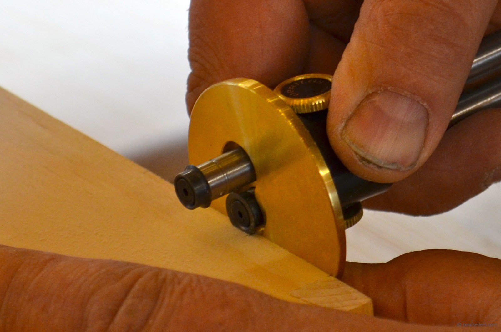 The thing I liked the most about the Veritas gauge and its hinge-recessing capability that sets it’s apart from conventional gauge (except for the slitting or cutting gauge) is its definitive thin cut. Prior to this gauge it was standard to use the conventional marking gauge lightly to delineate the cutline for subsequent cuts with the chisel. In soft woods-grained woods this lead fibre compression either side of the pointed edge that became wider the more the gauge was pressed or the wood itself yielded to the point. Herein lies the problem, especially with students new to woodworking, removing the waste wood took away half of the bruising but left half that showed as a slight gap between the edge of the hinge and the recess wall. Using the Veritas gauge gives the most perfectly crisp and clean cut lines along hinge recesses I have ever seen. Exactly what my students want.
