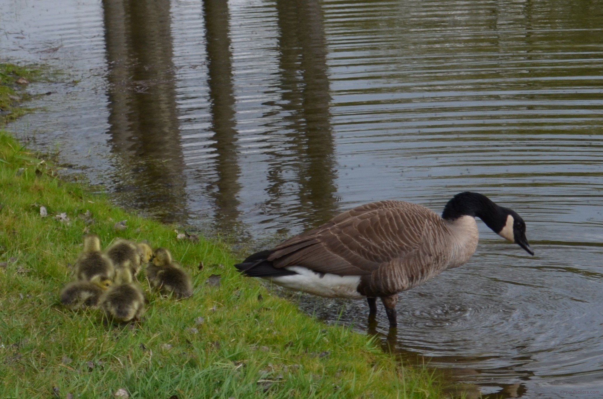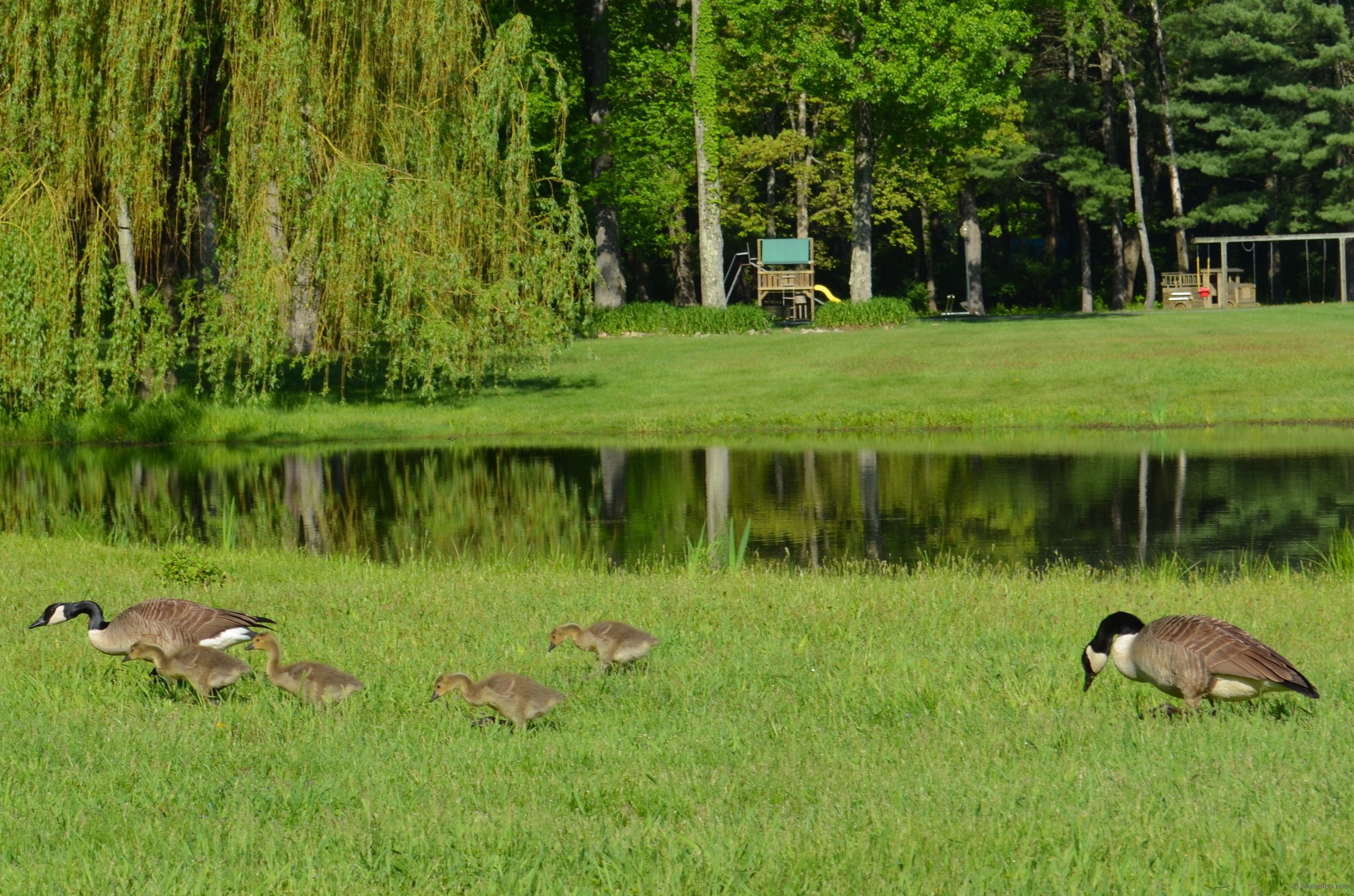 Some will remember a month ago when I posted on newly hatched Canadian geese over by the pond. These are before and after pictures a month apart, but two families.