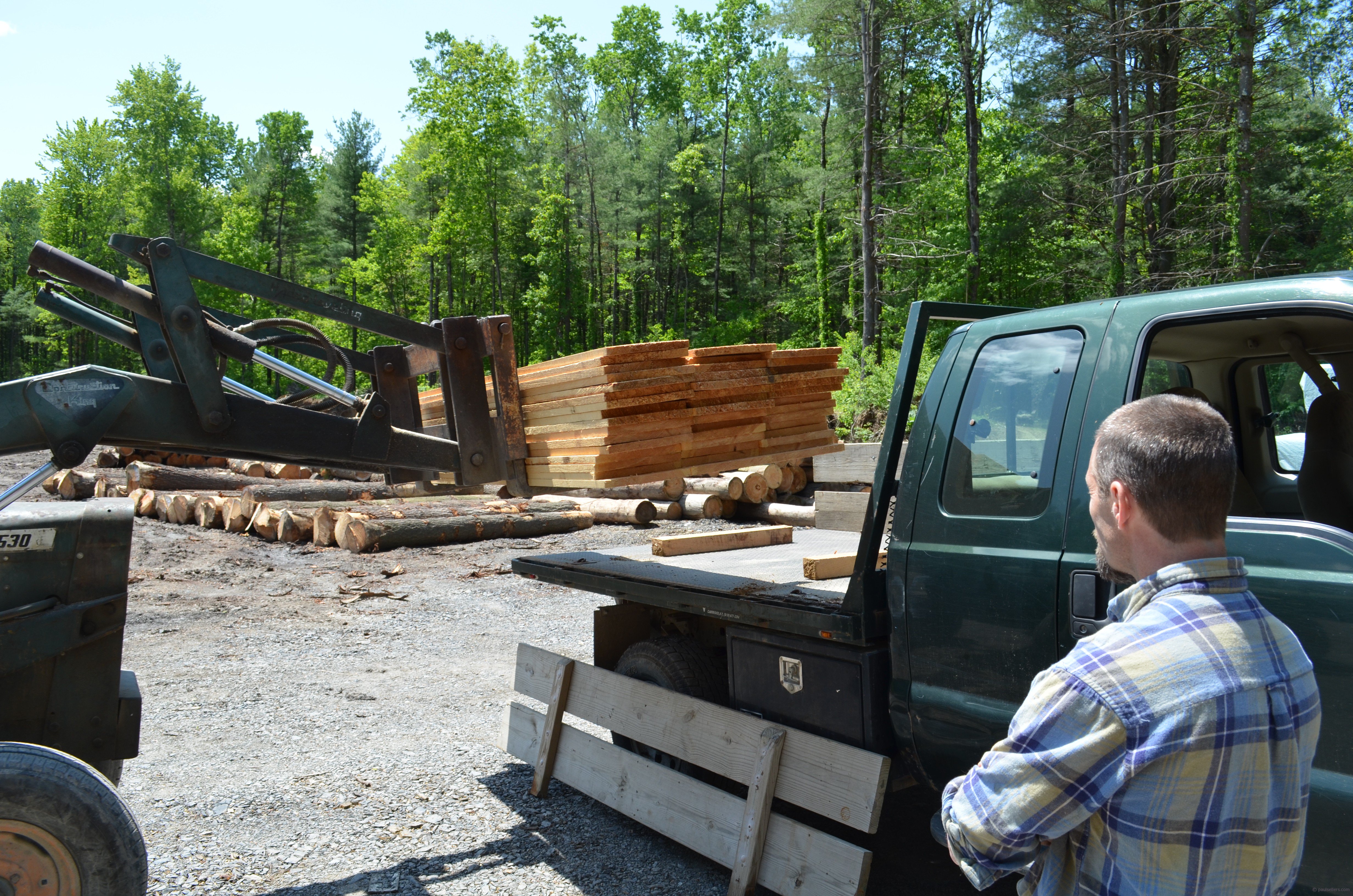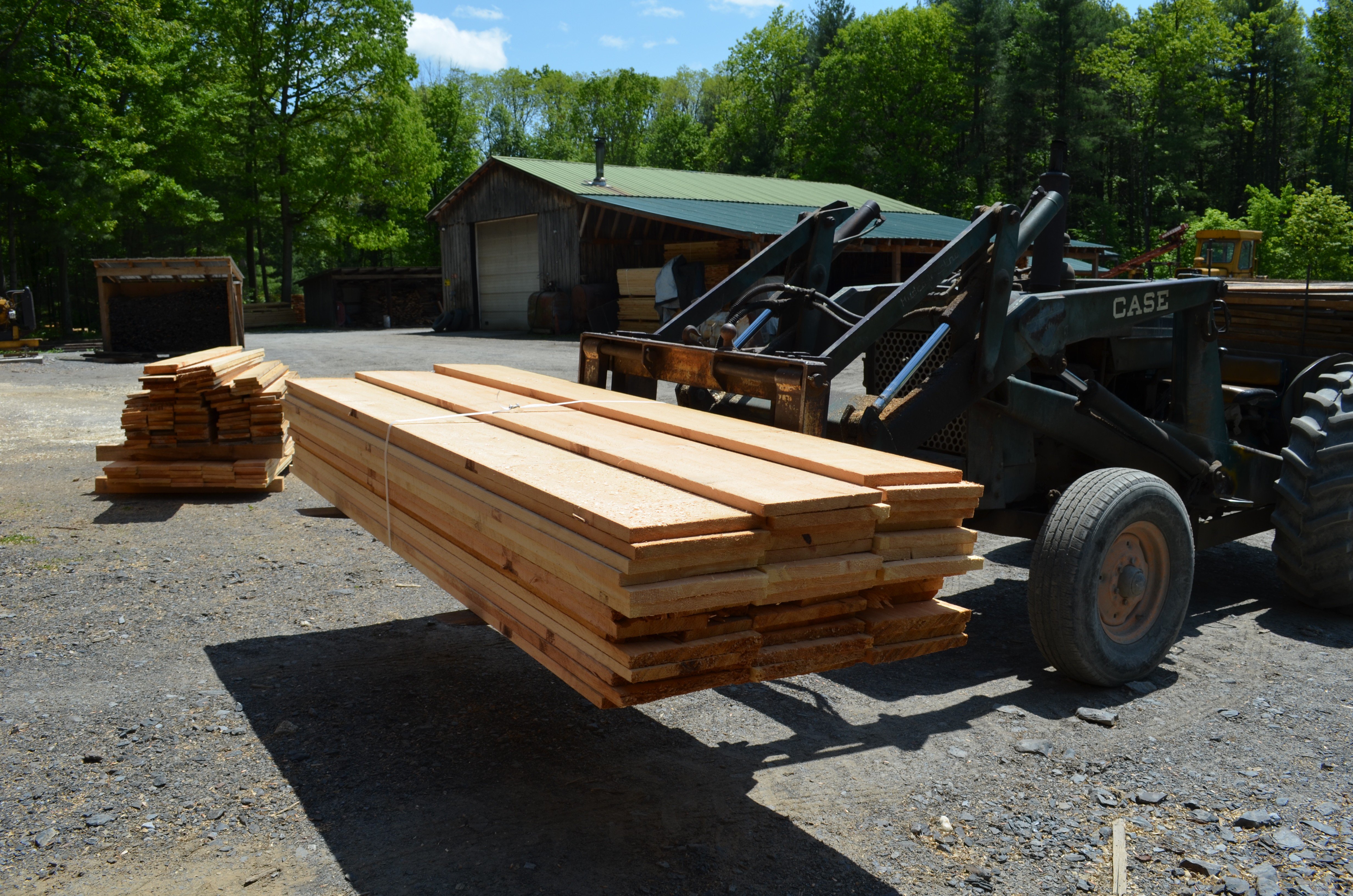 Barney Drumm supplies our wood from sawn logs he rolls onto his mill for slabbing. He makes beams too, and we used these and will continue to use them on the remarkable timber-framed buildings we make. This week we were looking for some fairly clear stock and this is what we bought from Barney. The quality is ten time the quality of The Home Depot and Lowes and the price is about a third or so less. Same too with Lowes.