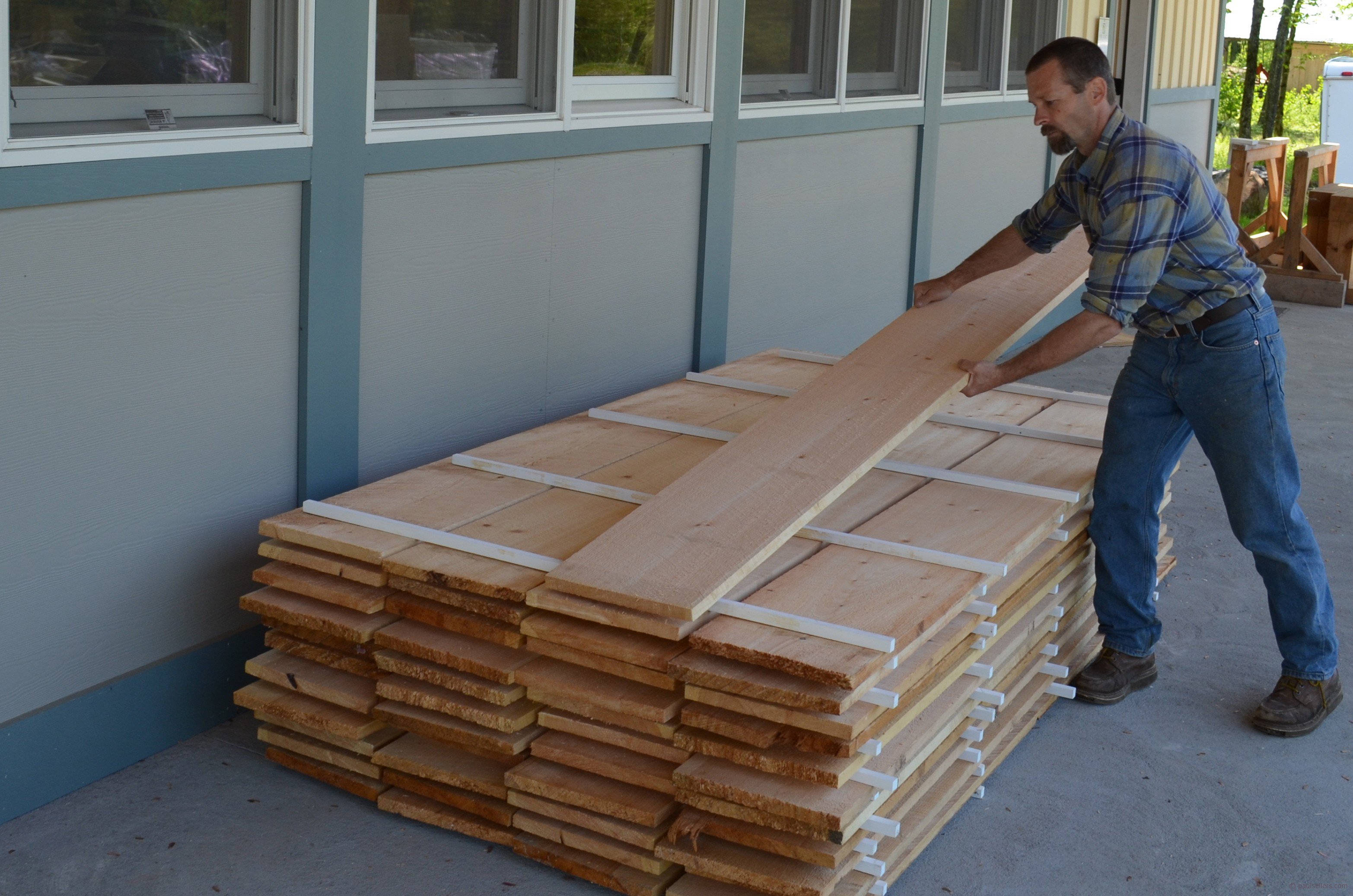Behind the scenes of the Real Woodworking Campaign and New Legacy are men working wood from raw logs into flat boards resawn with massive tungsten-tipped teeth. The wood is stickered inside the kiln and thus dried so that moisture inside the wood is even and then it remains stickered to acclimate and release the heat from the kiln. Mark and I picked our wood carefully and took it back to the workshop where we stickered it once more. Tomorrow it will be needed for the Foundational II workshop.