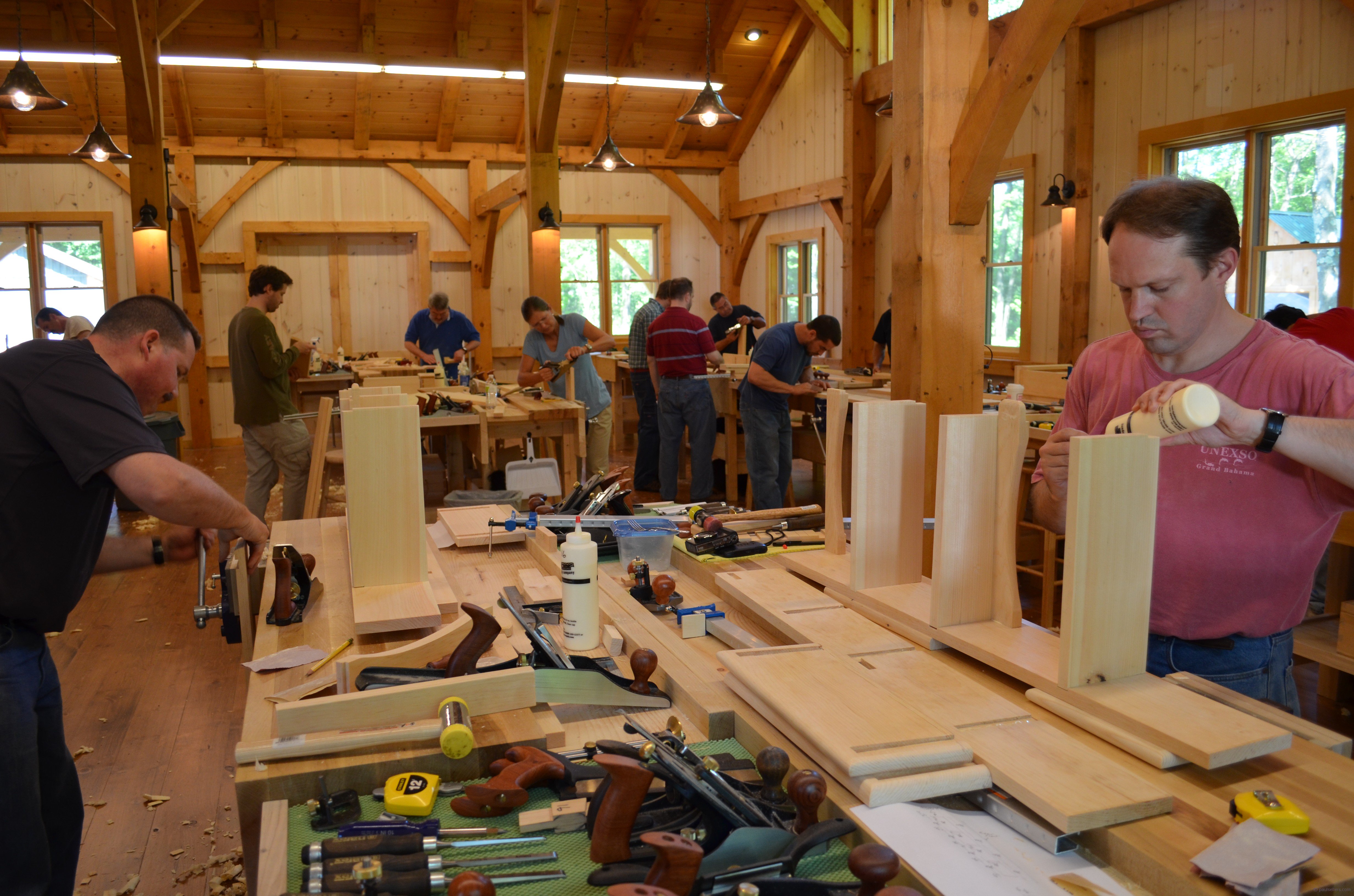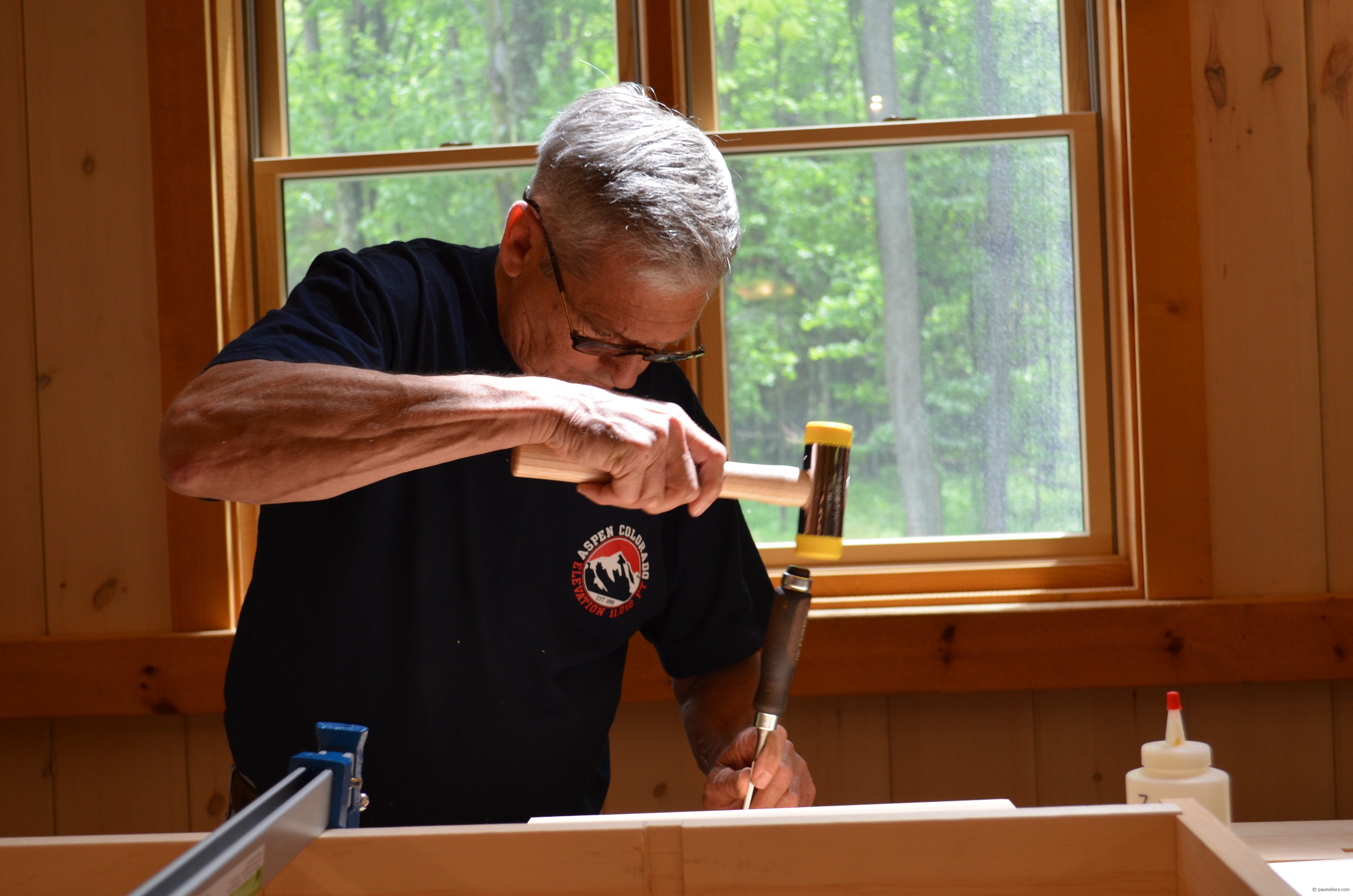 Table legs in oak are now mortised on most benches and the aprons are being worked with new tenons. We turn no machines on and everyone is content to see their work and the work of others around them come from a few pieces of red oak. One person’s blow out is another’s check from doing the same. They learn from me, one another and get revelation for themselves as they go. Their work is saleable and would be acknowledged as well made in most circles. I check them periodically but now they are developing real woodworking skills that will last a lifetime. The tools at last are doing what they want them to do. Saws cut, planes shave, shape and smooth and soon tenons will fit well their mortise holes. With the Foundational course completed they all qualify for more advanced workshops. Many will soon be making their Craftsman-style rocking chair.