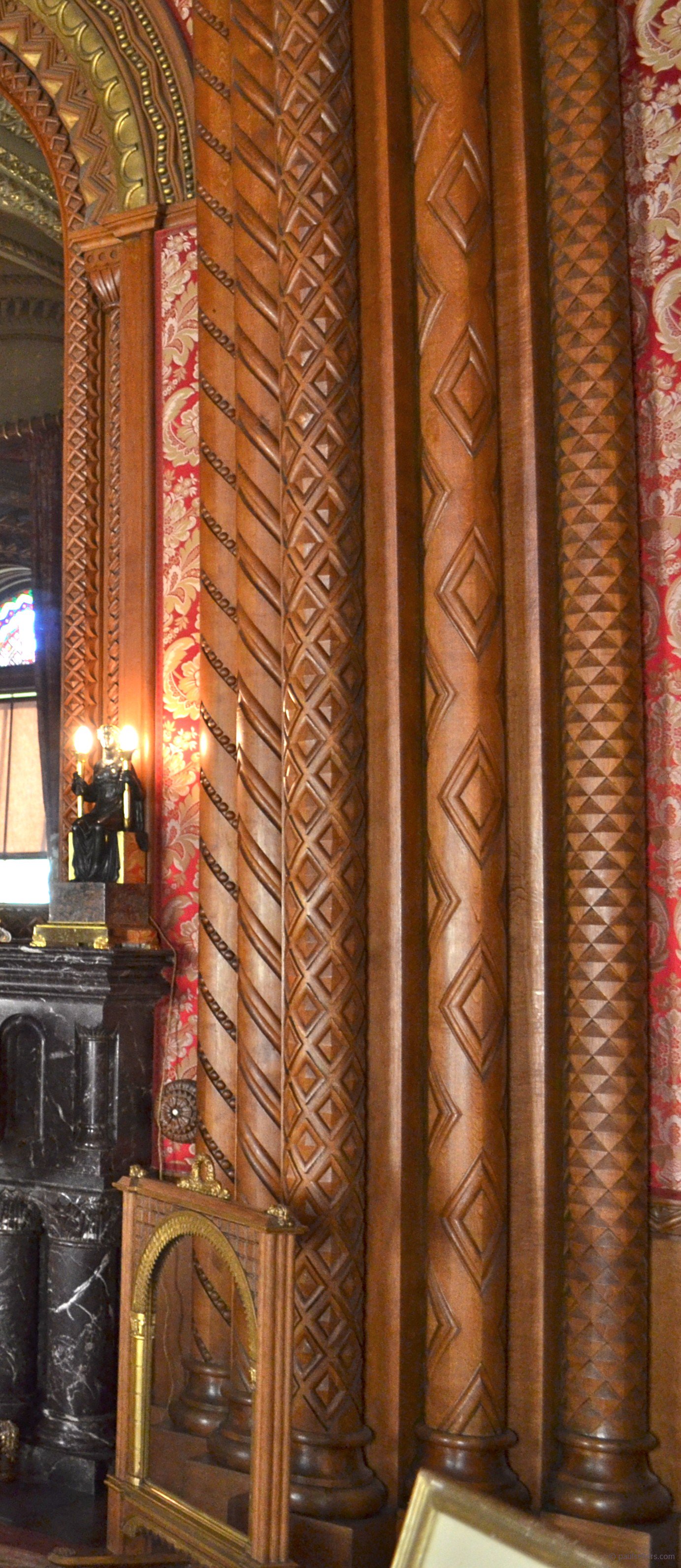 Now what of these oak columns either side of the fireplace that reach 18’ high, projecting through classical transitions into the extremely ornate plaster-ceiling work? United by 45-degree spiral cut carving, the columns are uniquely individual in design even though side by side and beautifully hand formed using only gouge and chisel work. I thought this such innovation for its day and, though perhaps striven for by others, seldom have I seen such harmony attained. Furthermore, try to imagine what it took to worked oak into such clean-cut hand work. We will see more of Hopper’s use of this style variance created in solid stone in a later Penrhyn Castle section where we look at some stonework carved by hand over a ten year span.