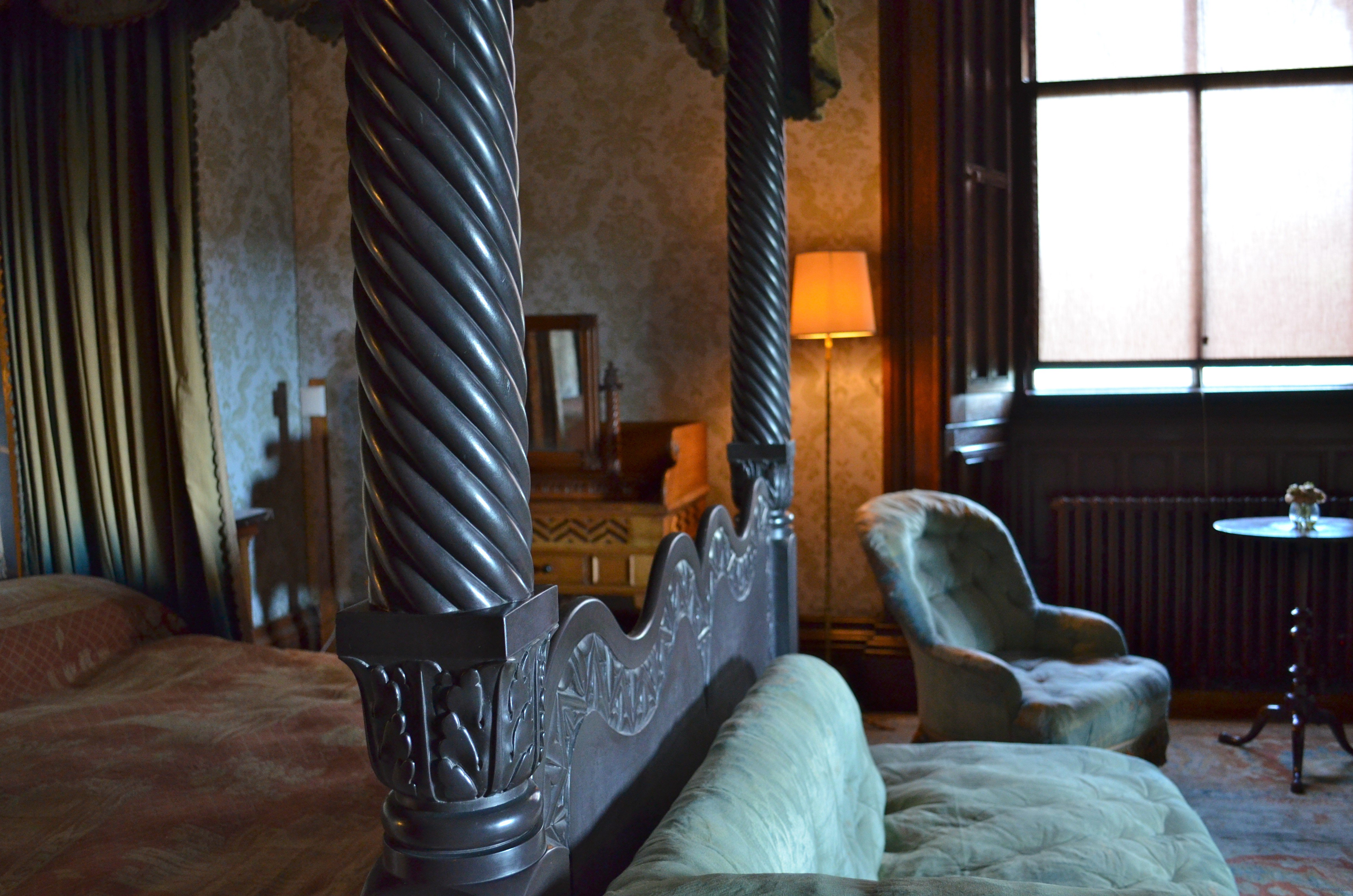 This bedroom is classic for Royalty and the nobility of the era. Nothing was too grand, expensive or considered wasteful if you could lure a queen to sleep in your house. The whole castle was built for just such a thing (such is the dynamic that affects us when we want to be accepted) and at the then cost of 150, 000 (450,000,000) for building such a creation. But it’s the workmanship I pursue in this and not the inequality of the haves and the have-nots. Hopper worked indefatigably to complete this room with just such royalty in mind. Though ending in disappointment, the bed, carved from solid slate, was a unique work of creative design and craftsmanship. Specifically designed and made for the then queen to sleep in, fear prevented her in that she felt in imminent danger with such weight looming at such lofty heights during her sleep.
