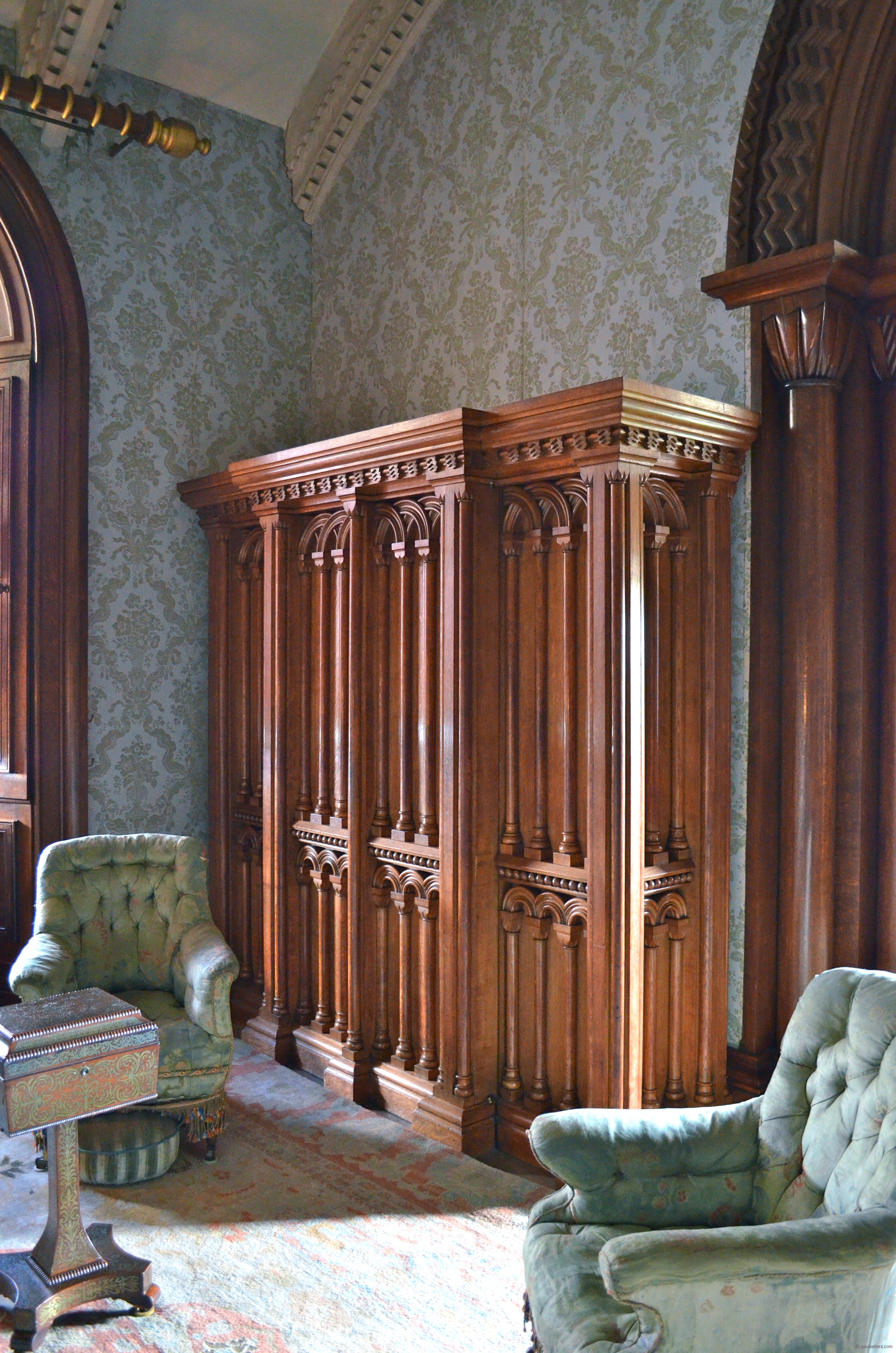 Notice again the overall design repeated from the bedside table with columns and arches. I question the final location of this piece as I noticed the cornice return runs past the wall against which it stands. Perhaps there was some modification for practical reasons.